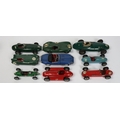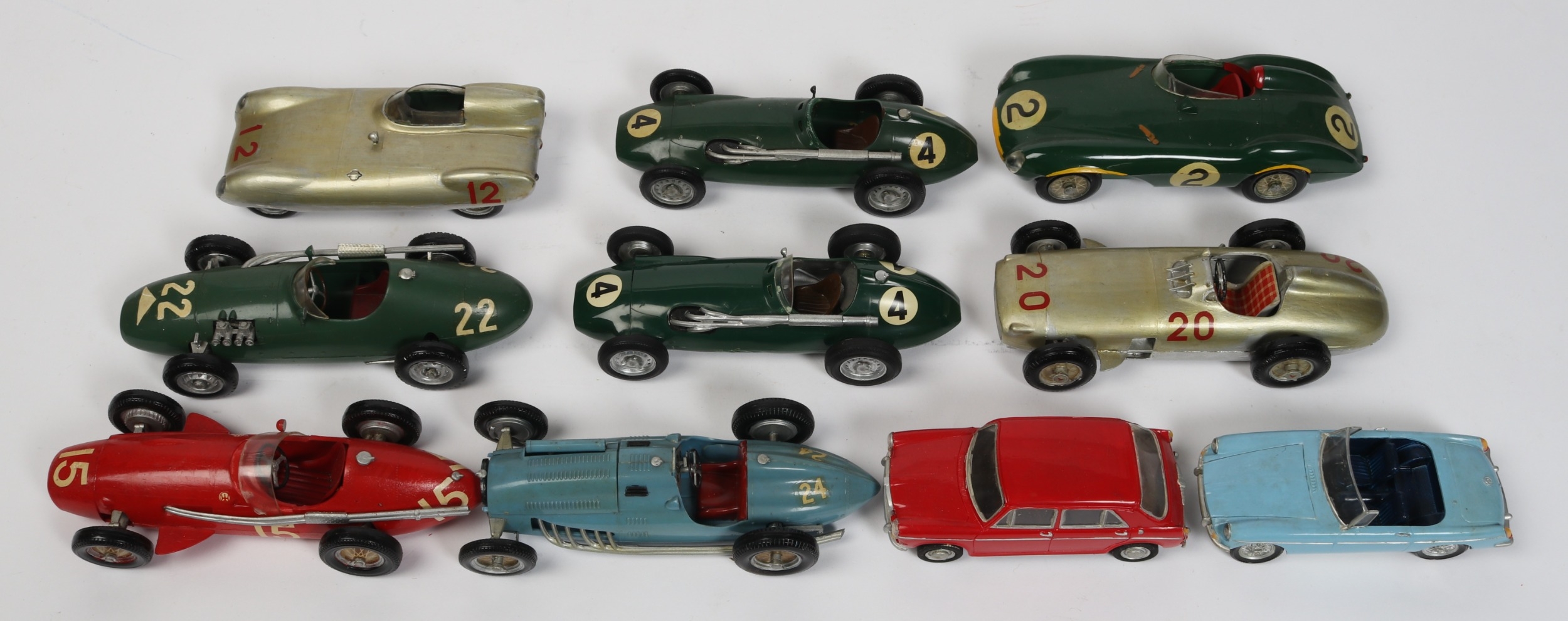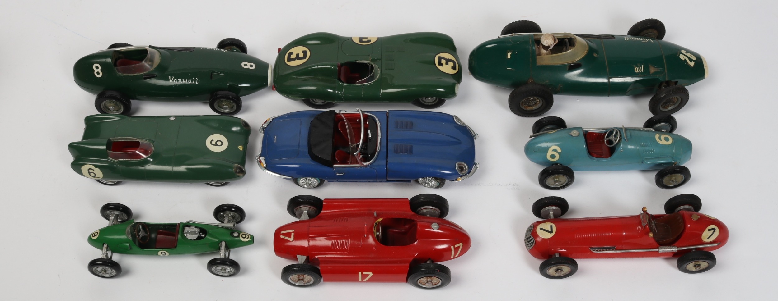 16 Built and nicely painted Racing car model kits by MERIT, includes an E-Type Jaguar, Vanwall, Ferrari, Mercedes, D-Type Jaguar and others, Also includes A MERIT racing car for slot racing, and a Tri-ang MO12 battery operated Vanwall, (untested). Some parts might be missing or damaged. GC £40-60