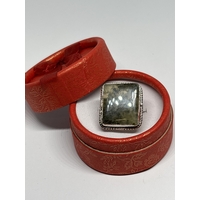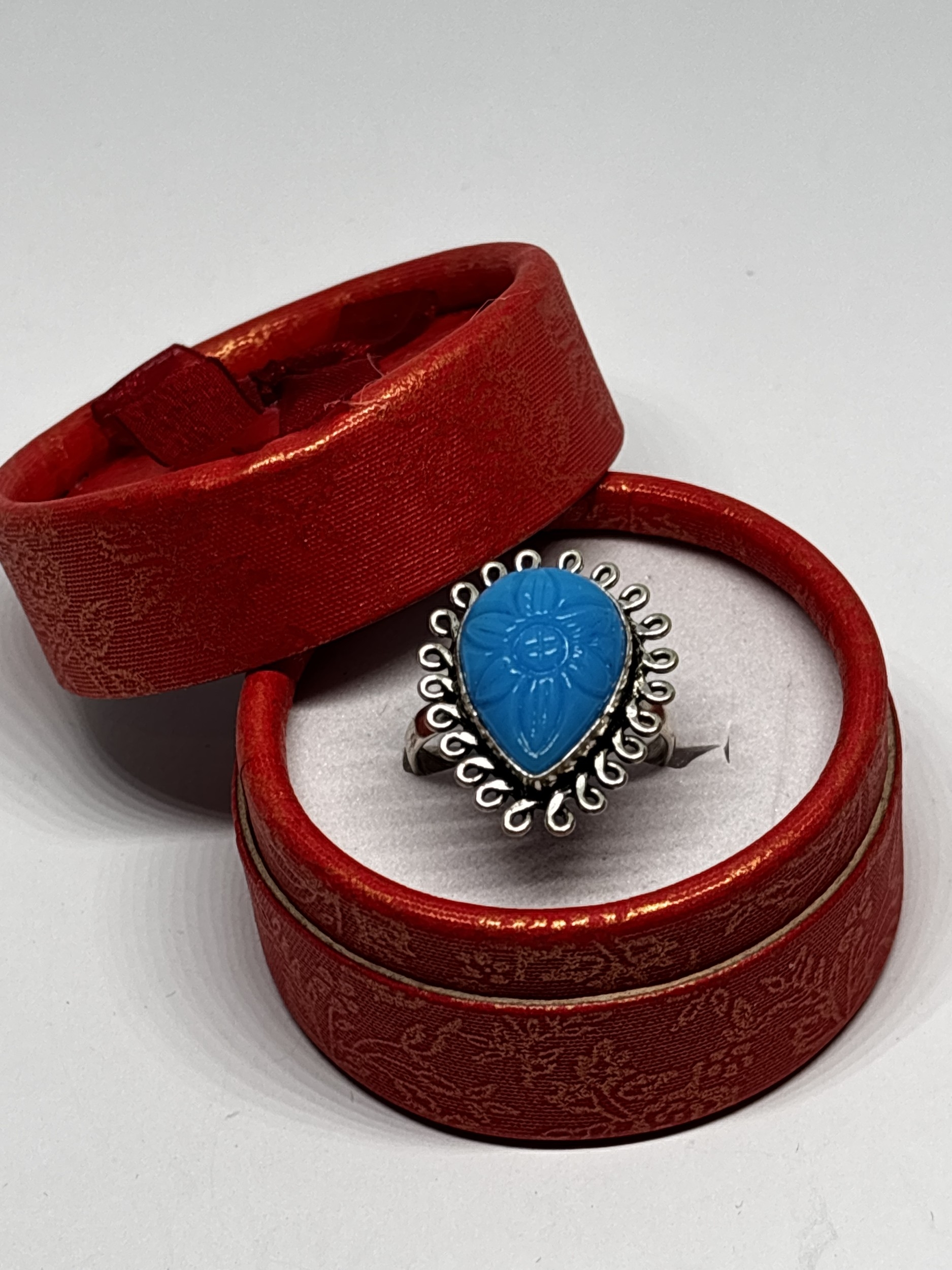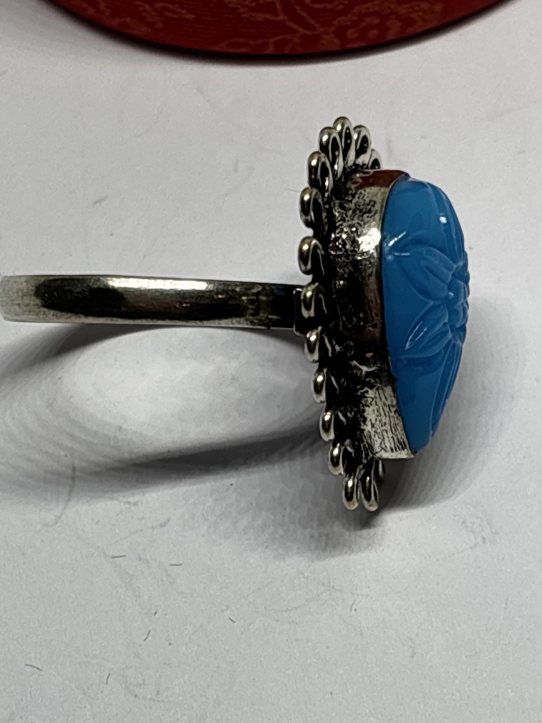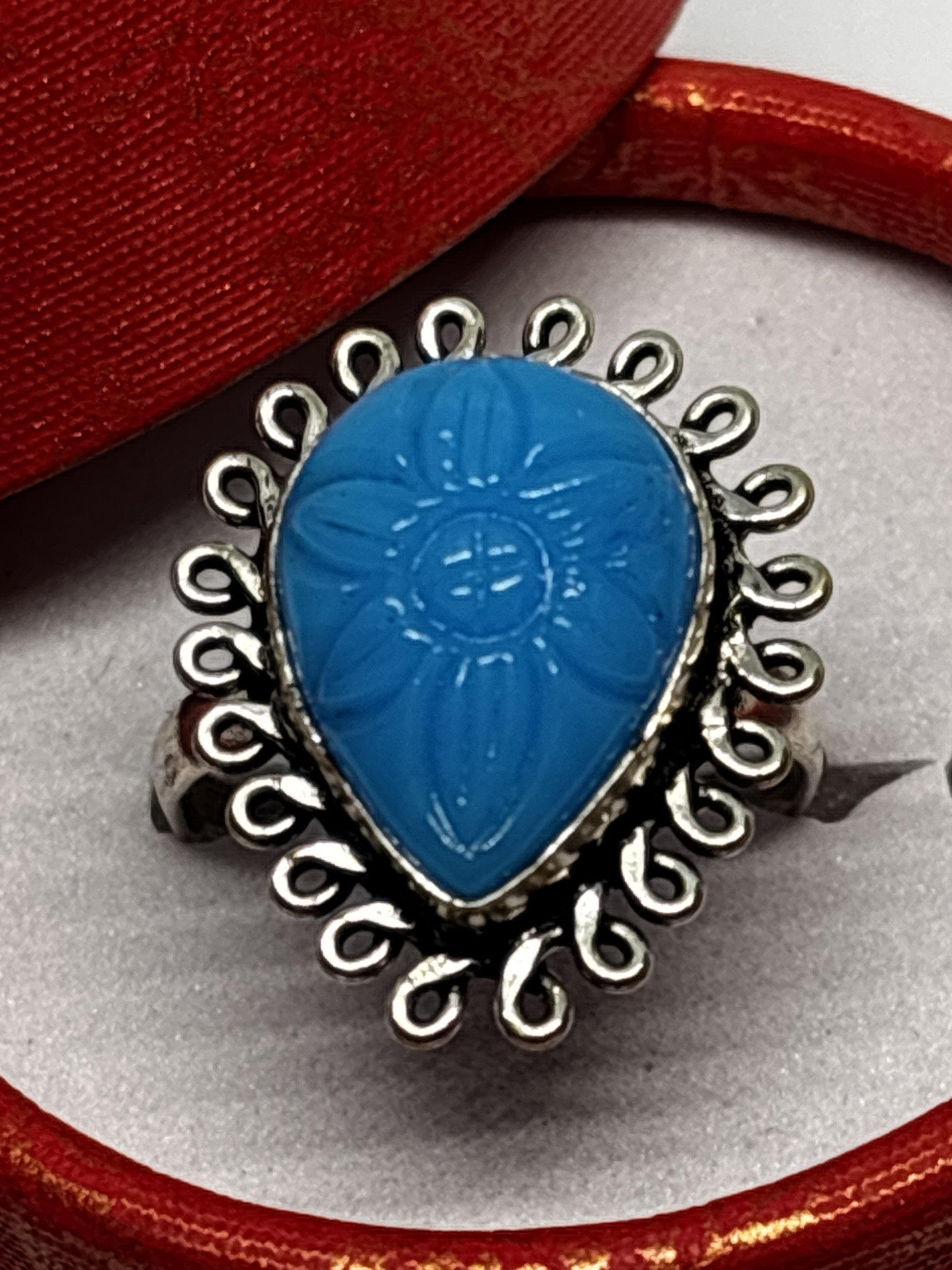 A MARKED 925 CARVED BLUE RING SIZE S IN A PRESENTATION BOX