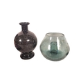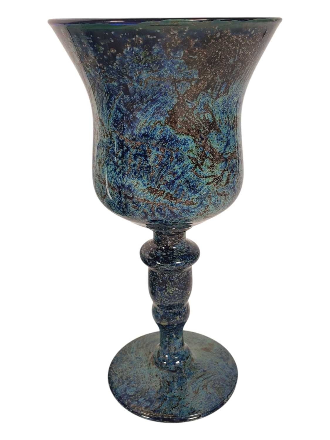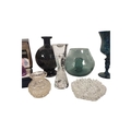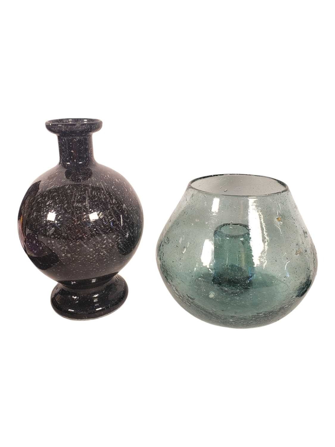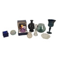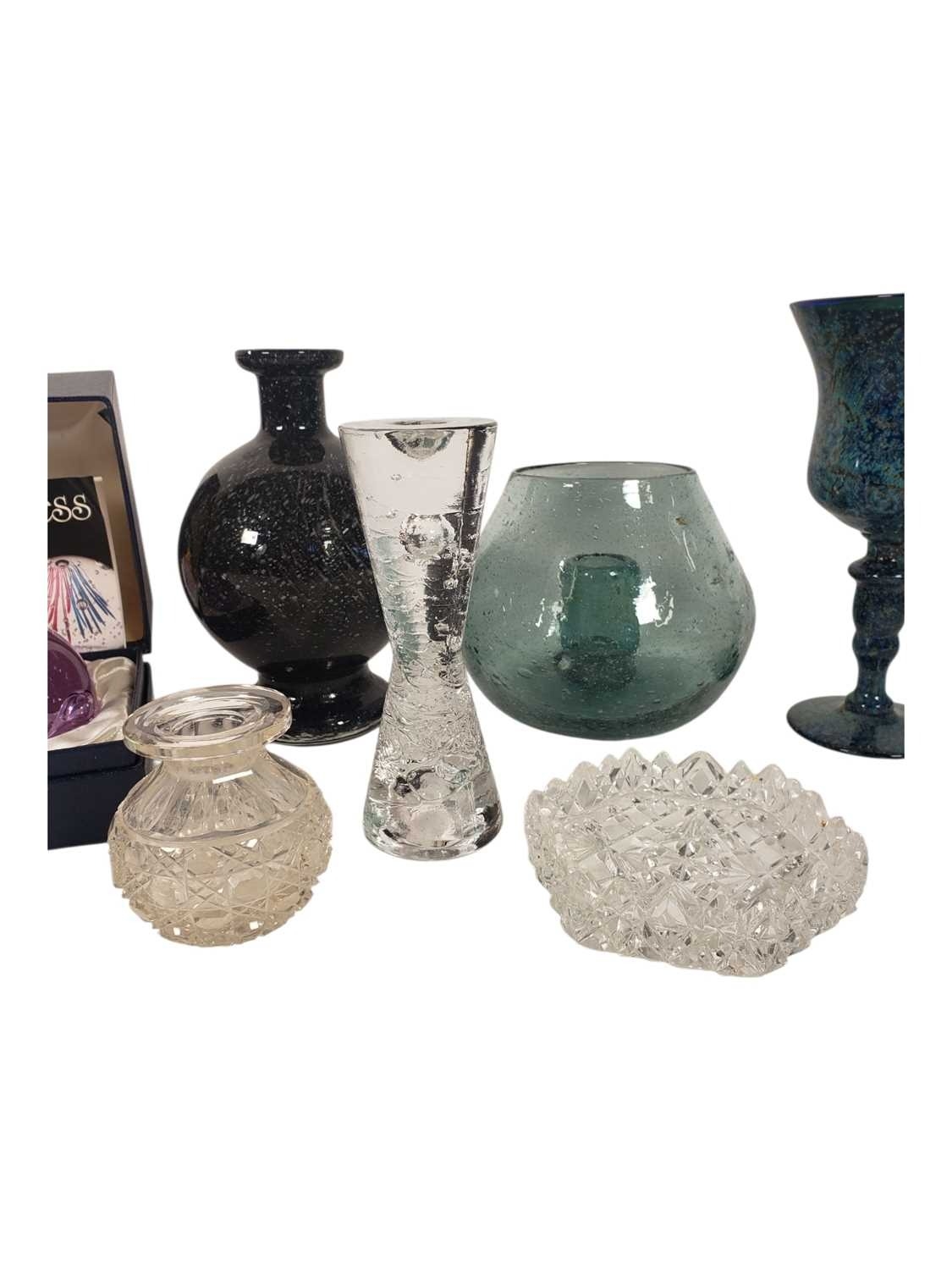 Studio Art Glass - A collection of vintage 20th centruy studio art glass, including Caithness Paperweight in box, Finnish Iittala Arkipelago hour glass vase, large bulbous vase with candle holder, globular stem bud vase, mottled blue goblet vase and some cut glass examples.