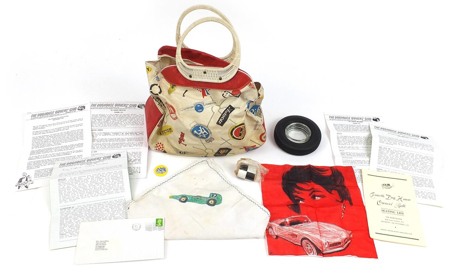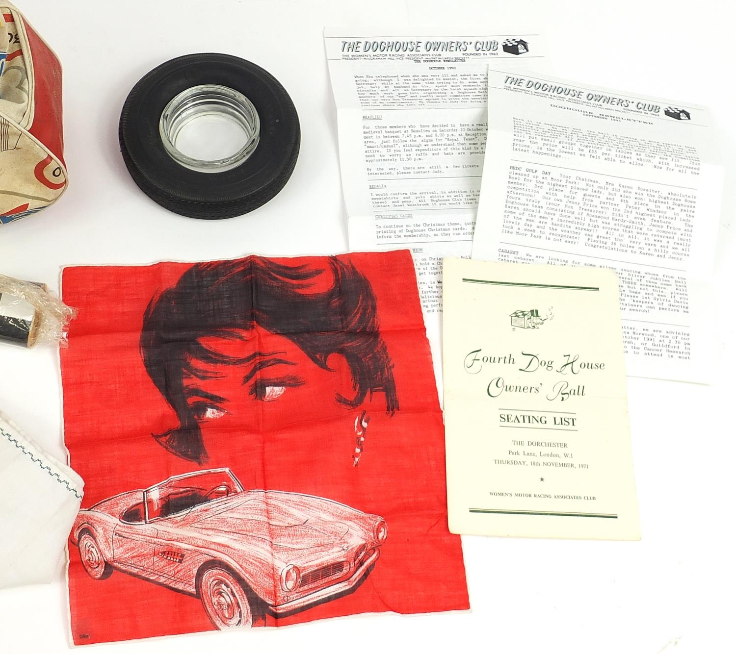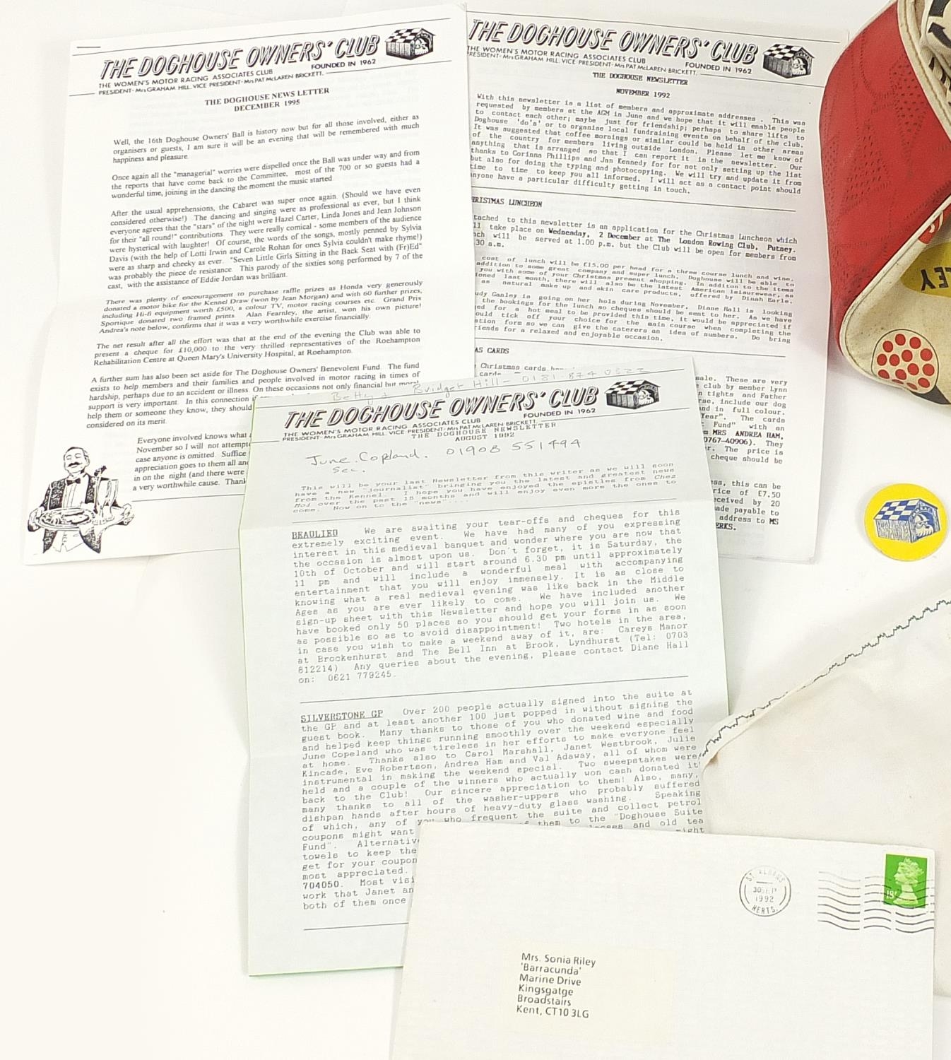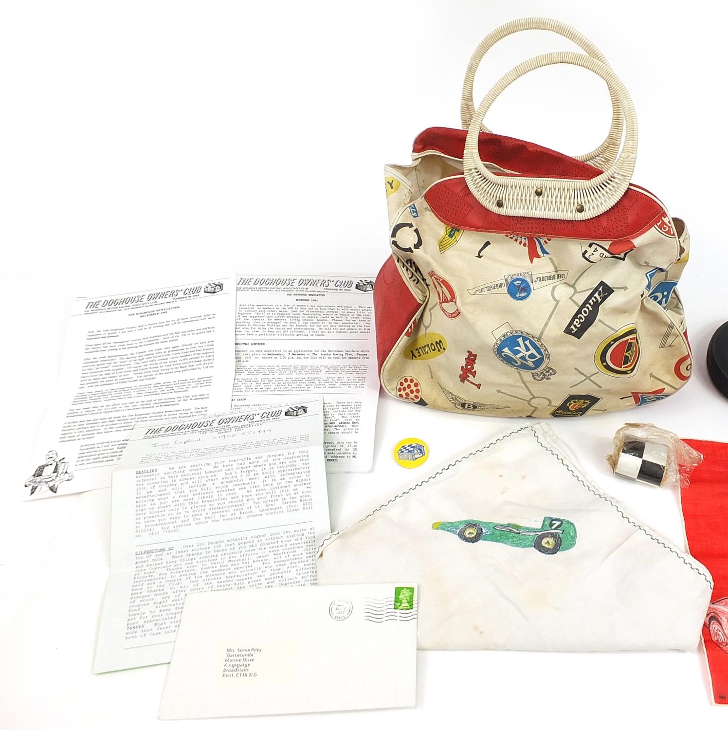 Vintage motoring interest ephemera and collectables including badge and letters relating to The Women's Motor Racing Associates Club known as The Doghouse Owner's Club