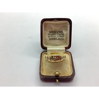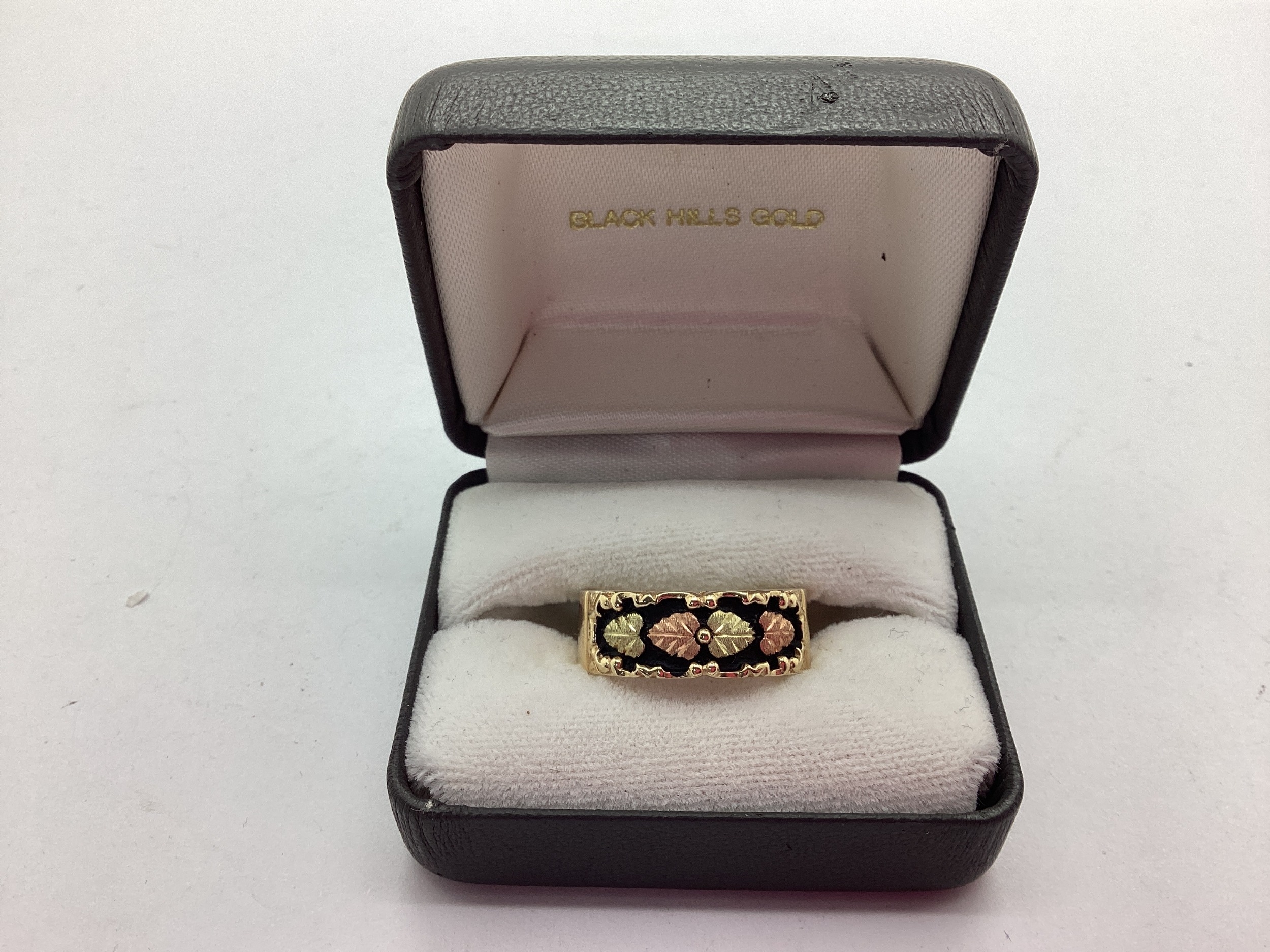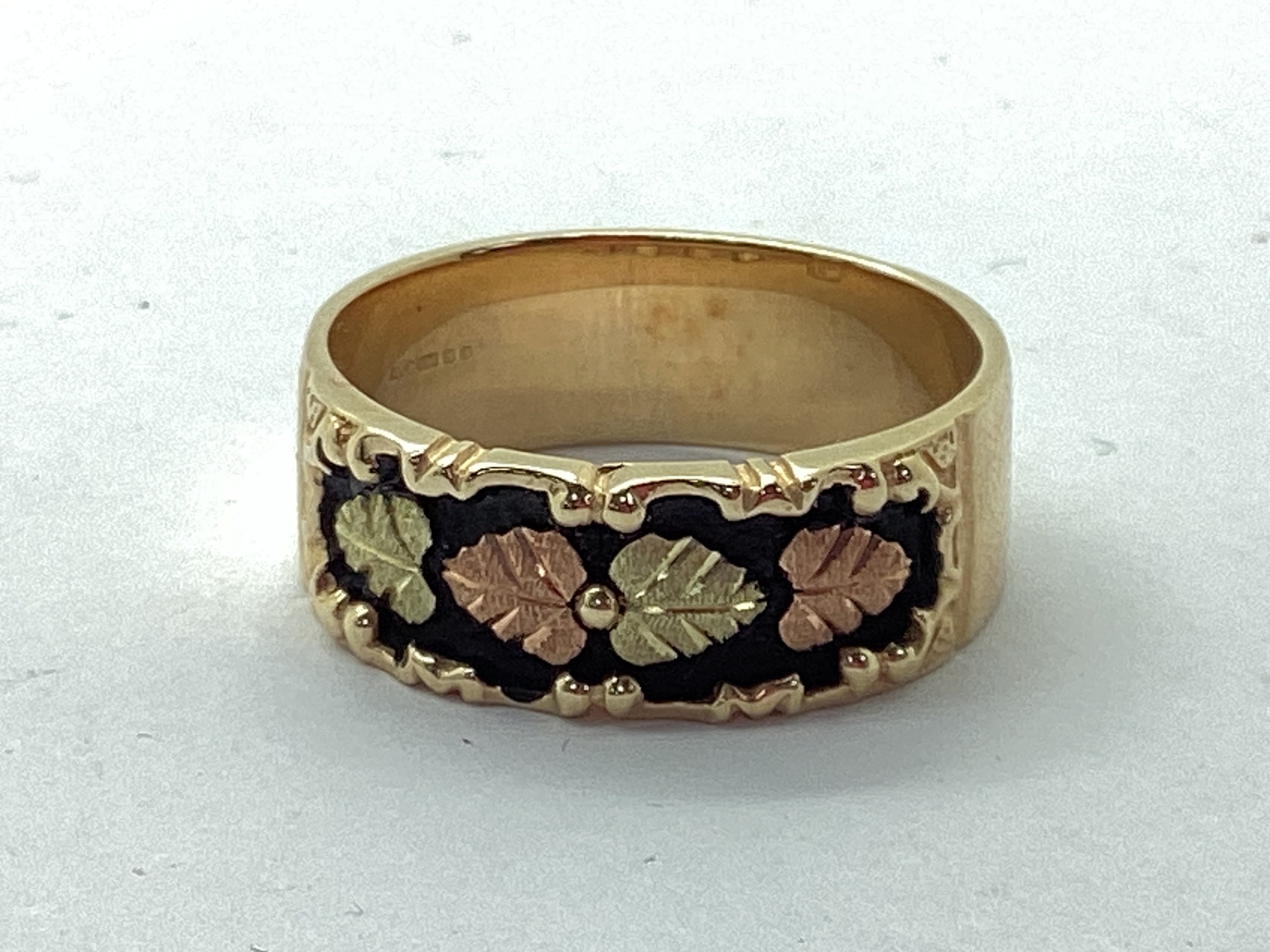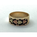 QVC; A Black Hills Gold Style Foliate Band, the two tone textured design on black background, between plain shoulders, stamped "375" "CCO 10K" (finger size U/V), in ring box.