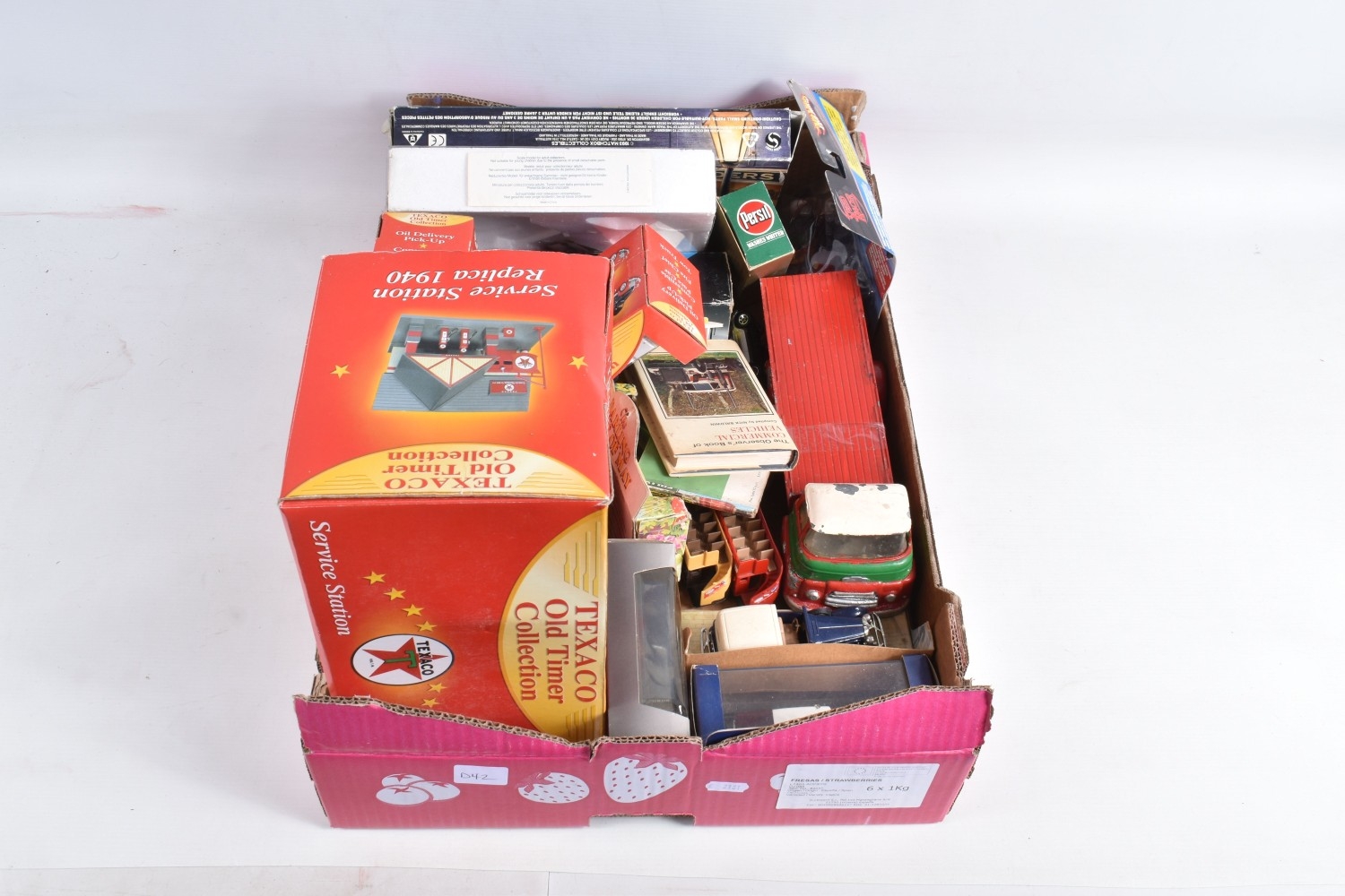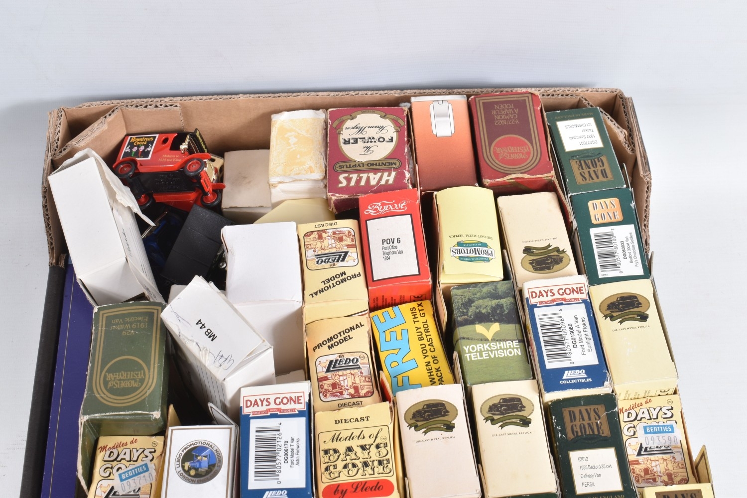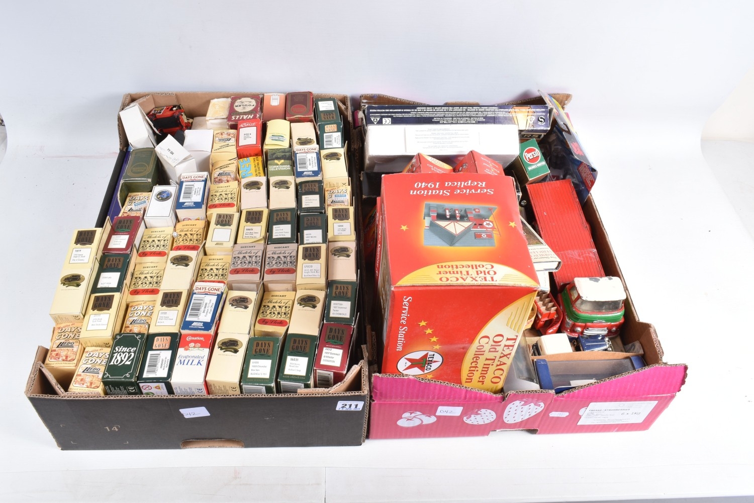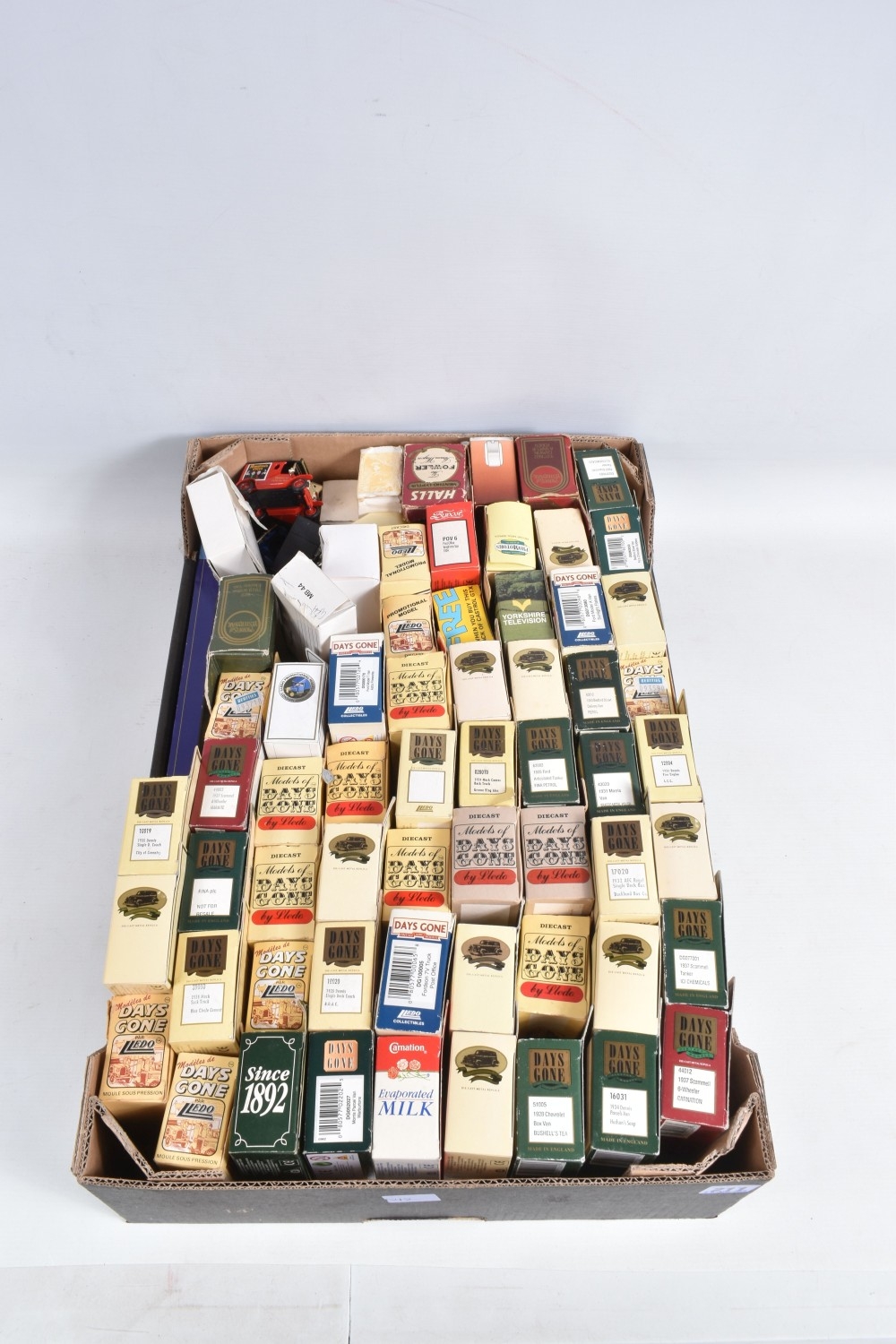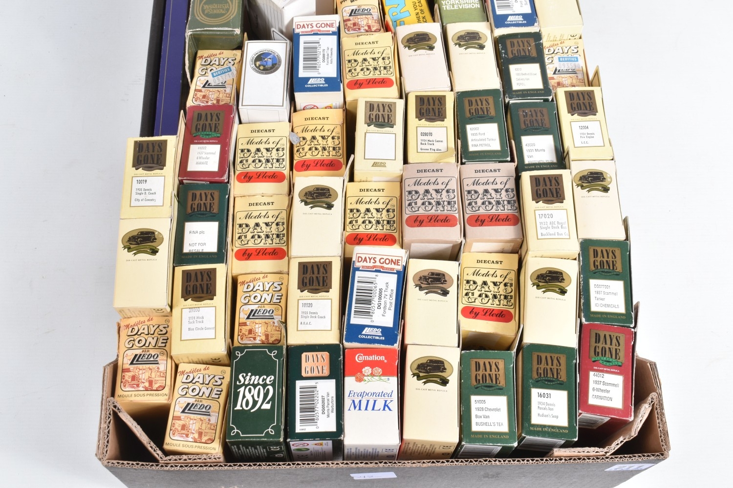 A QUANTITY OF BOXED DAY'S GONE LLEDO AND OTHER DICAST MODELS, to include haulage vehicles, public transport, and advertising interest examples, also included are boxed and loose models by Hot Wheels, EFE, Texaco, Matchbox, Corgi, Triang, Solido and similar, there is a Military Giants of the Sky Avro Lancaster 'Admiral Prune', a Dinky Toys catalogue and 'The Observer's Book of Commercial Vehicles' hardcover illustrated series, the boxed models appear in good condition, the loose models showing paint loss, the outer packaging varies in condition, mainly showing wear on corners and edges, contents unchecked for completeness (2 boxes)