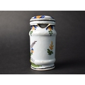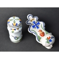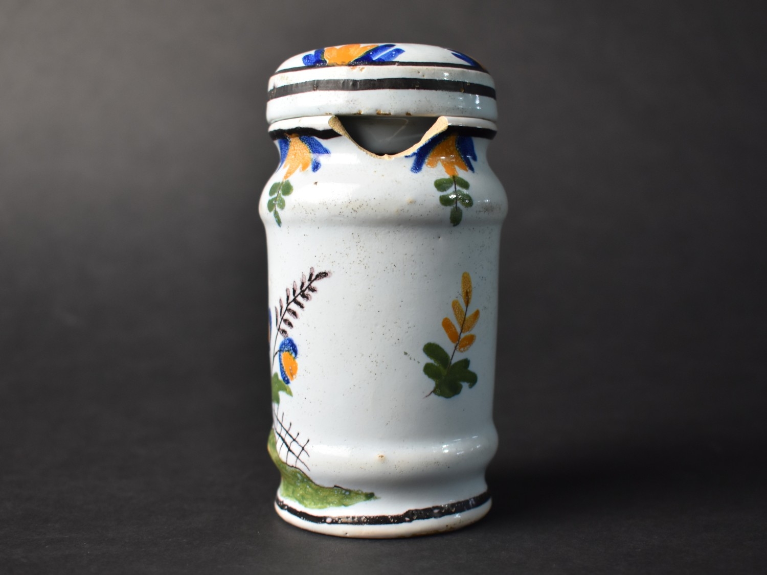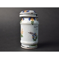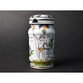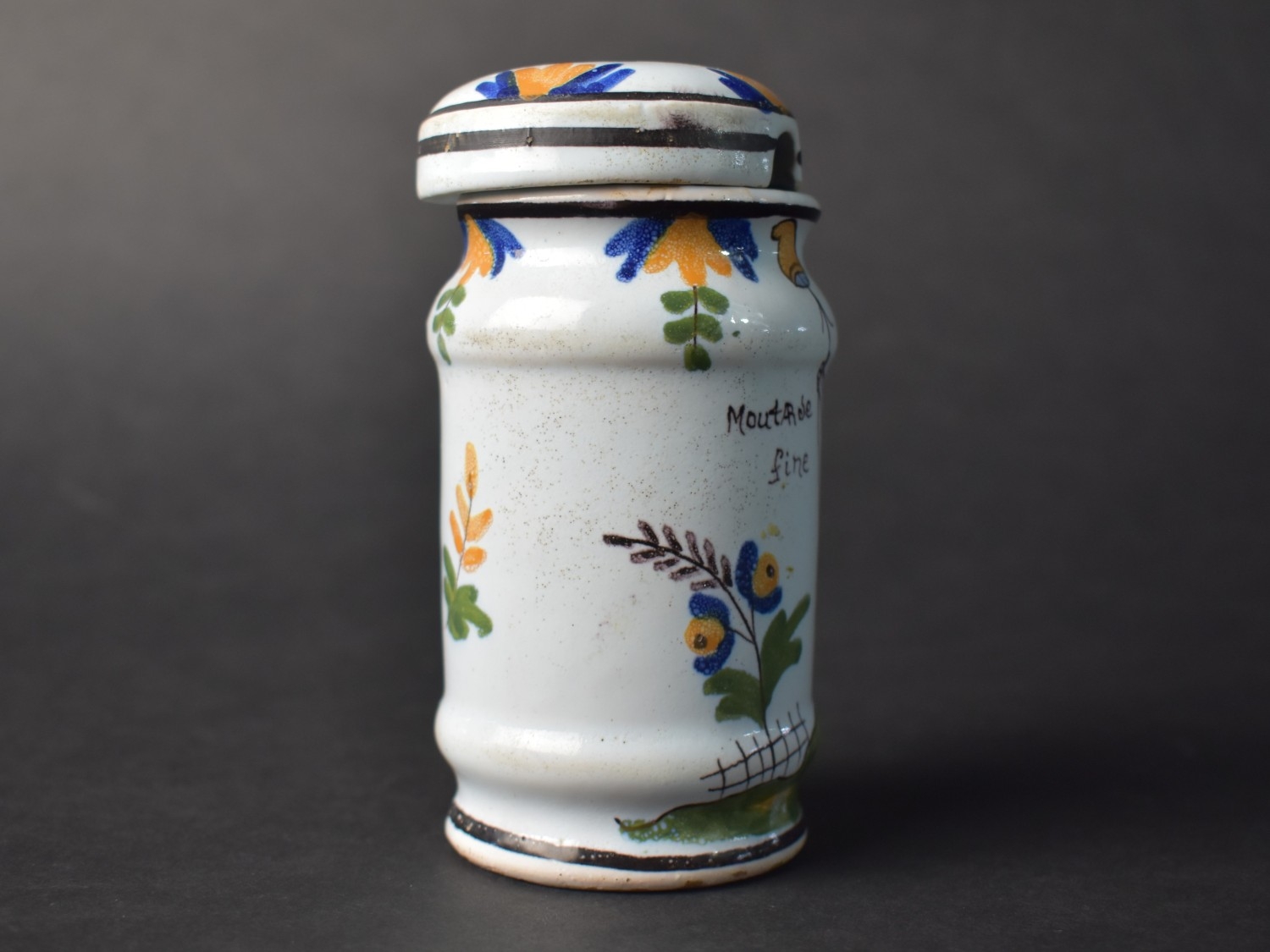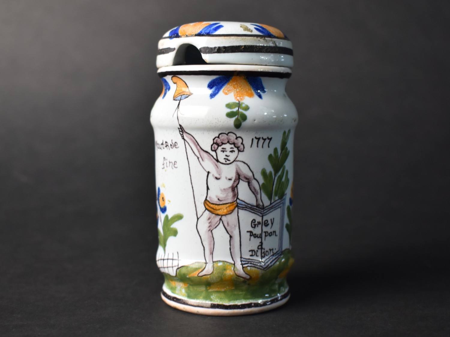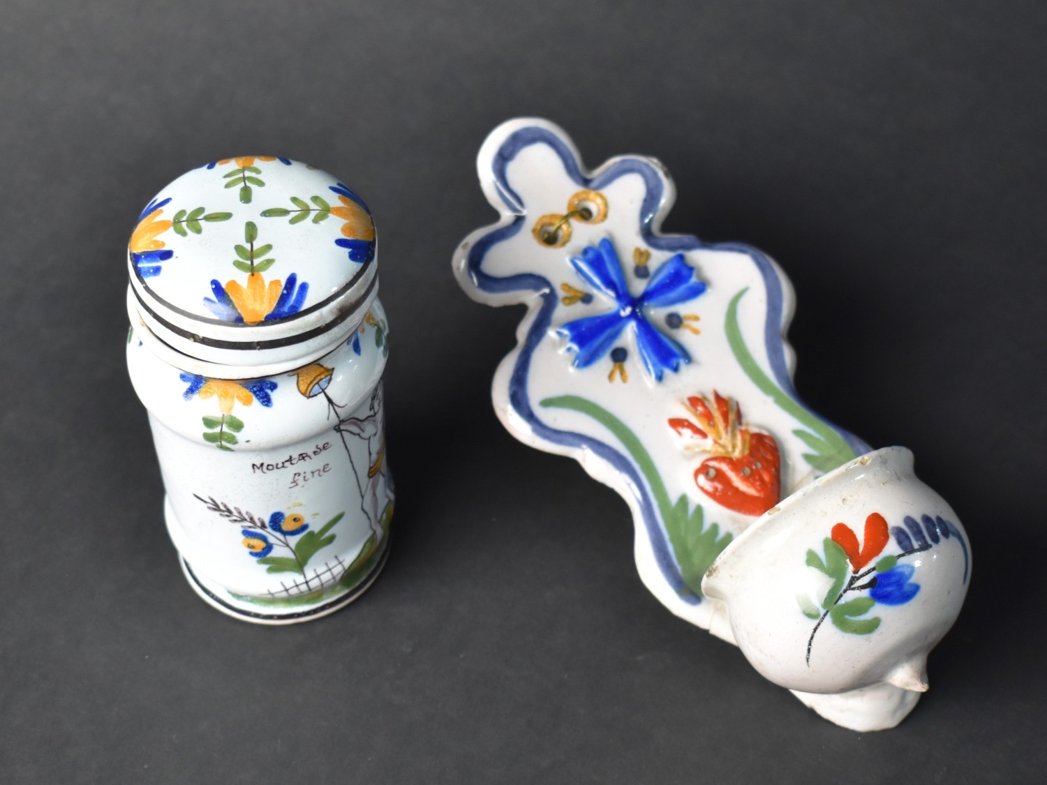 A French Faience Mustard Jar and Cover Decorated with Figure Holding Book Inscribed "Grey Poupon a Dijon" and Date "1777", 11cm high (With Loss) Together with a Late 19th Centyry French Faience Benitier or Holy Water Font Decorated with Blue Cross and Sacred Heart (Glue Repair) 18cm high