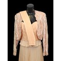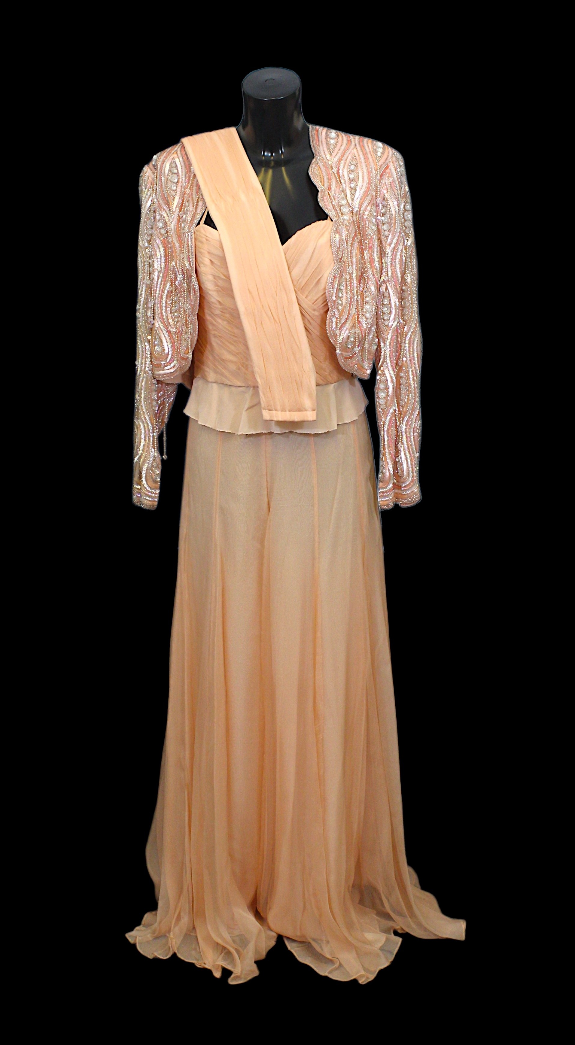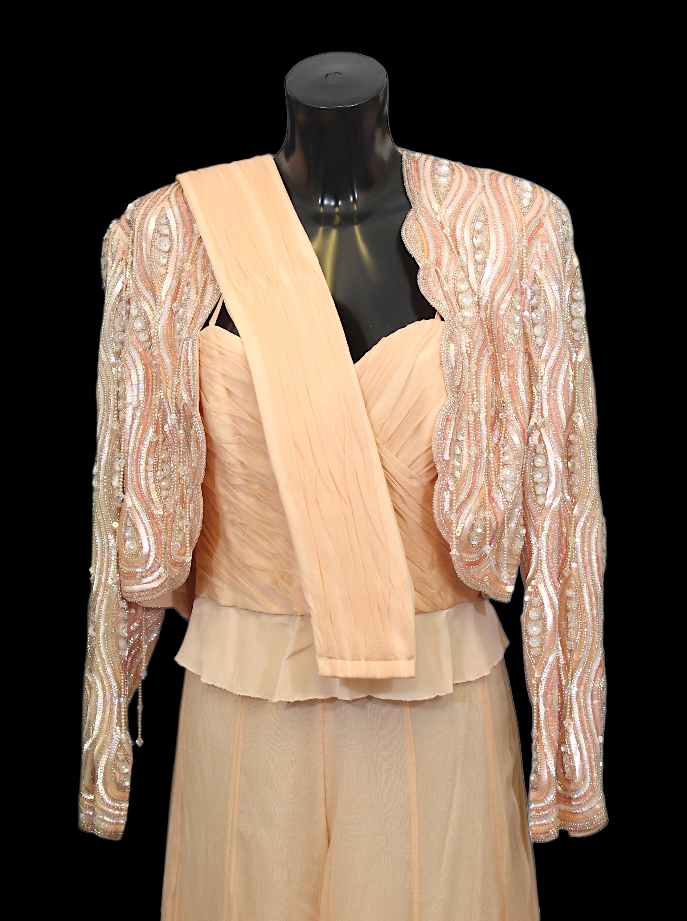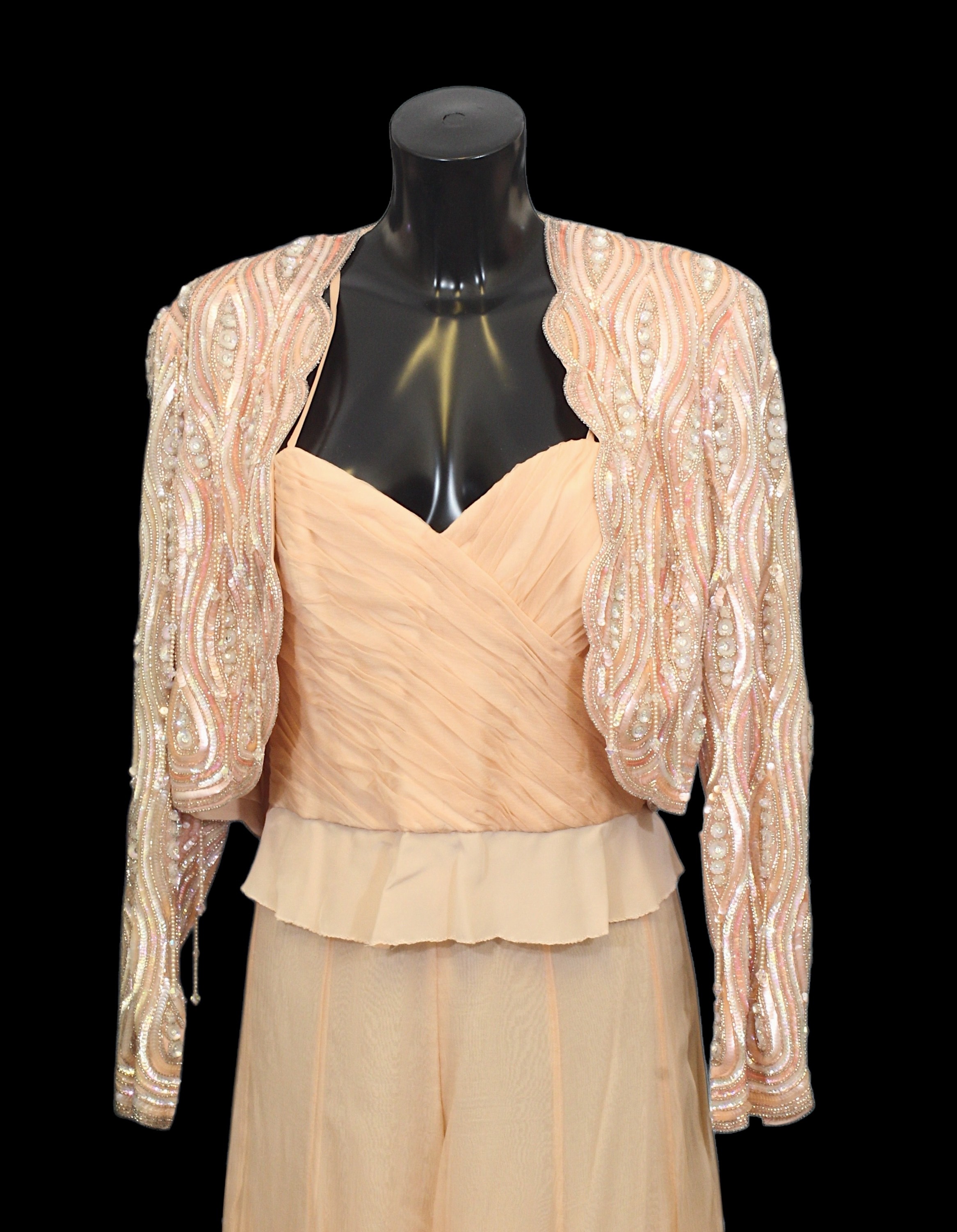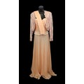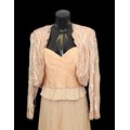 comprising a peach coloured jacket, heavily embellished with iridescent sequins, beads and beaded tassels, a peach coloured chiffon effect bustier top, boned with spaghetti straps, together with a matching skirt and cummerbund belt, skirt waist flat 34cm (4)