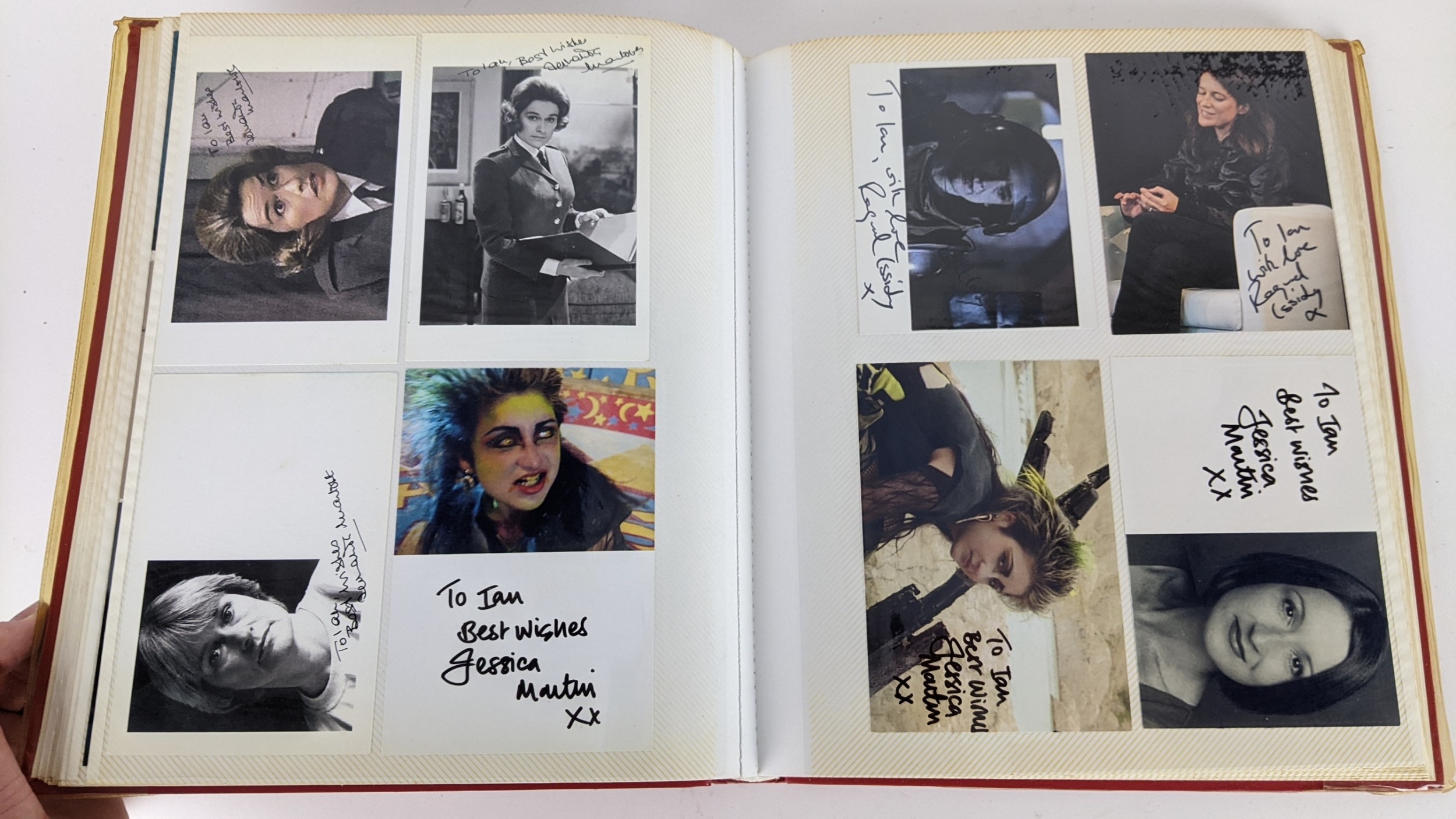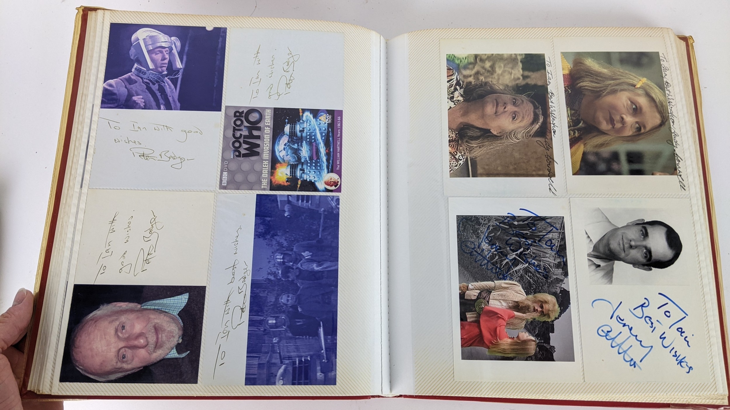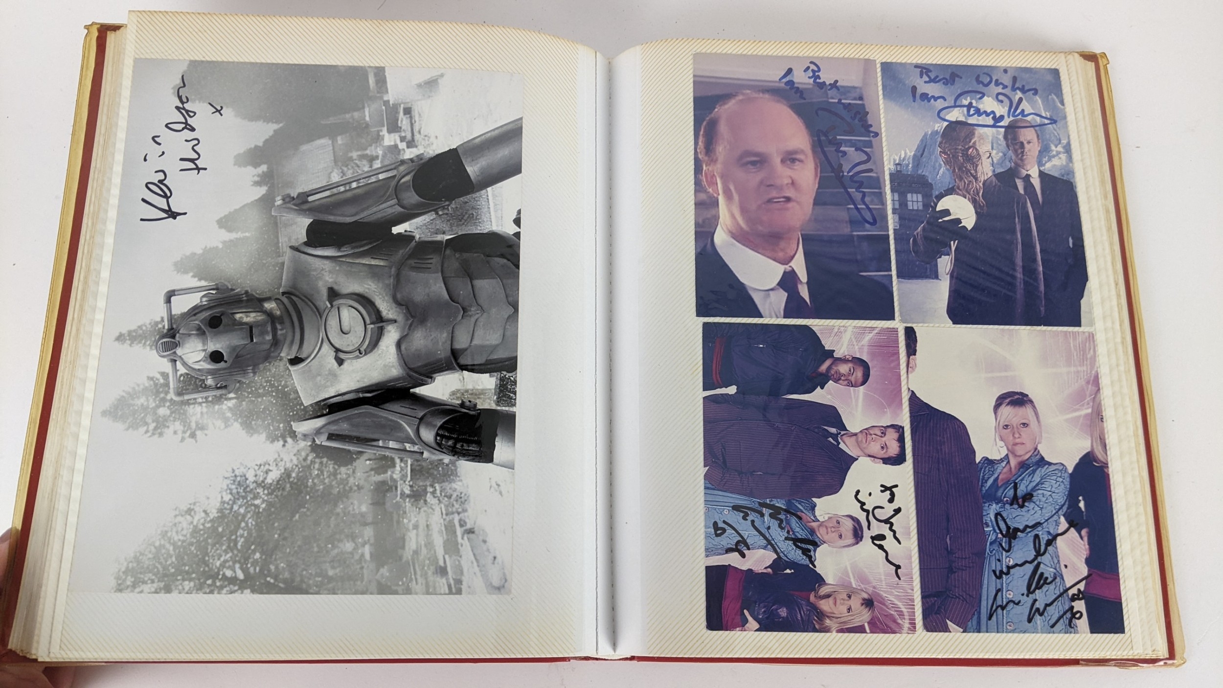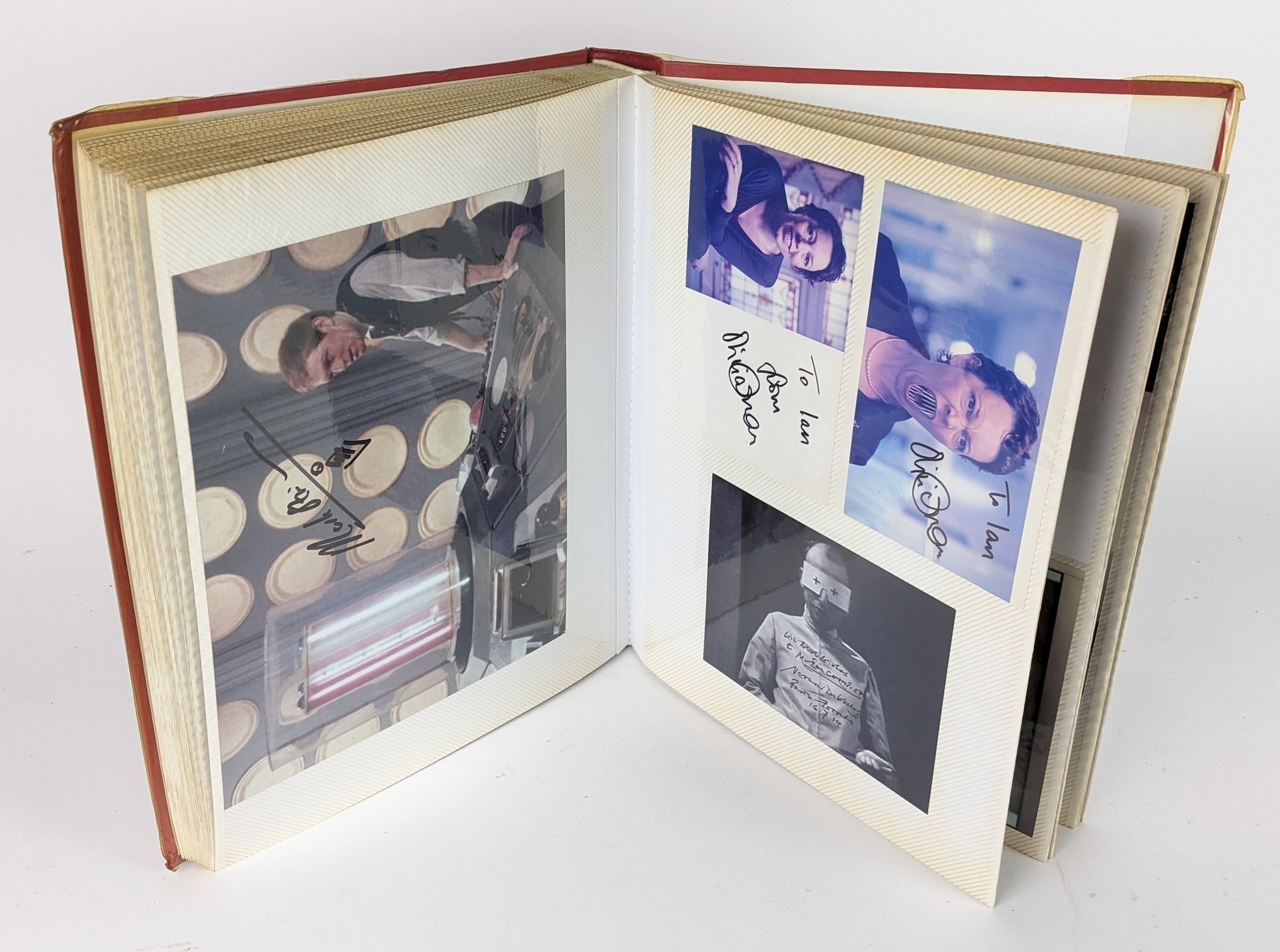 A Doctor Who album of autographs on photos, signed by several cast members to include Louise Jameson, Simon Pegg, Mark Strickson and others