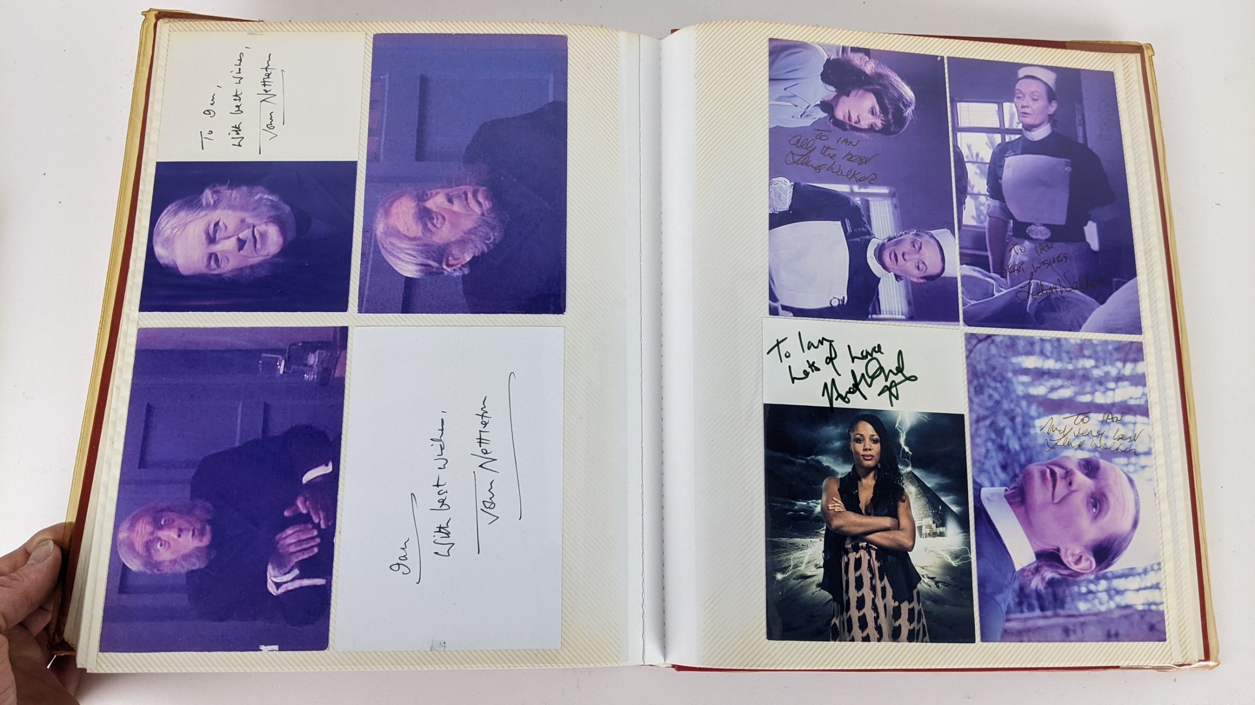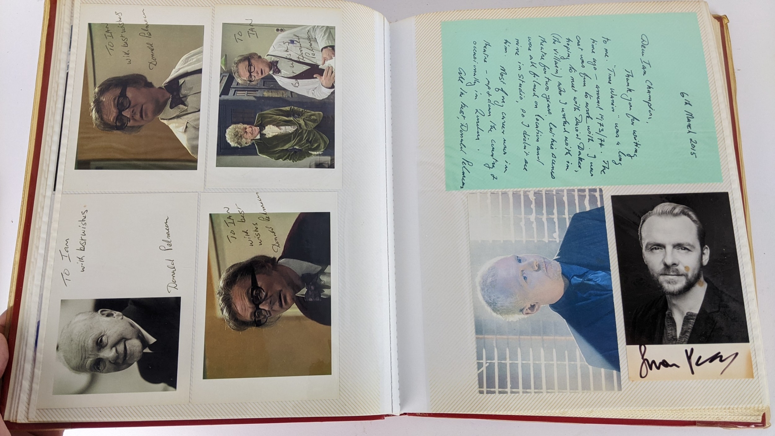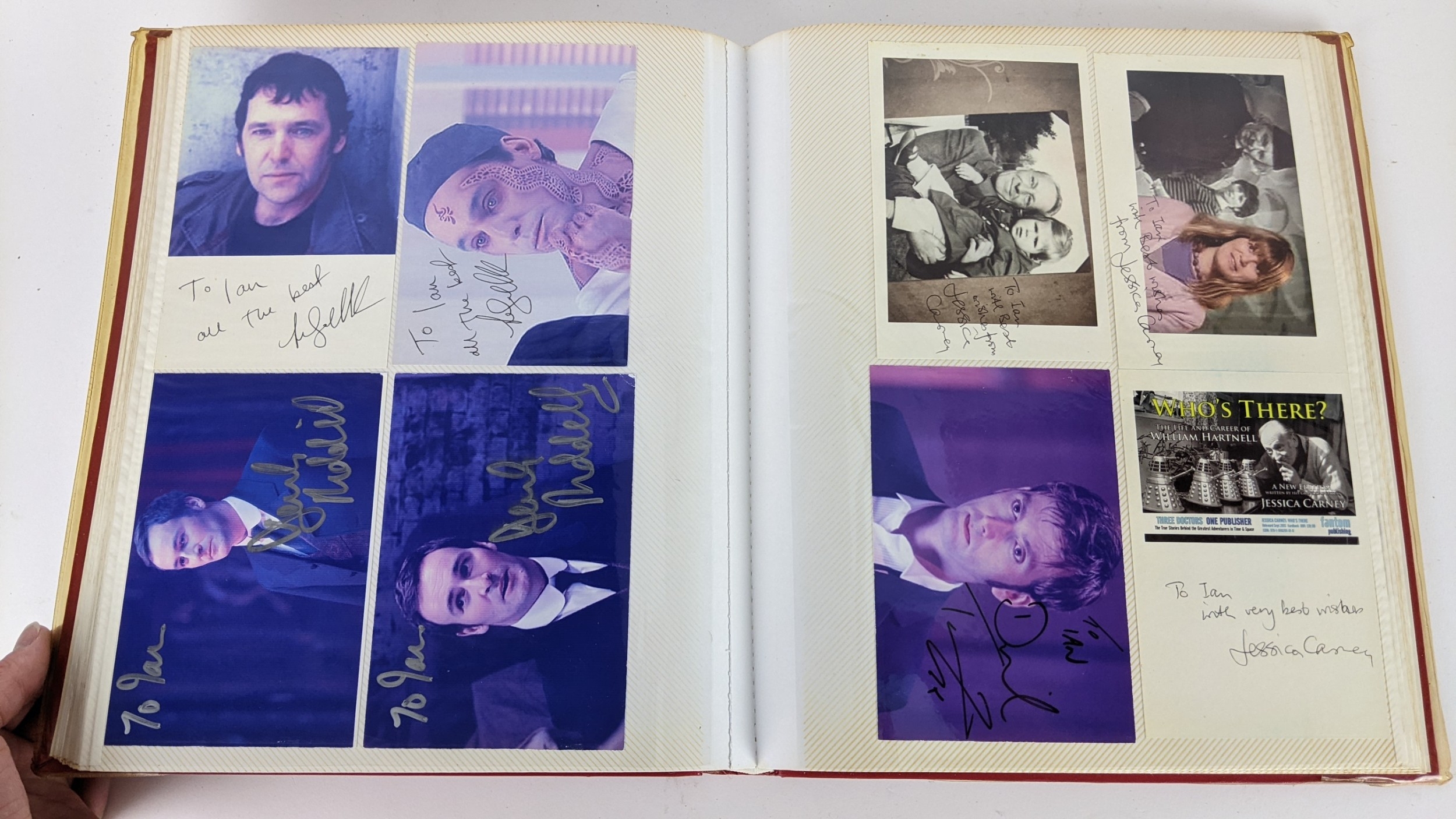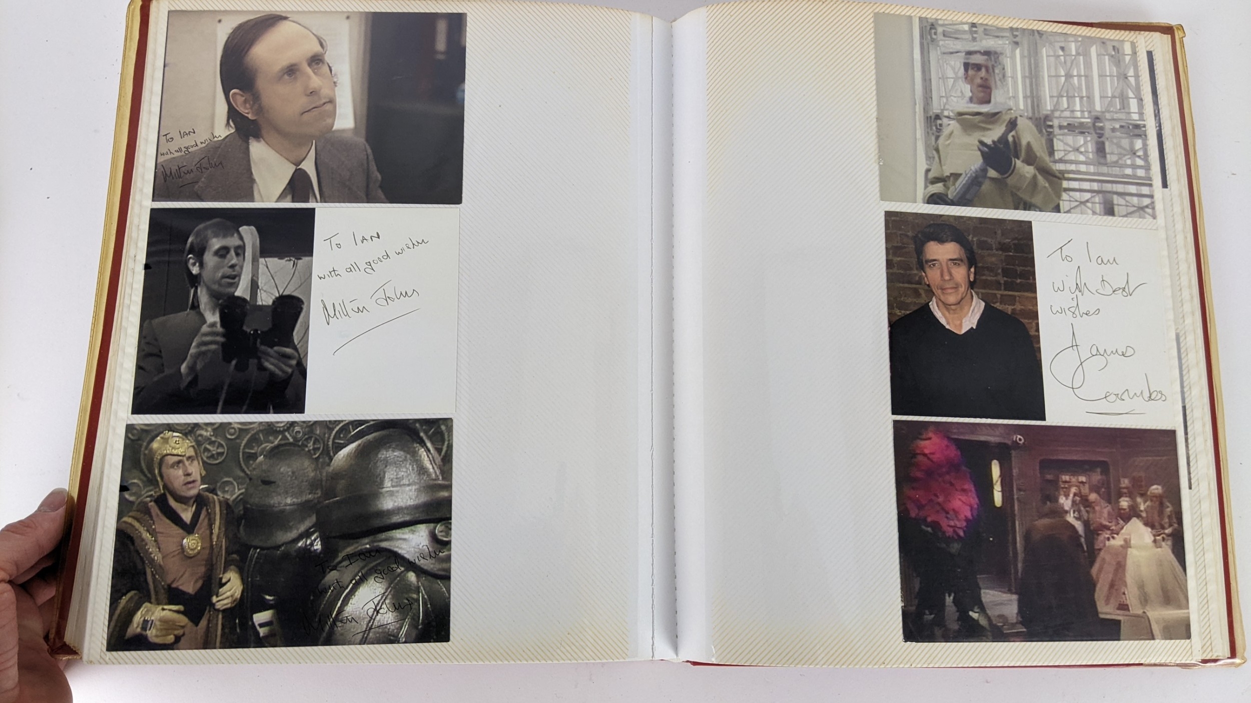 A Doctor Who album of autographs on photos, signed by several cast members to include Louise Jameson, Simon Pegg, Mark Strickson and others