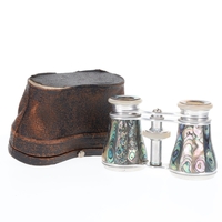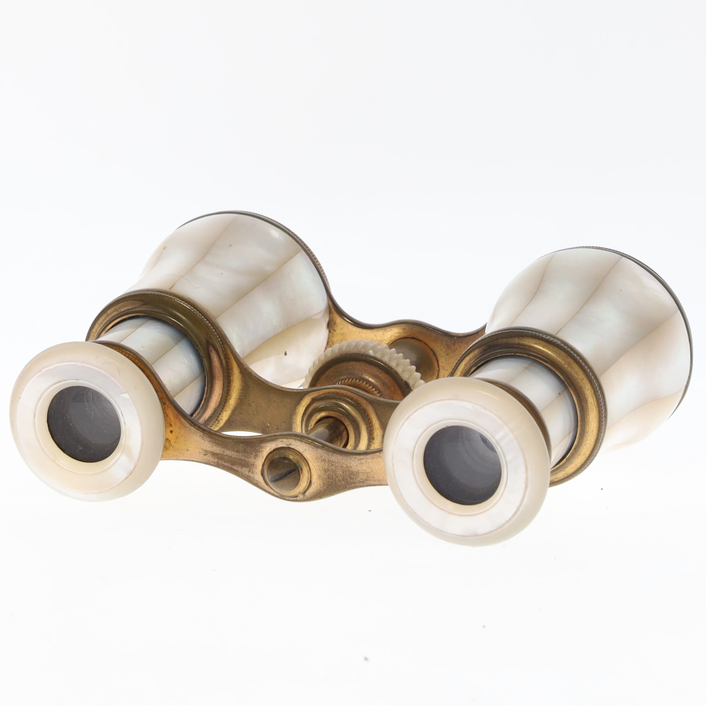 Antique Mother of Pearl Opera Glasses with Mother of Pearl Barrels in a working condition. Lenses are clear to look through with minimal internal dust or haze. The focus wheel is functional however there is double vision. There is some wear to the external lenses and body however the mother of pearl is intact.