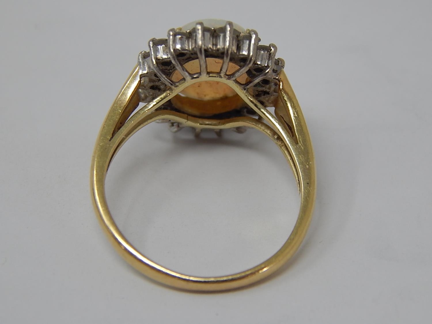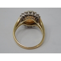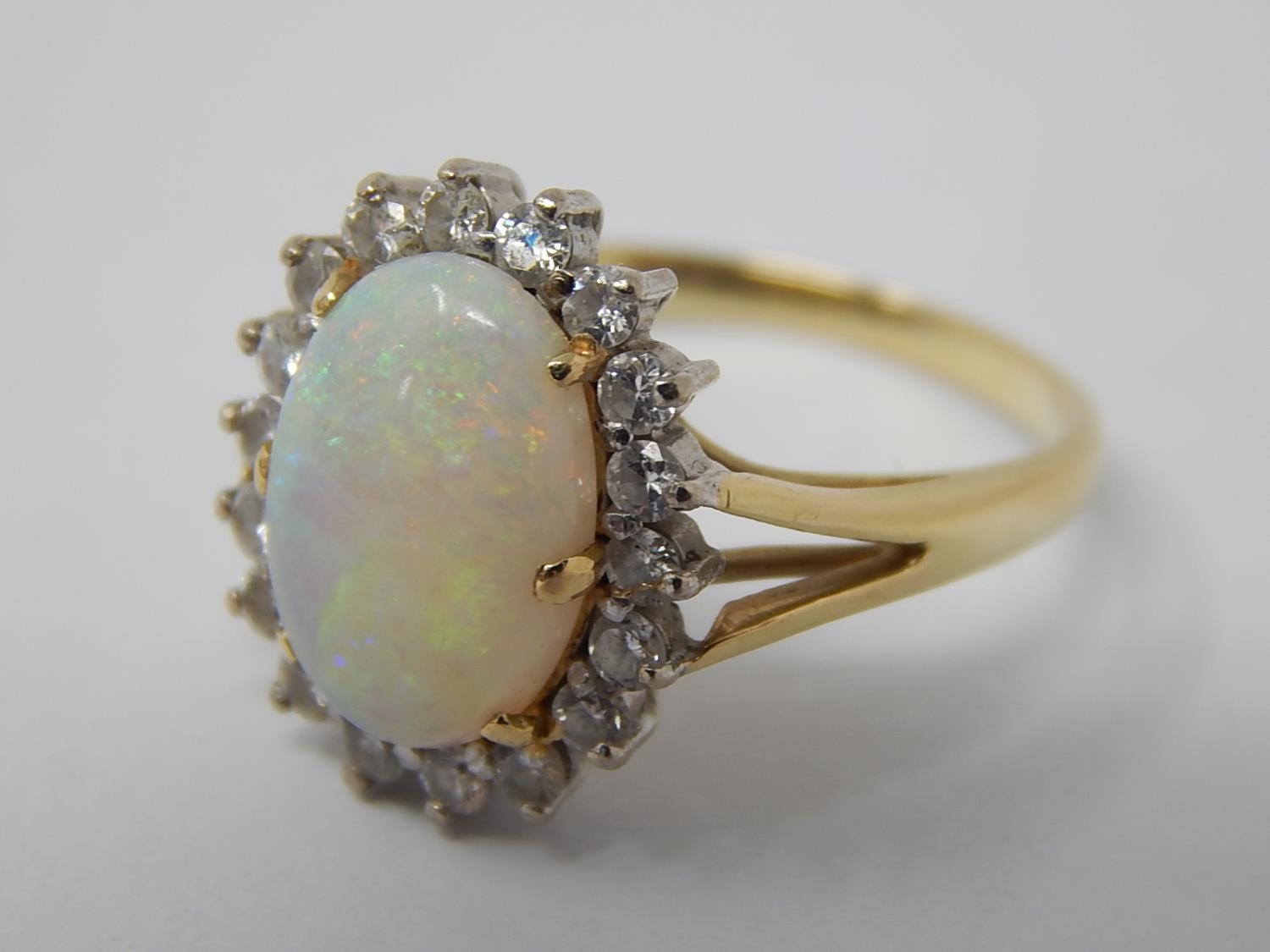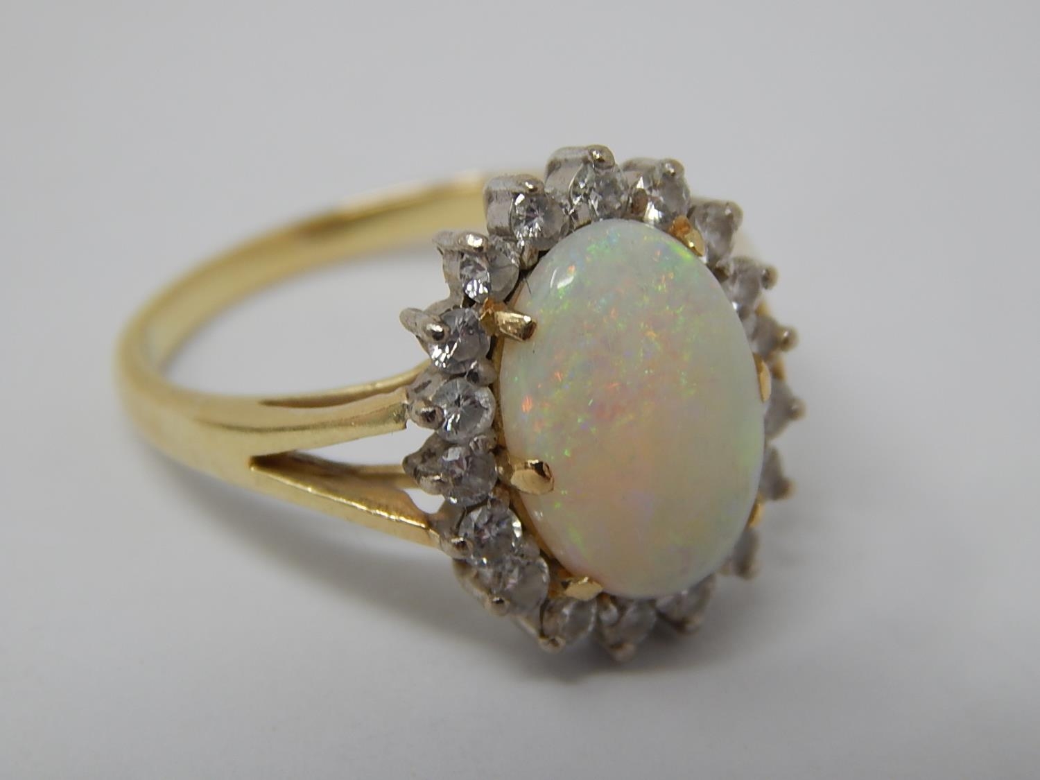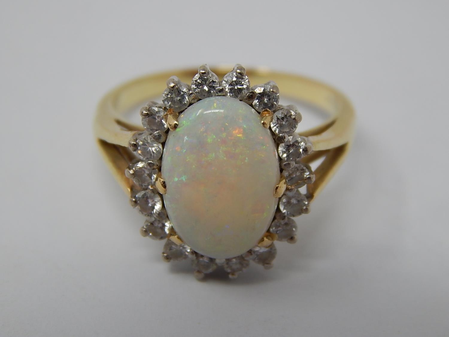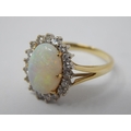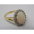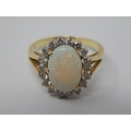 14ct Gold Ring Set with a Central Opal Estimated at 3.00cts within a Border of 18 Diamonds: Ring Size J.