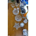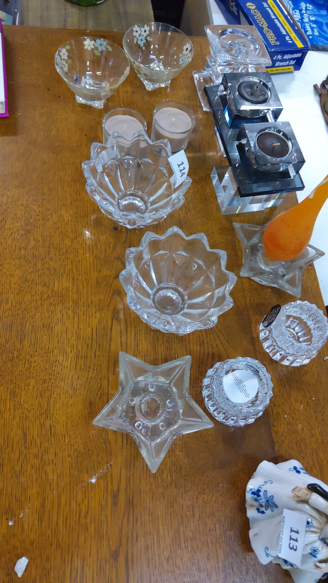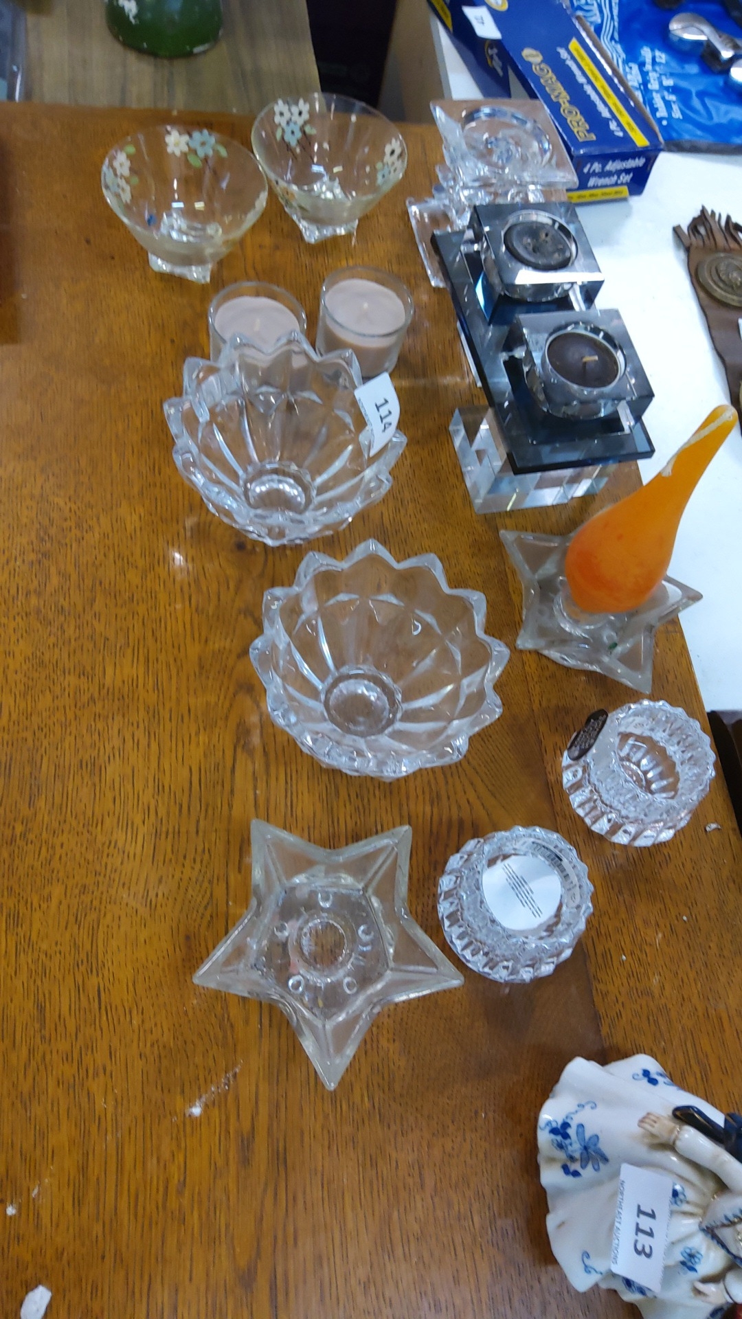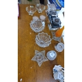 Assorted lot of c.12 pressed and moulded clear glass pieces: scalloped bowls, star-shaped and ribbed candleholders, chrome-mounted double tealight stand, two small floral-painted bowls, and an orange bud vase.
