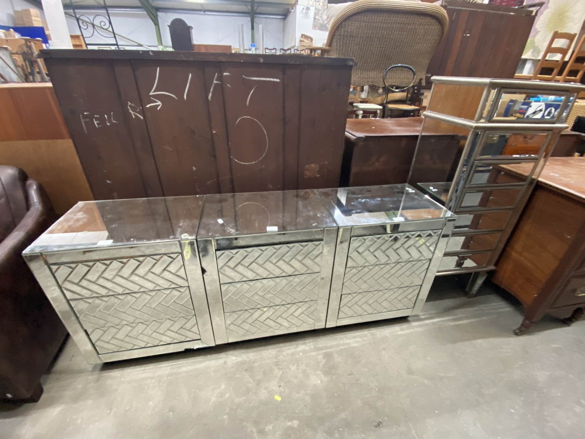 Contemporary mirrored seven drawer chest 113H 46W 33D and 3 mirrored bedside chests 64H 51W 36D