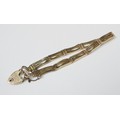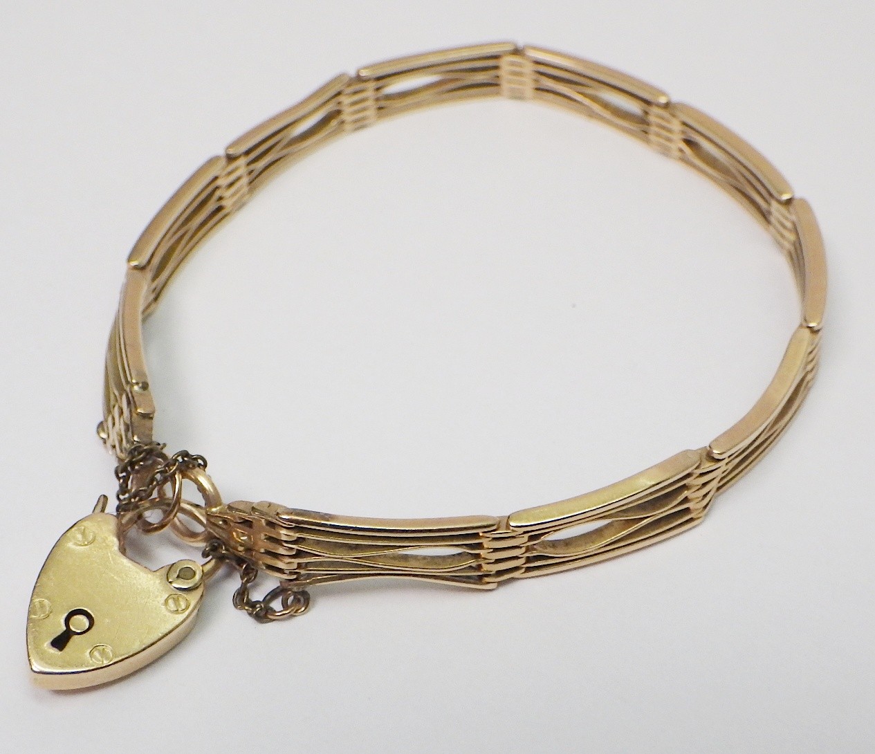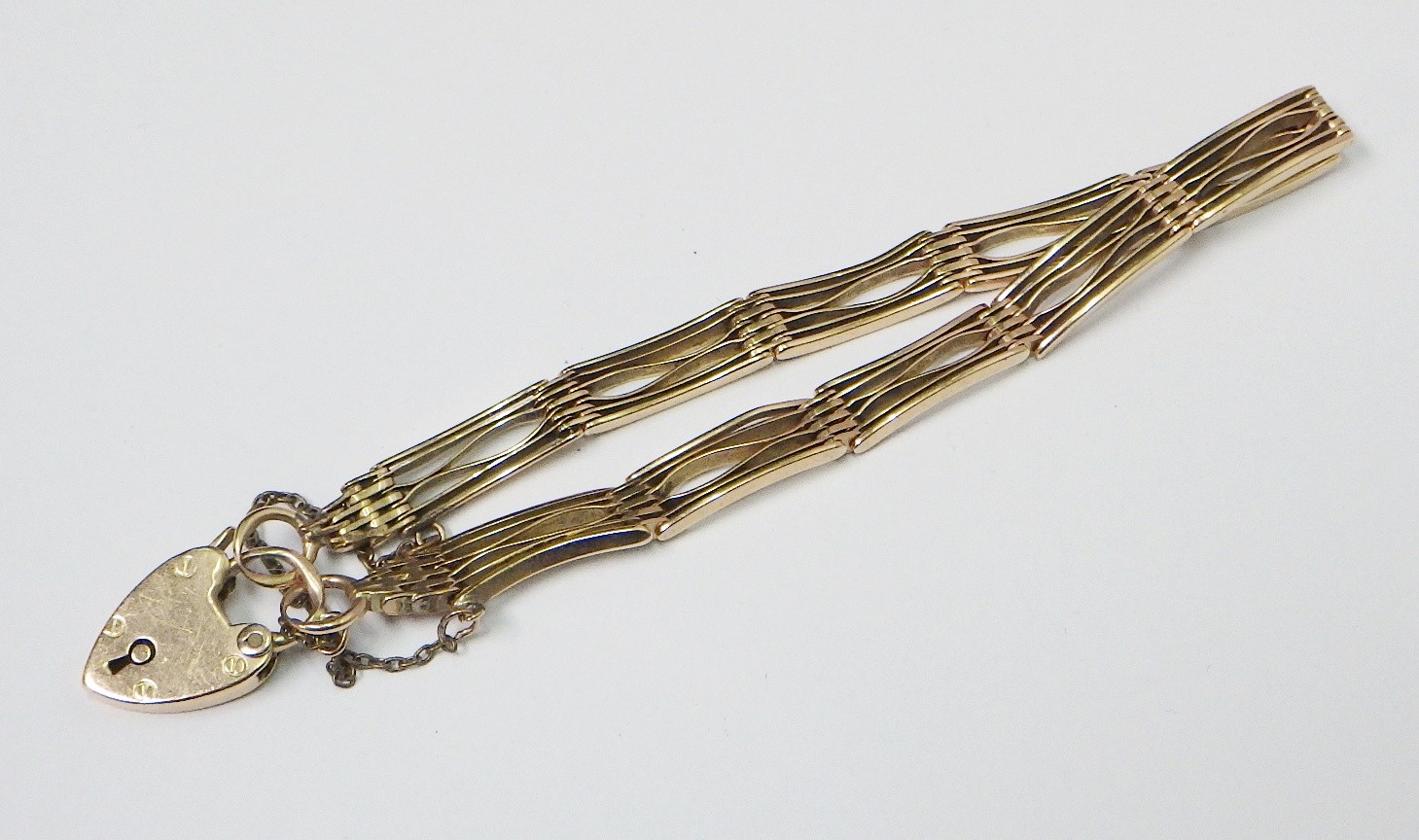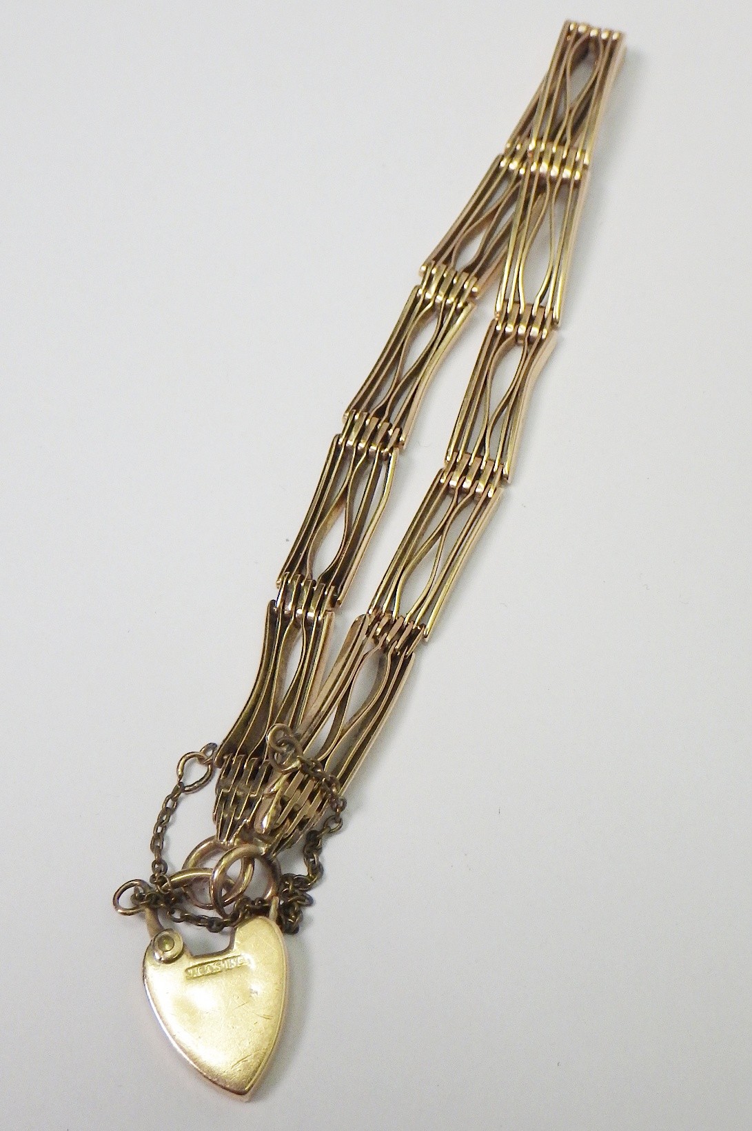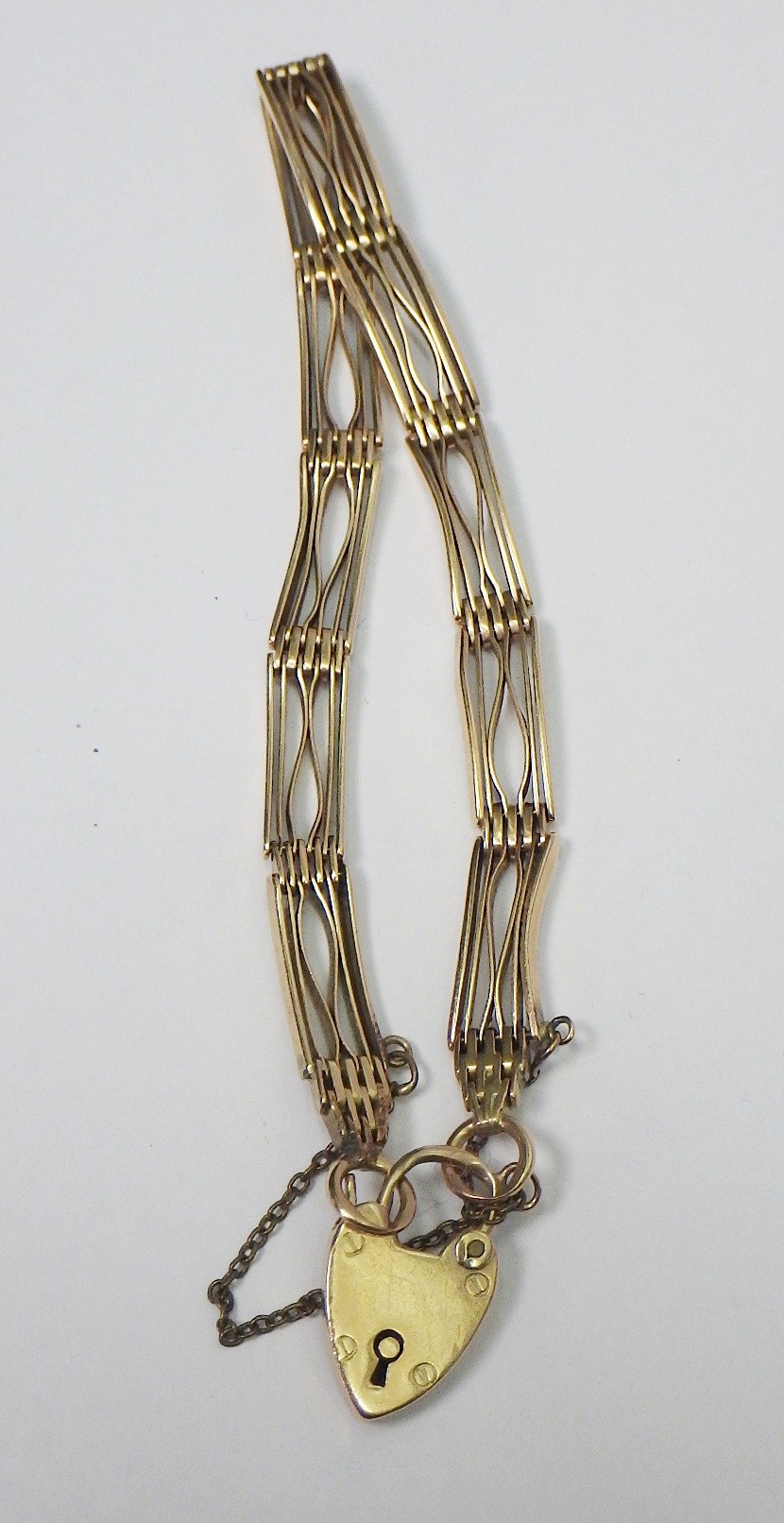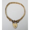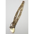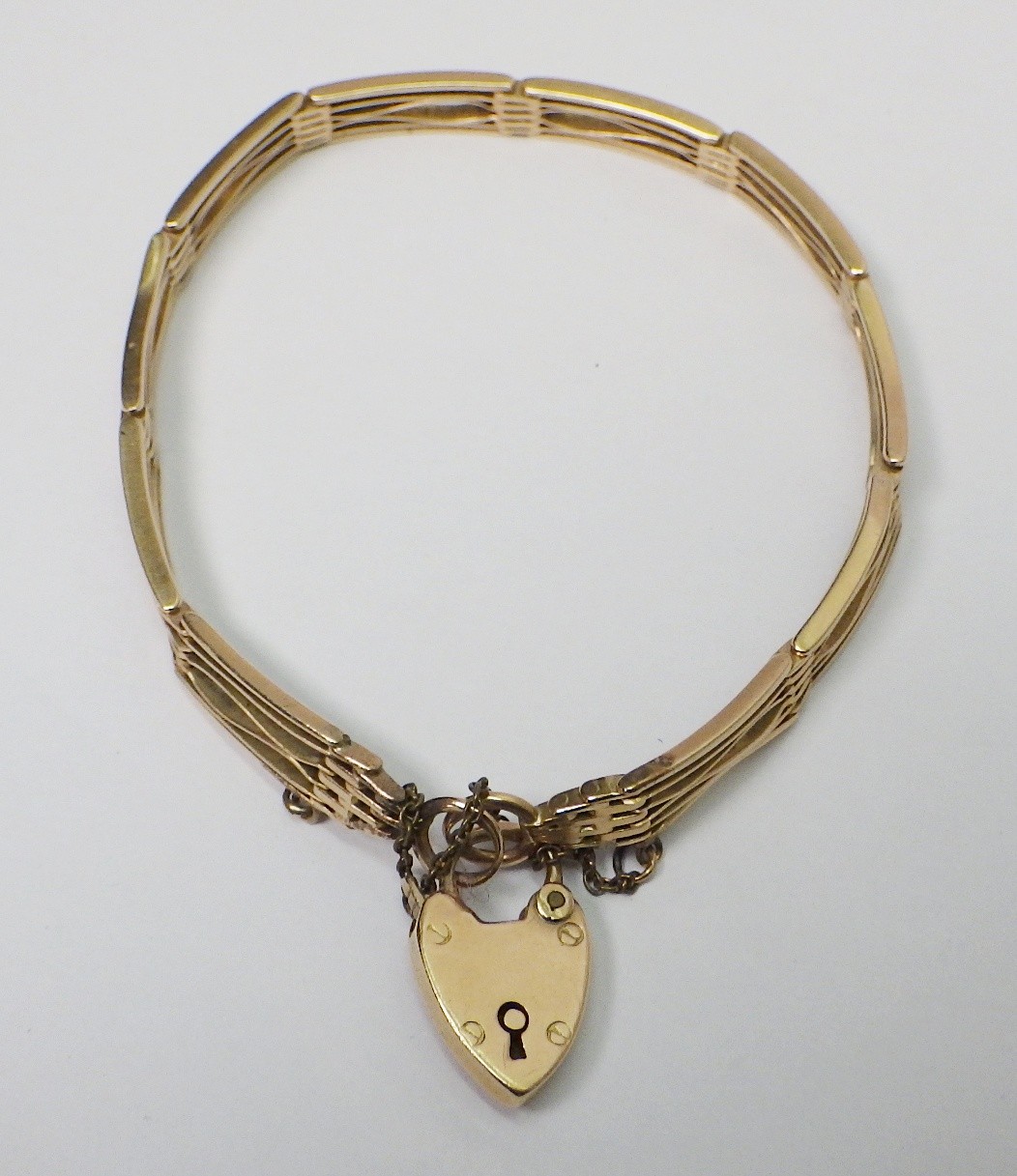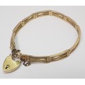 A slim fancy gate link bracelet, unmarked yellow metal, the padlock clasp marked 15c. The bracelets links and end loops approx 190mm long / 5.5mm wide. The bracelet weighs 17g gross please note no guarantee as to its metal composition is offered or suggested by Wombell's Auctioneers as it not hallmarked.