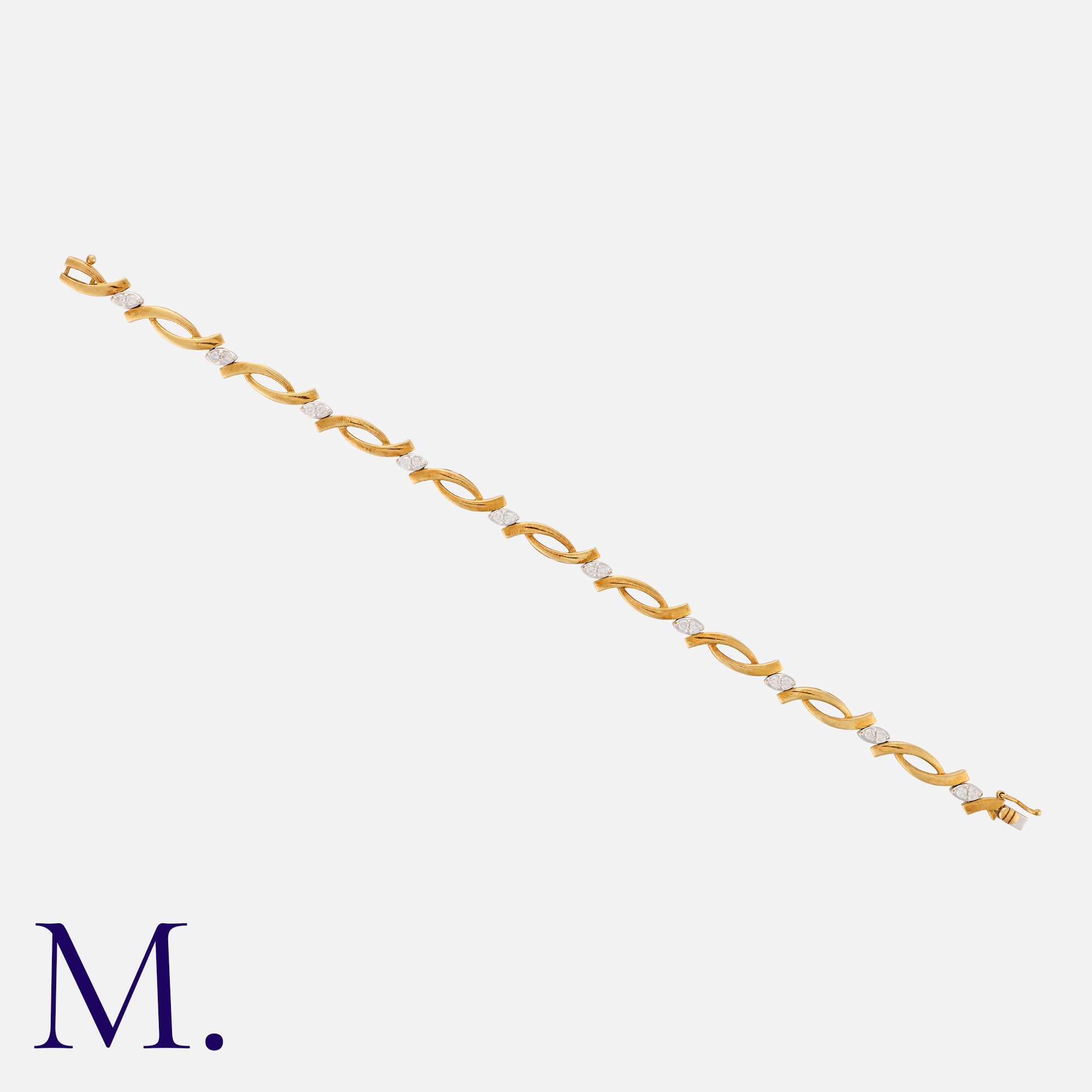 A Gold And Diamond Bracelet in 18k yellow gold, comprising a series of interlocking links, punctuated with pairs of round cut diamonds totalling approximately 0.40cts. Stamped 18K.
