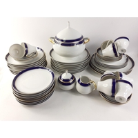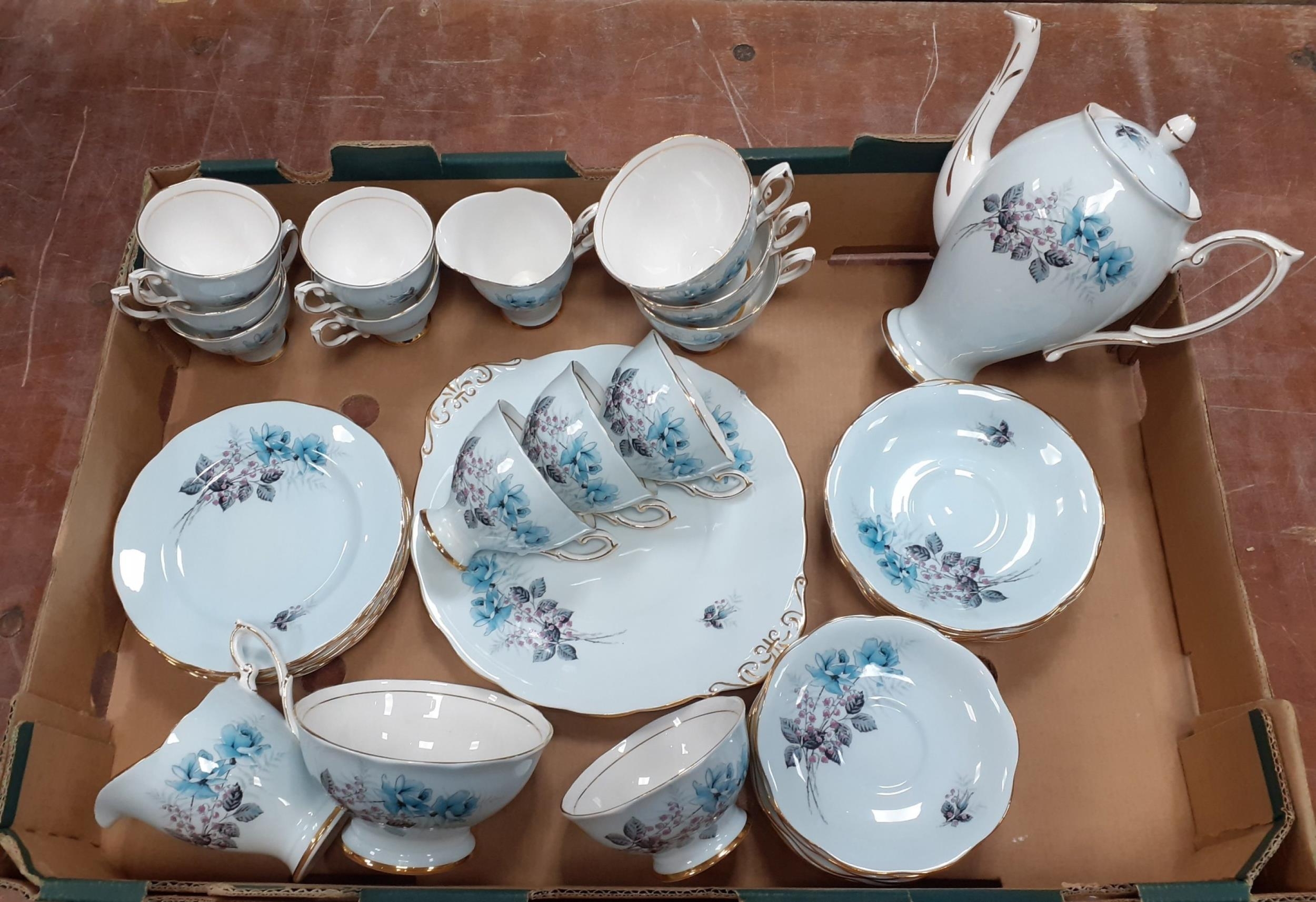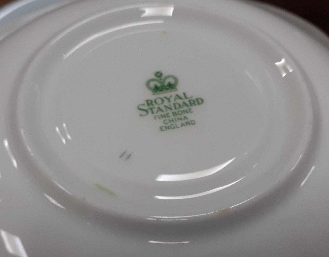 ROYAL STANDARD fine bone china tea set in an attractive powder blue colour, comprising teapot, milk jug, cream and sugar, one large plate, six tea cups and five coffee cups all with saucers and six side plates. All in good order