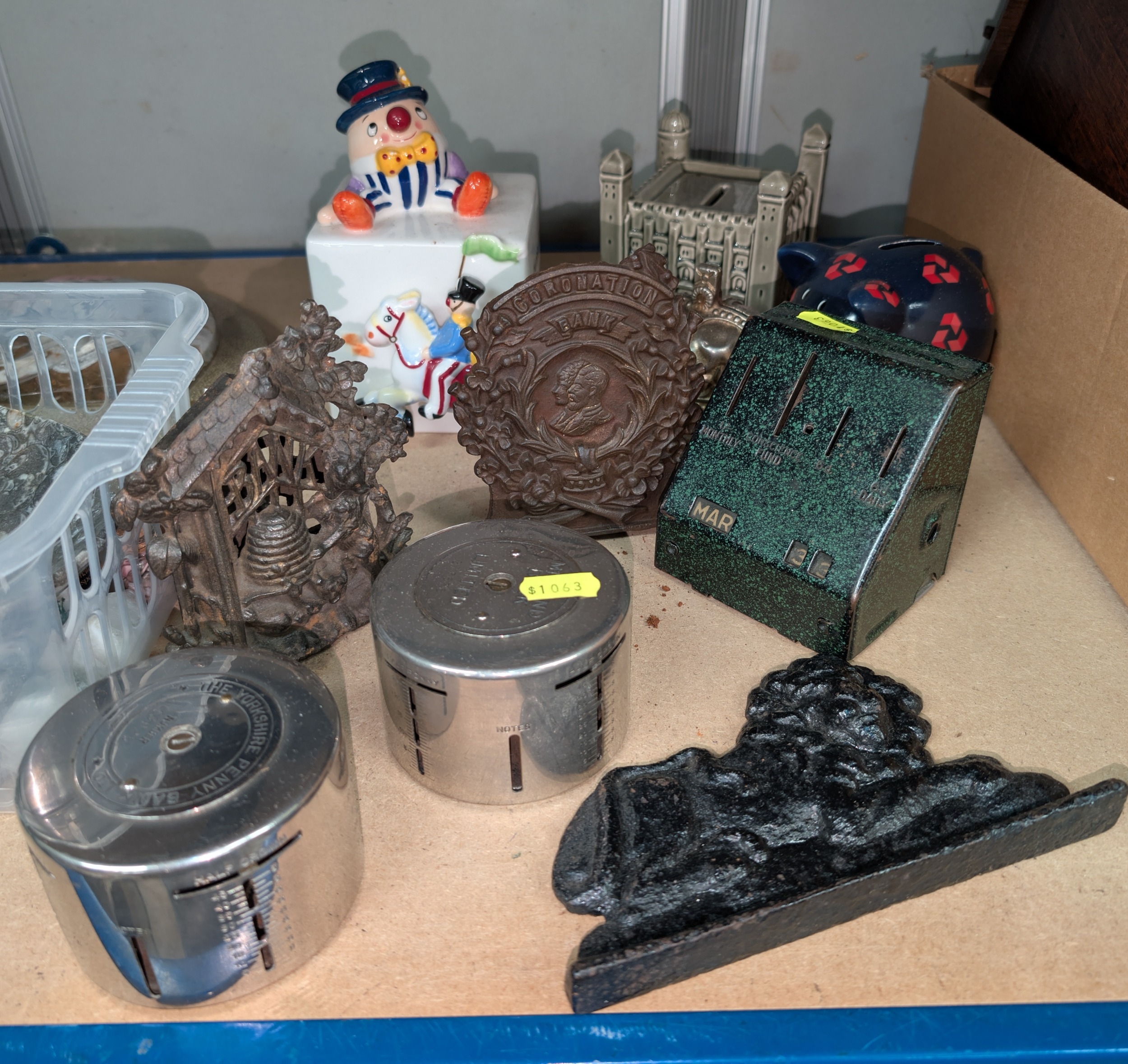 A collection of vintage and later novelty money boxes lion door stop etc