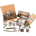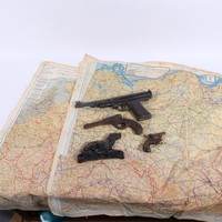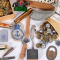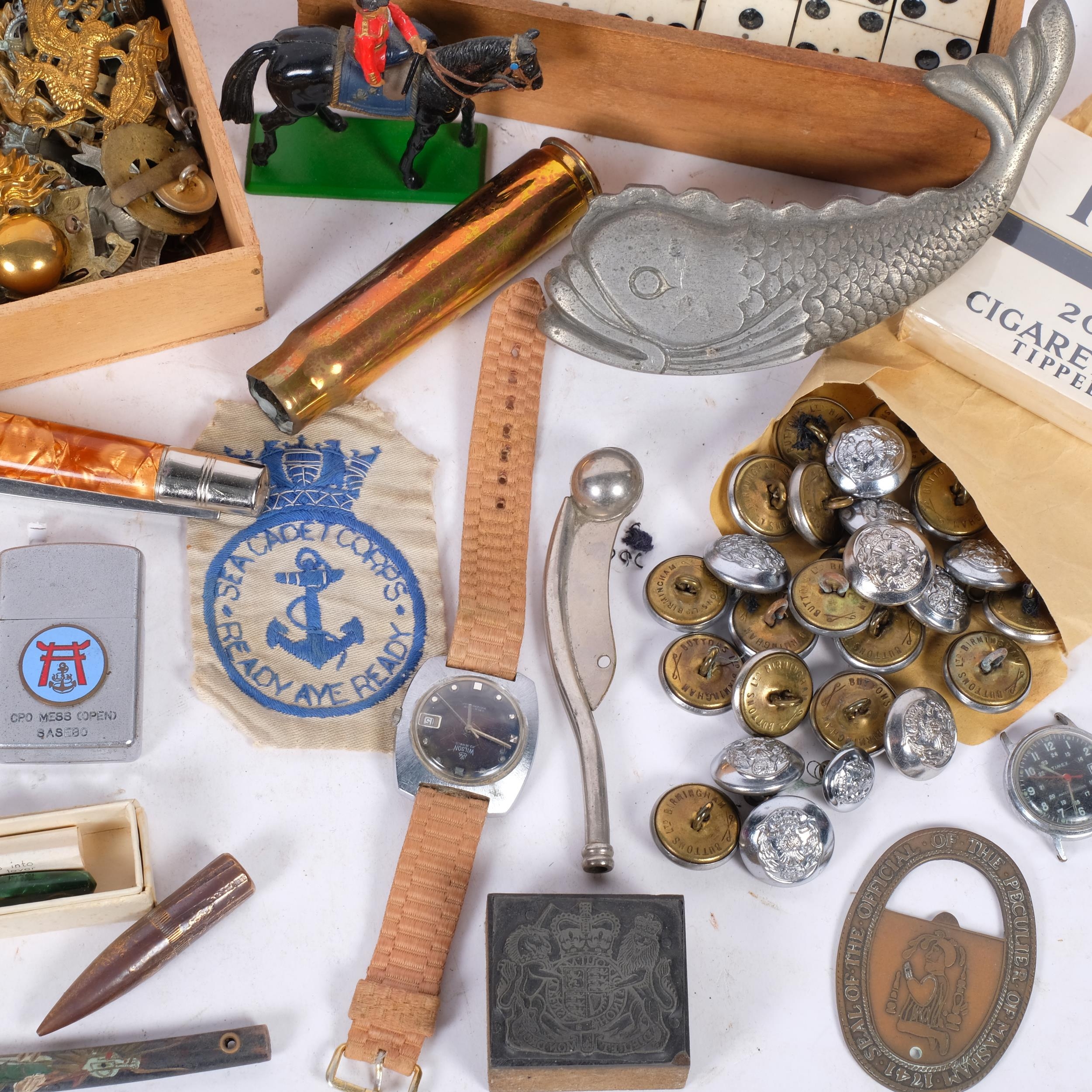 A collection of various military cap badges and buttons, along with a number of other miscellaneous items, including lighters, keys, watches, pens, a cased set of bone dominos, etc