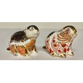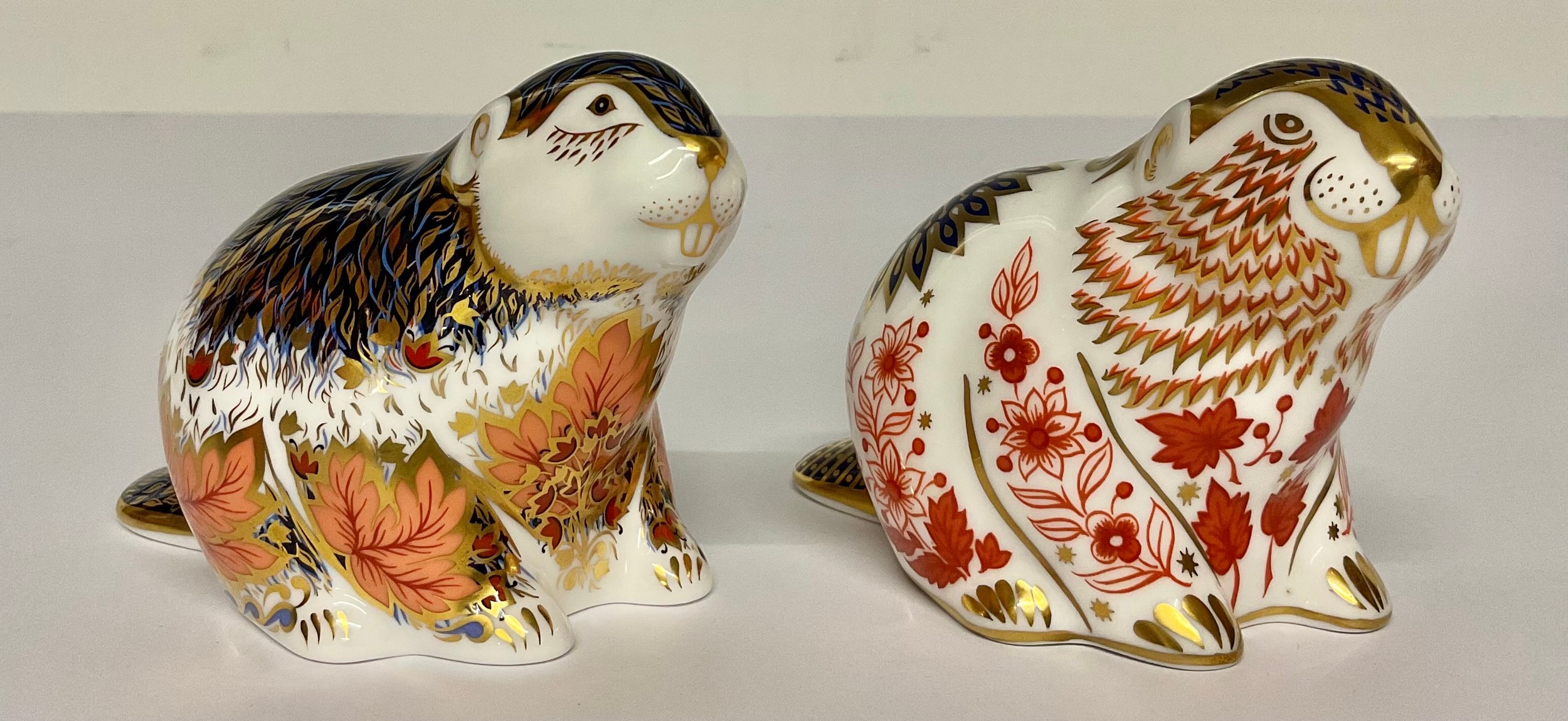 A Royal Crown Derby paperweight, Riverbank Beaver, limited edition 2,933/5,000, gold stopper, 8cm, signed in gold by John Ablitt, Sue Rowe, Hugh Gibson; another, Beaver, gold stopper, 8cm, printed mark in red (2)