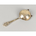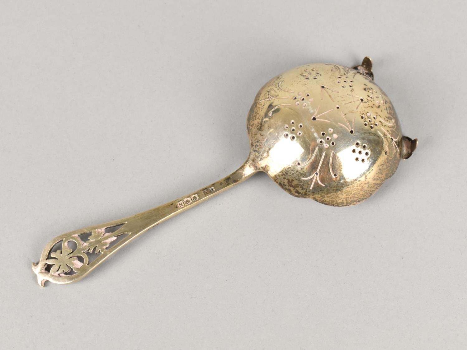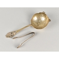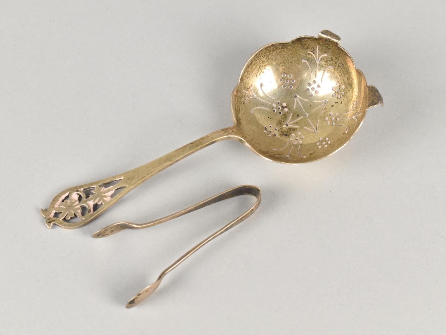 A Silver Tea Straining Spoon by Viner's Ltd (Emile Viner) with Pierced Floral Finial, 14cm Long Together with a Small Pair of Sugar Nips, 52g Total Silver Weight