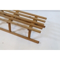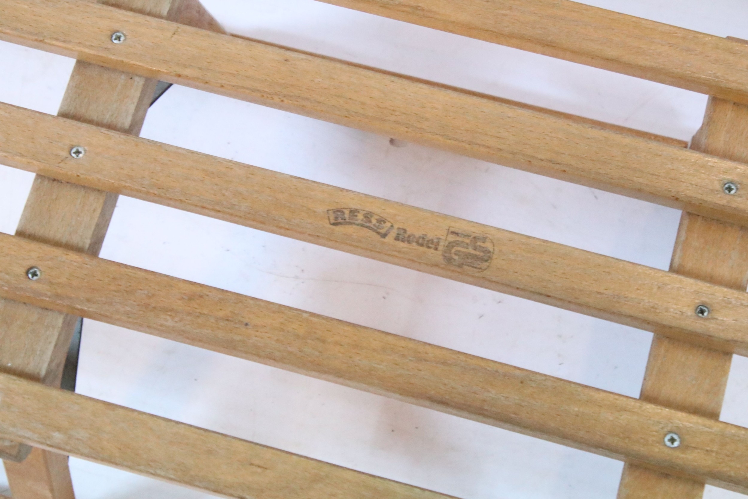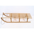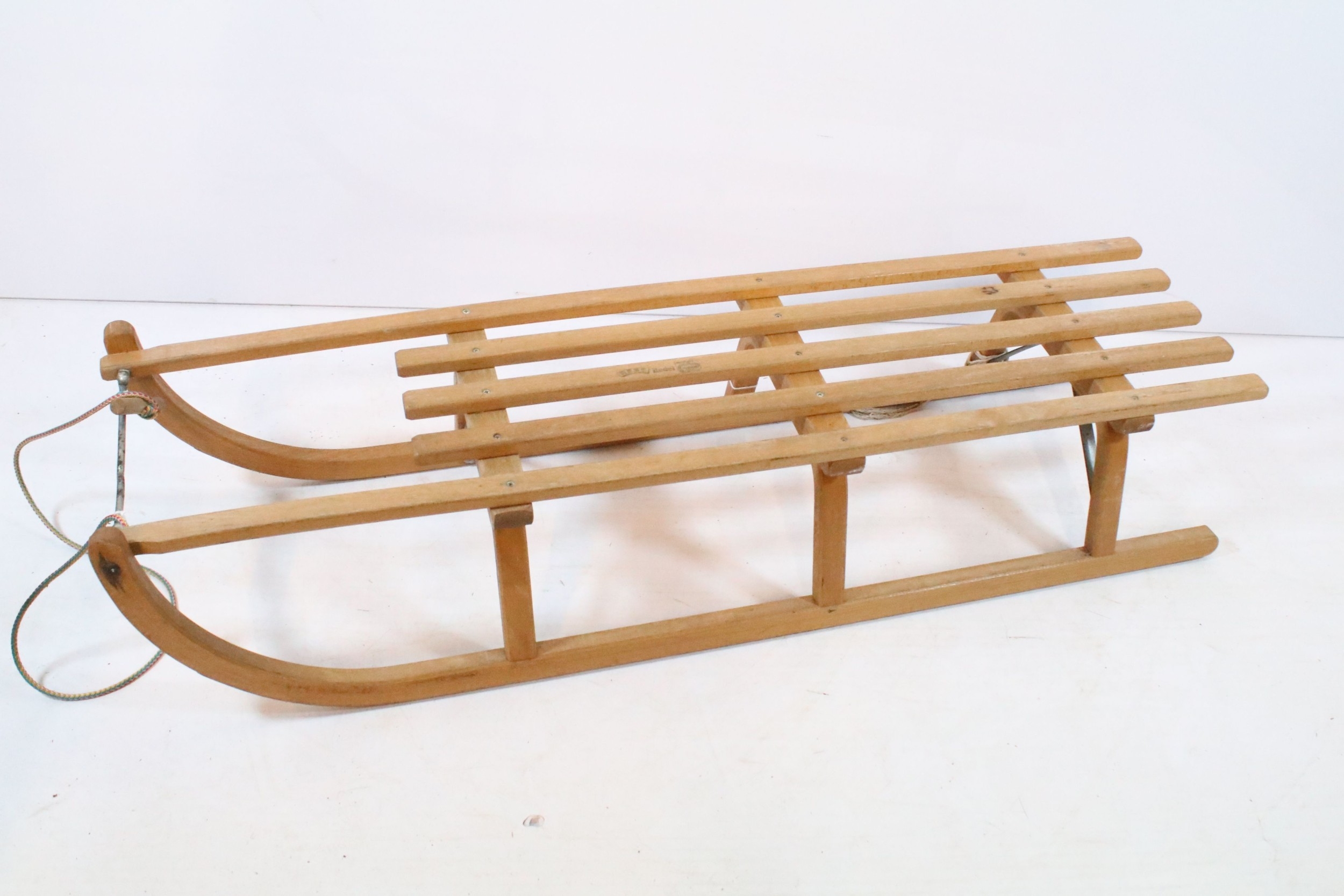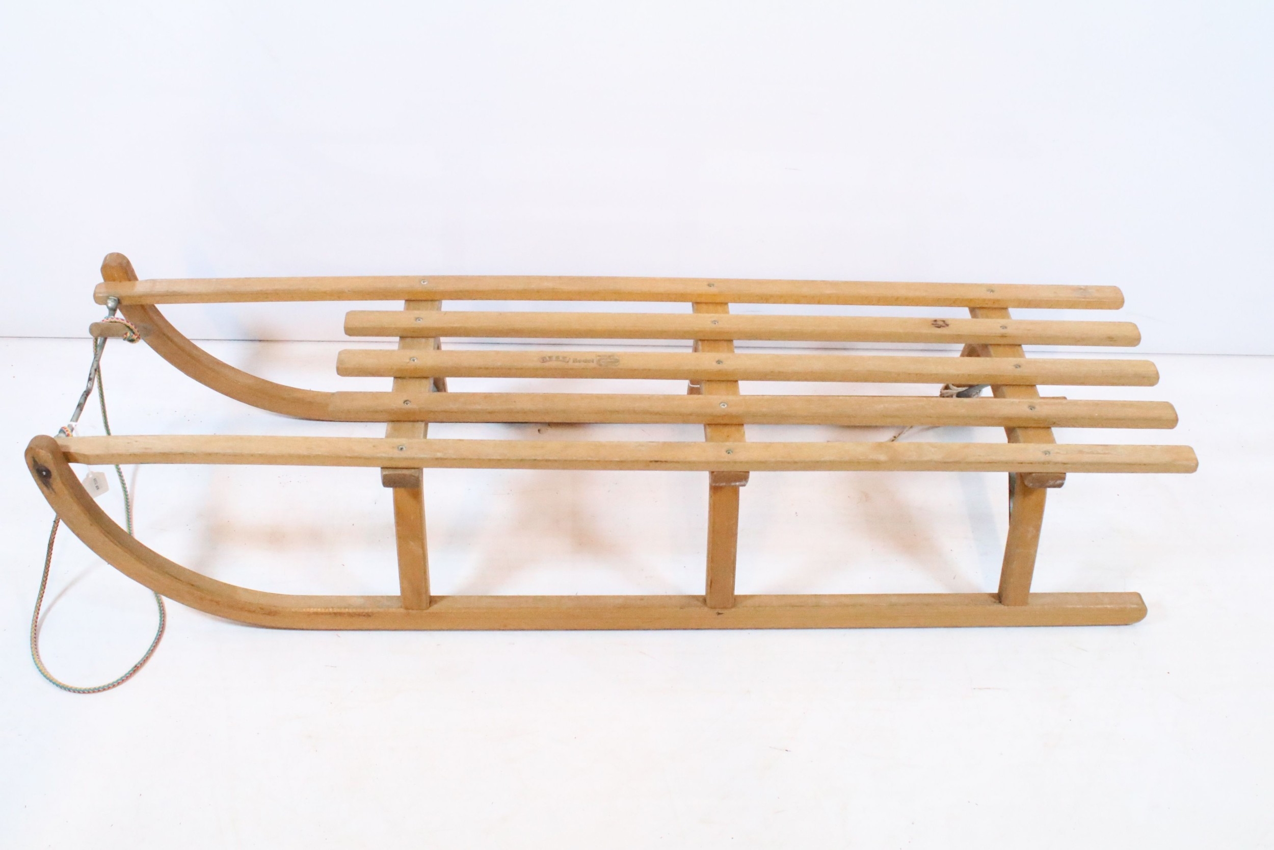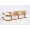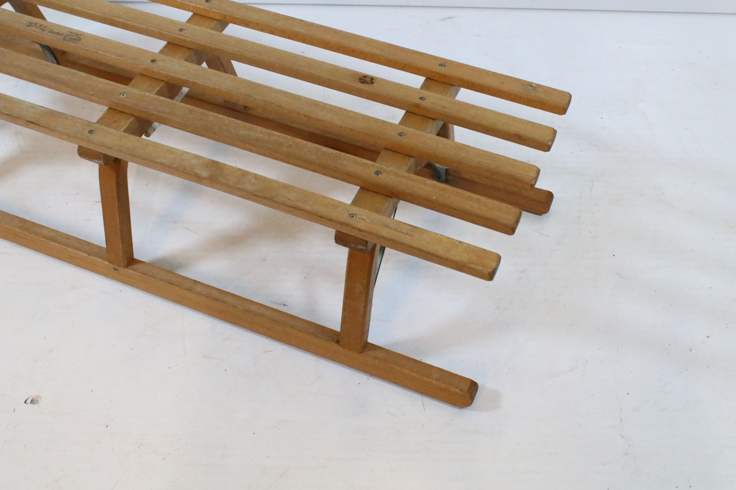 Traditional wooden sleigh by Ress, having slatted top and metal bound tread, L 101cm (approx)