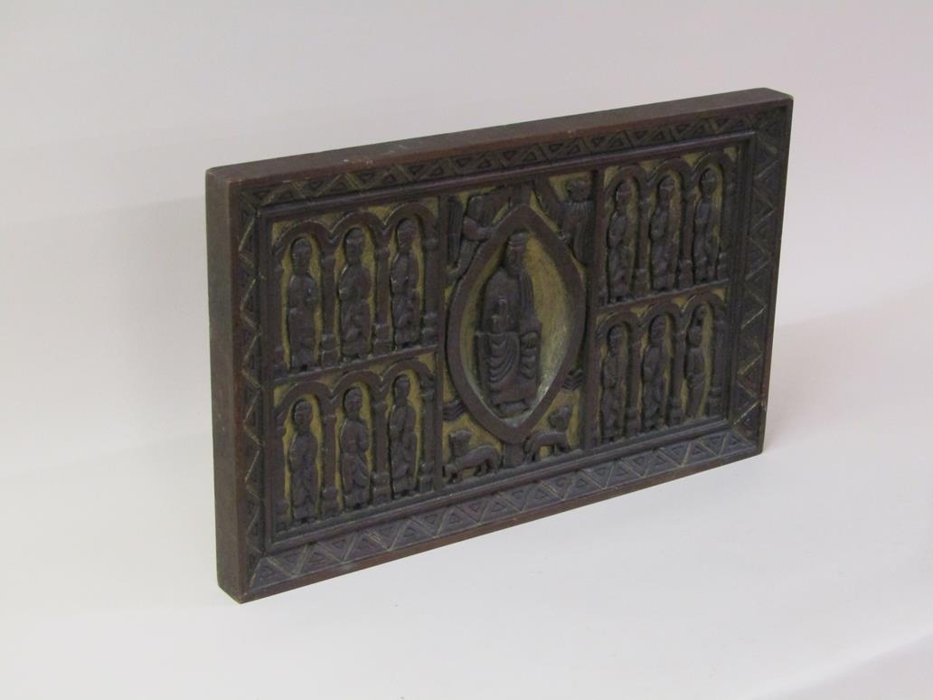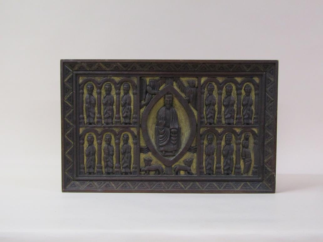 A 19c carved and stained plaque with gilt highlights, Jesus and the twelve Apostles, 39cm x 63cm.