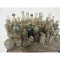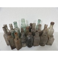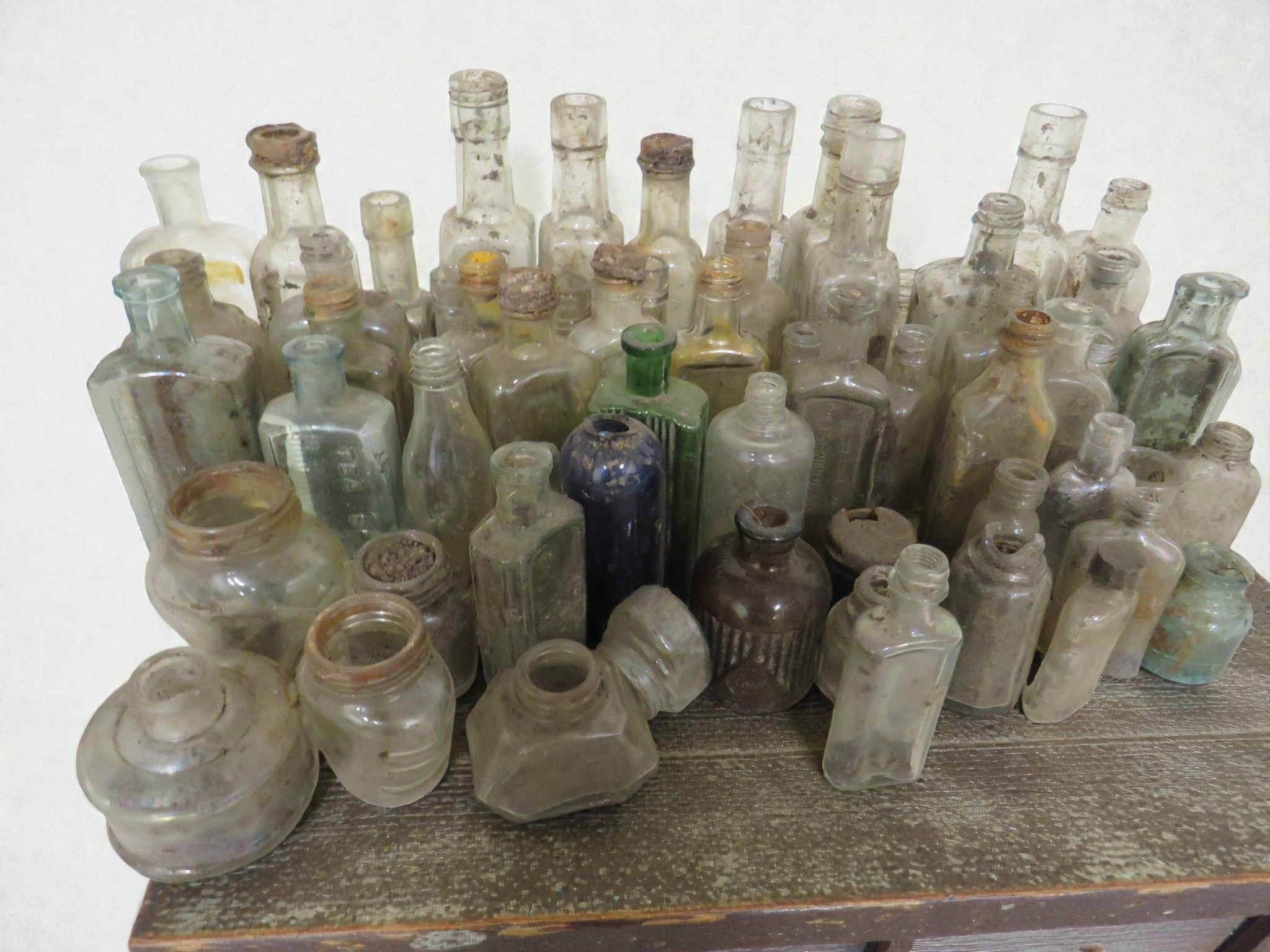 Substantial collection of vintage glass bottles numbering approximately 55-60 pieces. This extensive lot features predominantly clear and green glass bottles in a wide variety of forms including hexagonal ink bottles, cylindrical medicine bottles, decorative poison bottles, and various household vessels. The collection shows excellent range with examples from small 2-inch ink bottles to larger 8-inch pieces. Many bottles display attractive iridescence and rainbow staining from ground contact, highly sought after by collectors. Notable features include original cork and glass stoppers on several examples, embossed maker's marks, and varied bottle shapes including round, square, hexagonal, and decorative forms. Colors include clear, various shades of green, amber, and aqua glass. Mixed condition throughout with typical surface wear, staining, and minor chips commensurate with age. An excellent lot for the bottle collector or dealer.