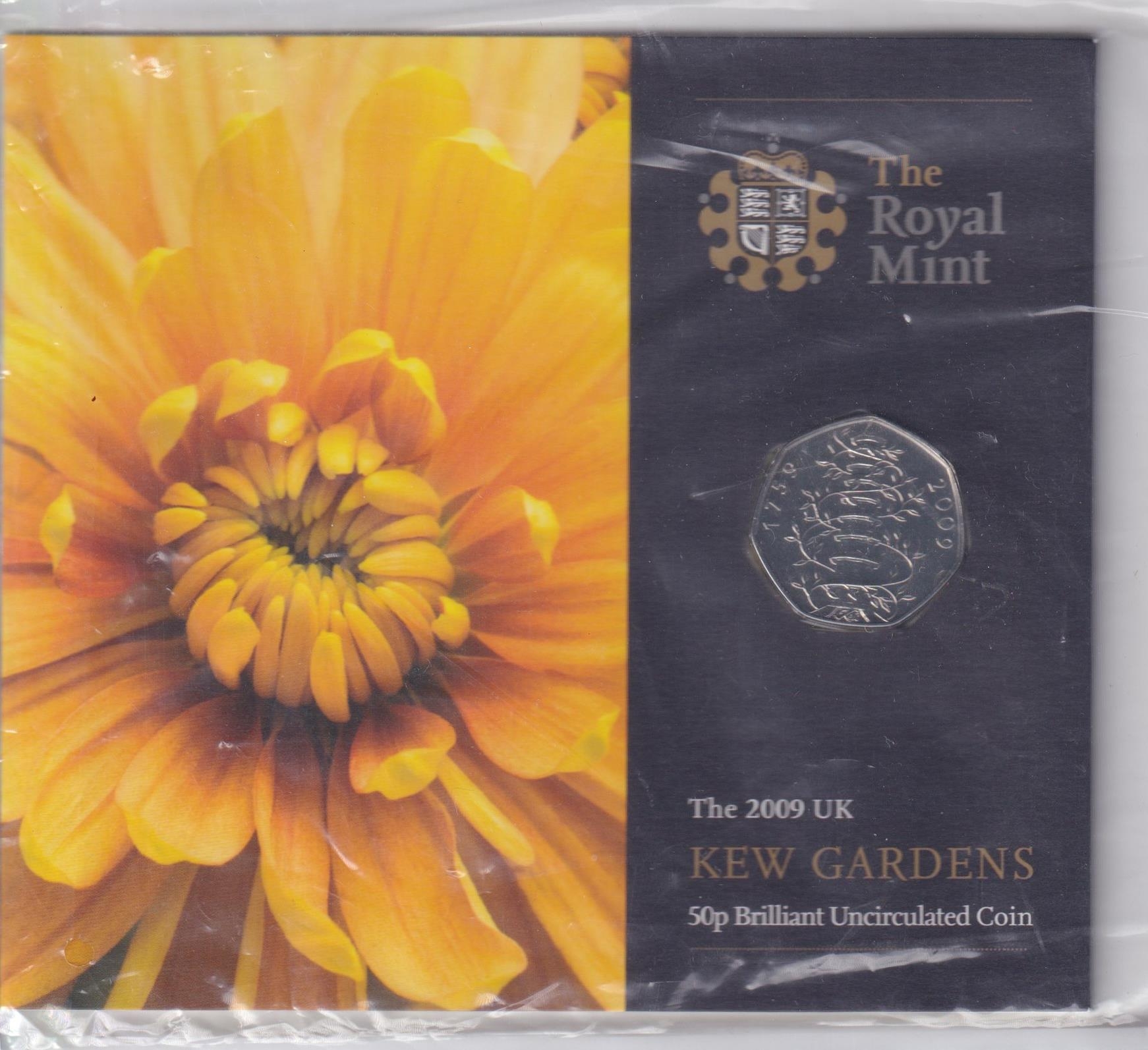 UK 2009 Kew Gardens Brilliant Uncirculated 50p coin, on original presentation card in sealed pack