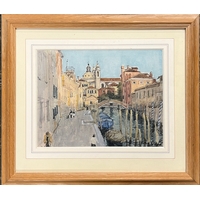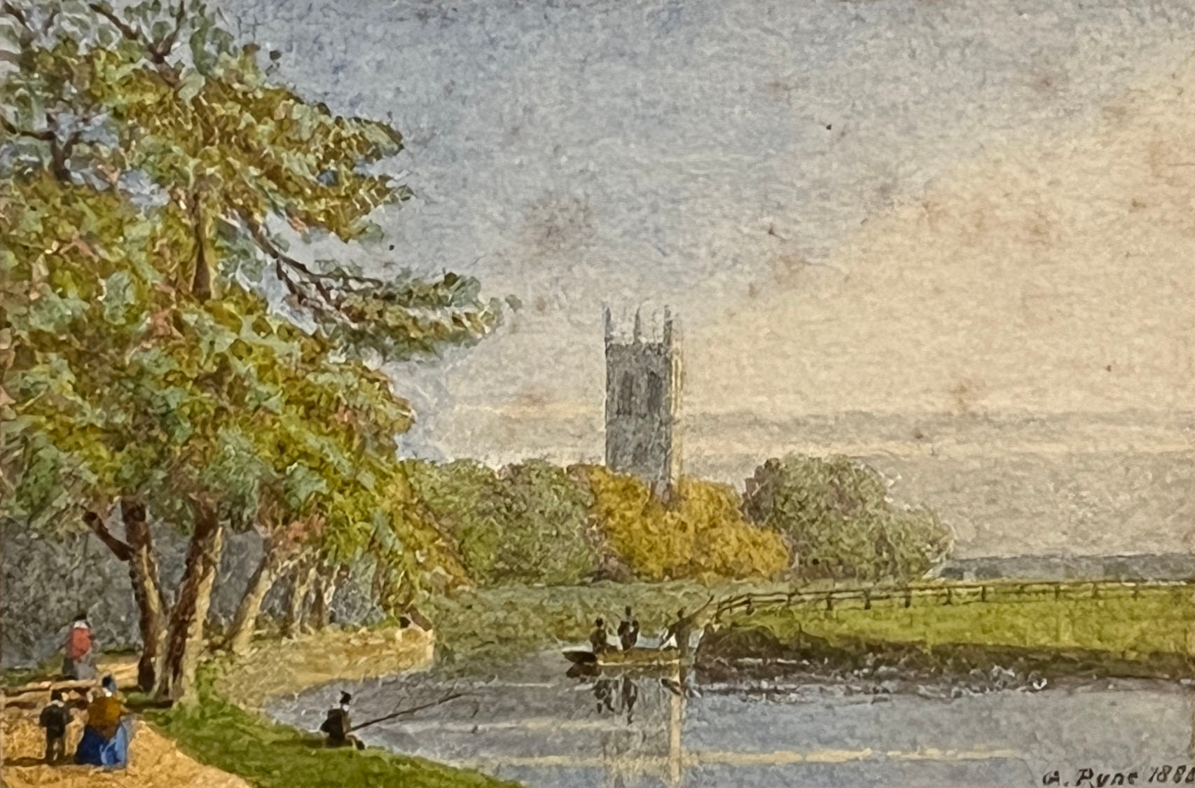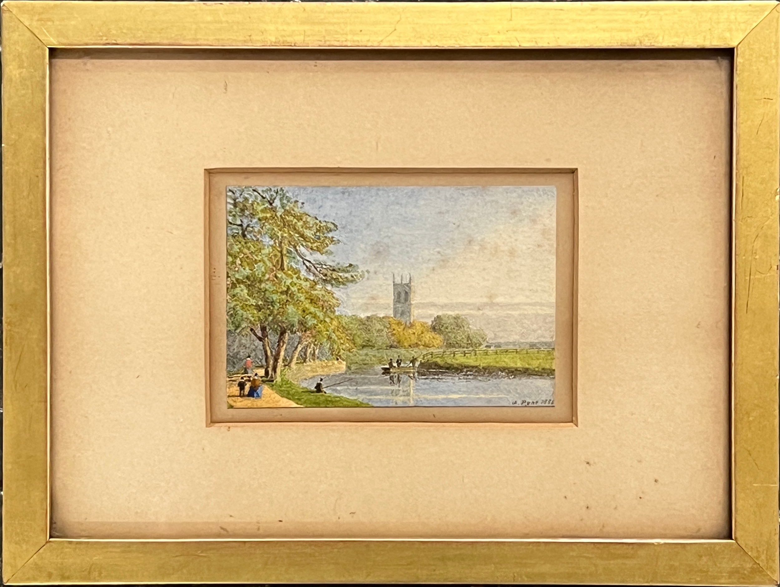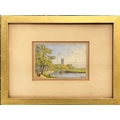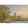 Oxford interest: George Pyne (1800-1884), Magdalen Tower seen from the meadows, signed and dated 1886, 7.5x11cm
