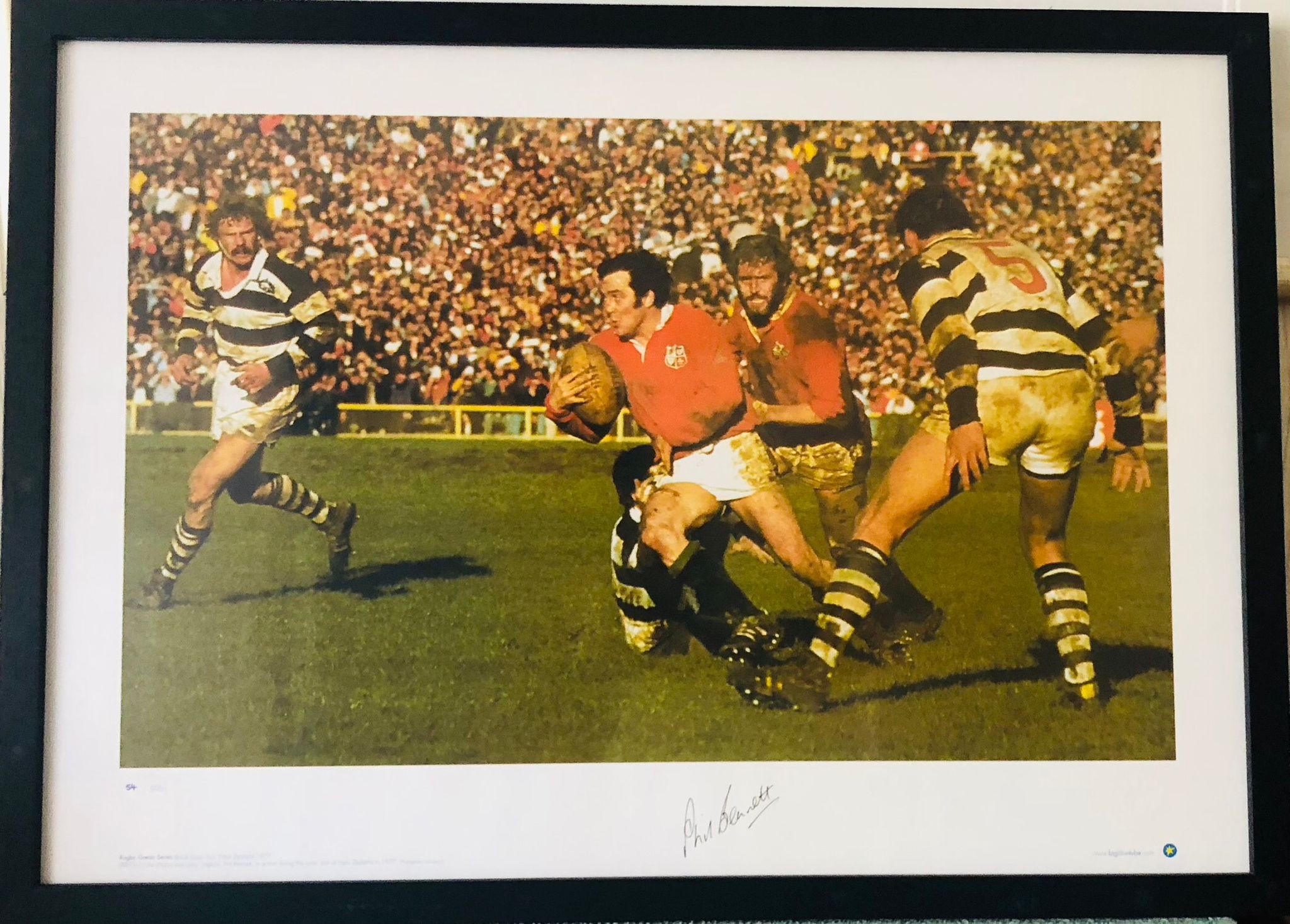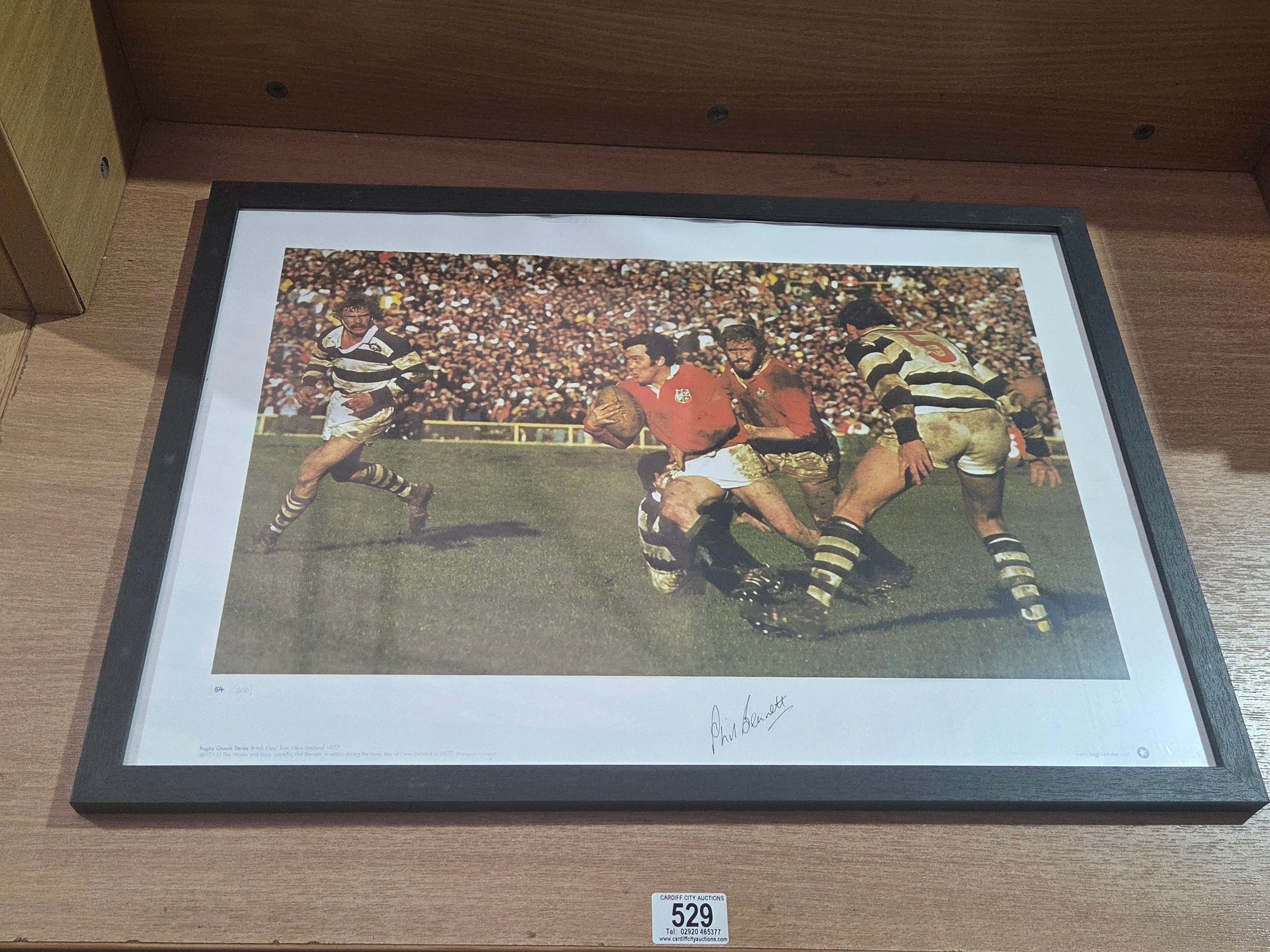 A framed signed photograph - limited edition 54/500 - signed by Welsh rugby player Phil Bennett with certificate of authenticity