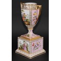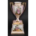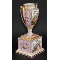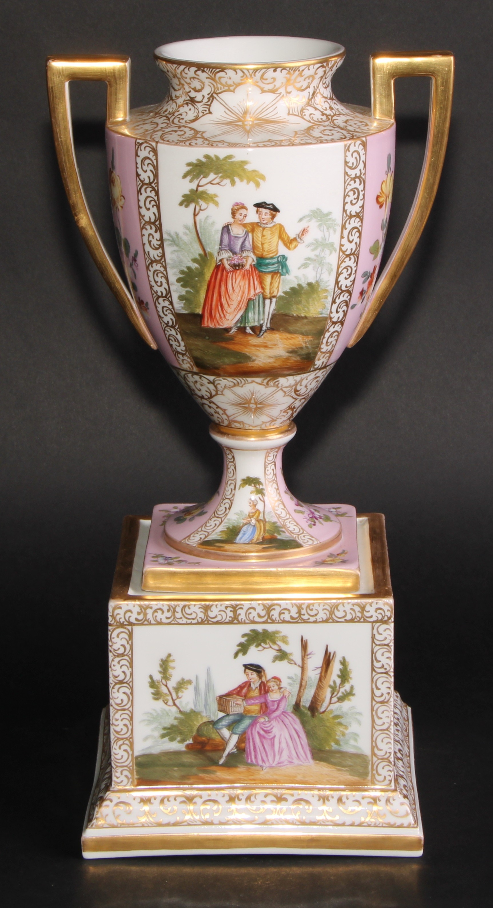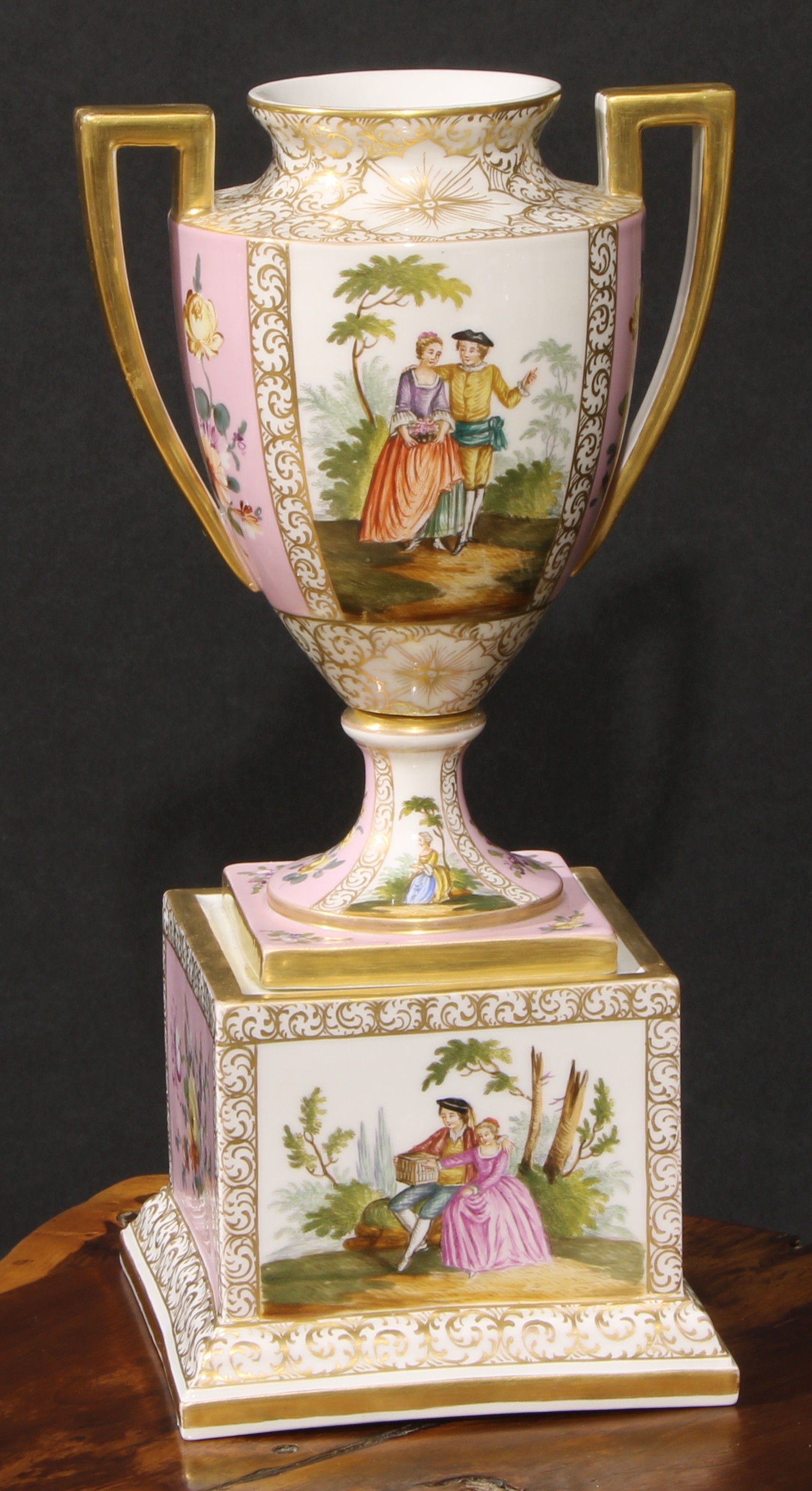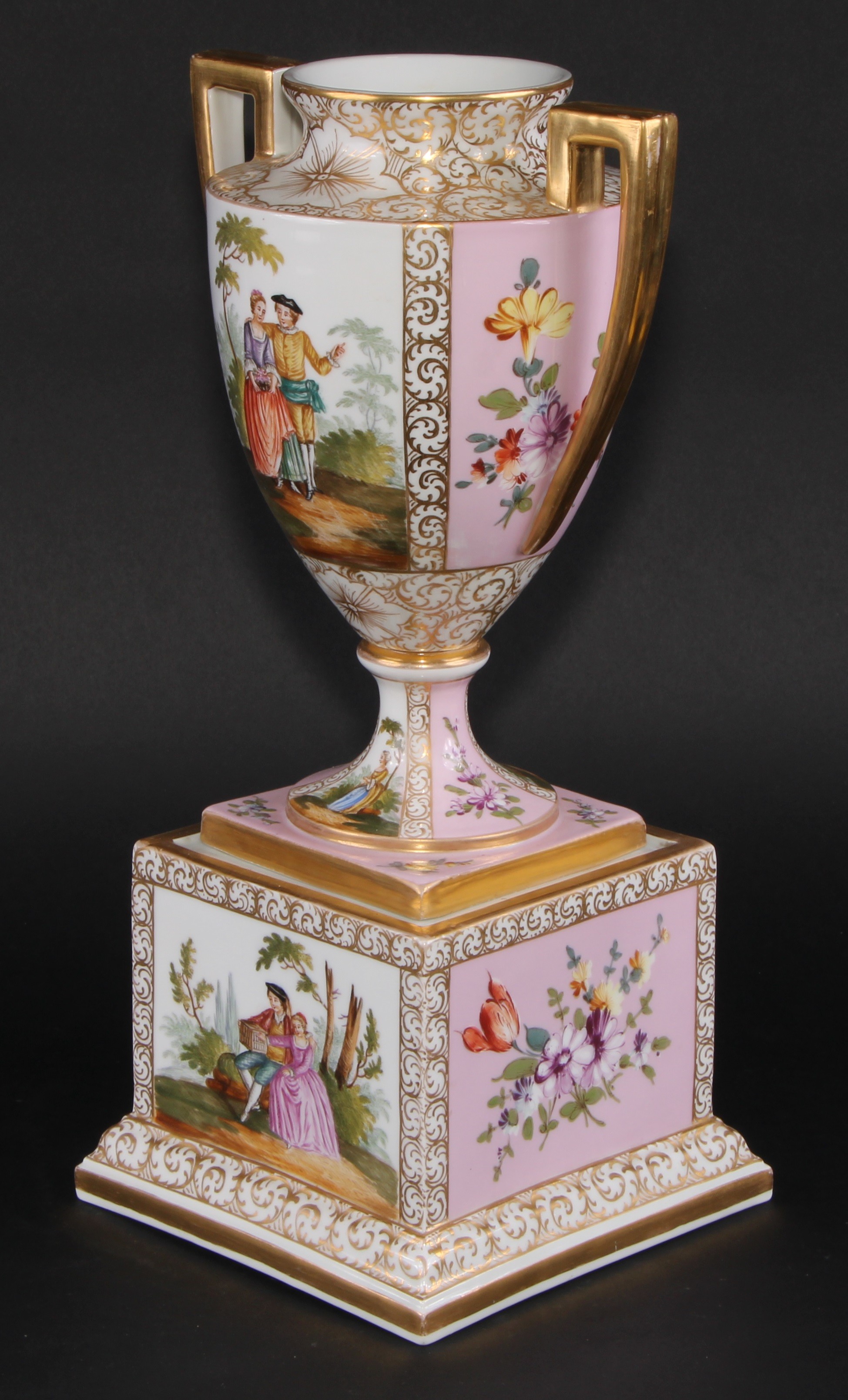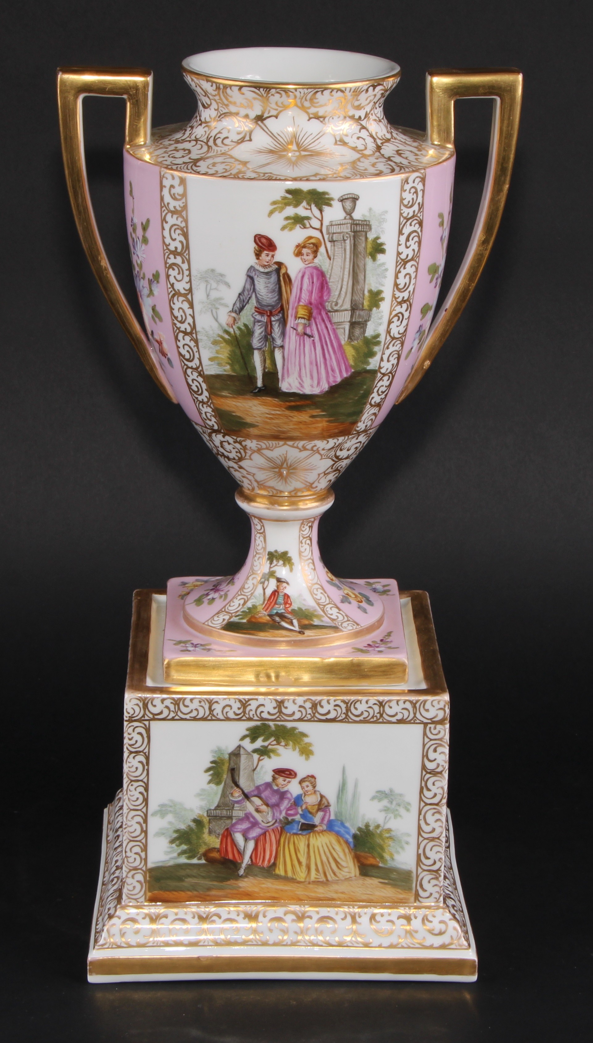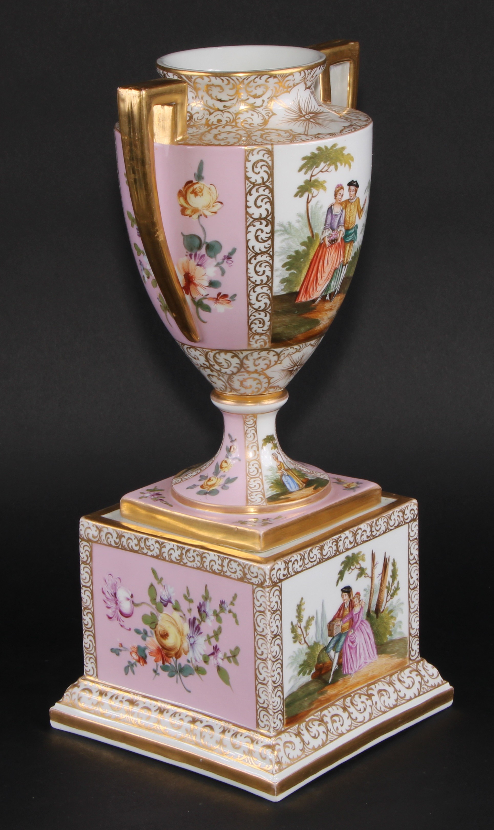 A Dresden porcelain mantel urn, the ovoid vase with angular scroll handles, painted with courting couples on a rose ground, 36.5cm high, crowned D mark, c.1900