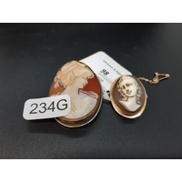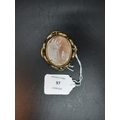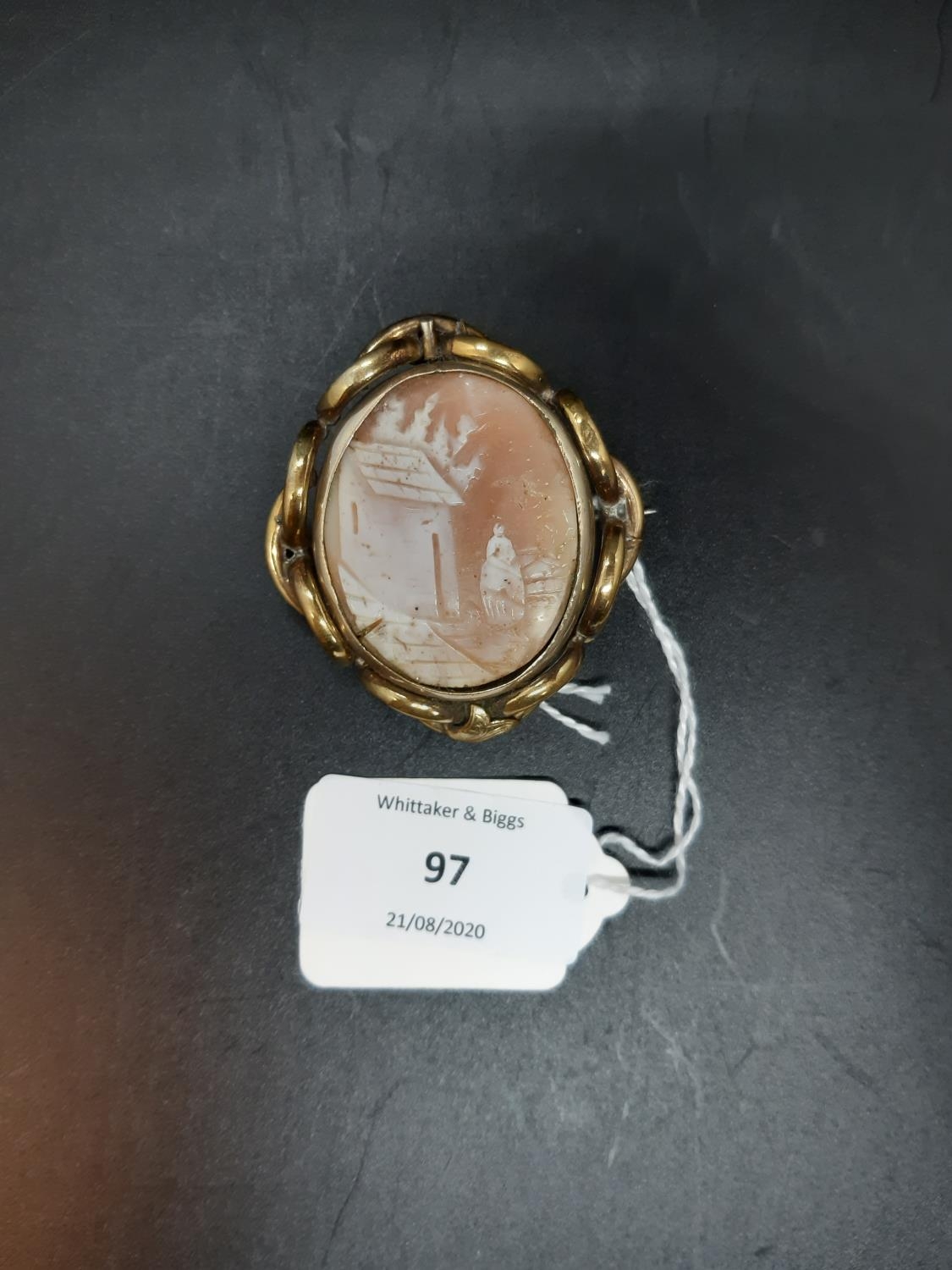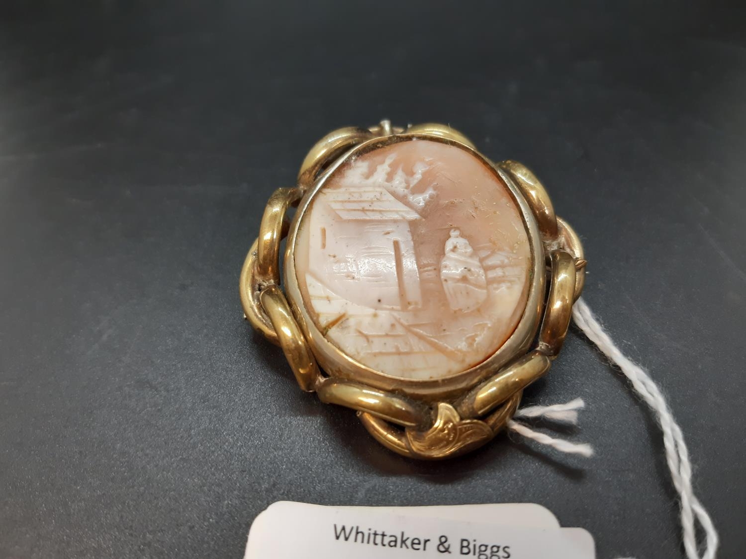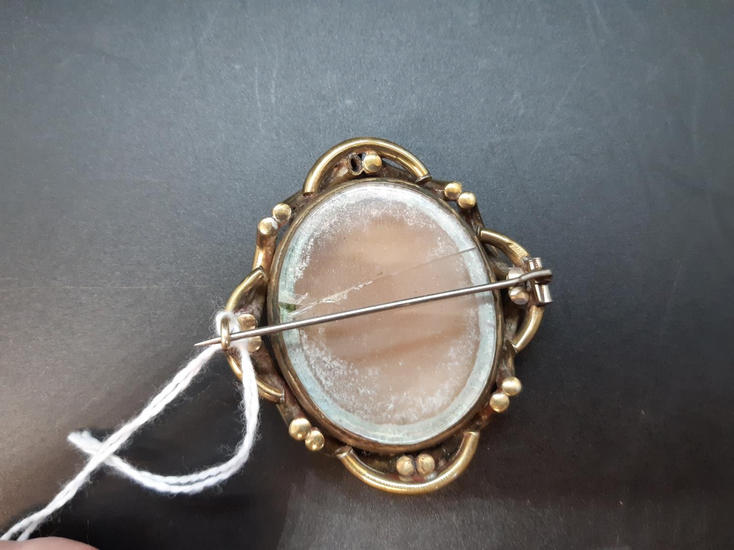 A Victorian ladies oval cameo brooch with unmarked gold coloured surround