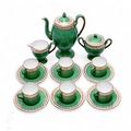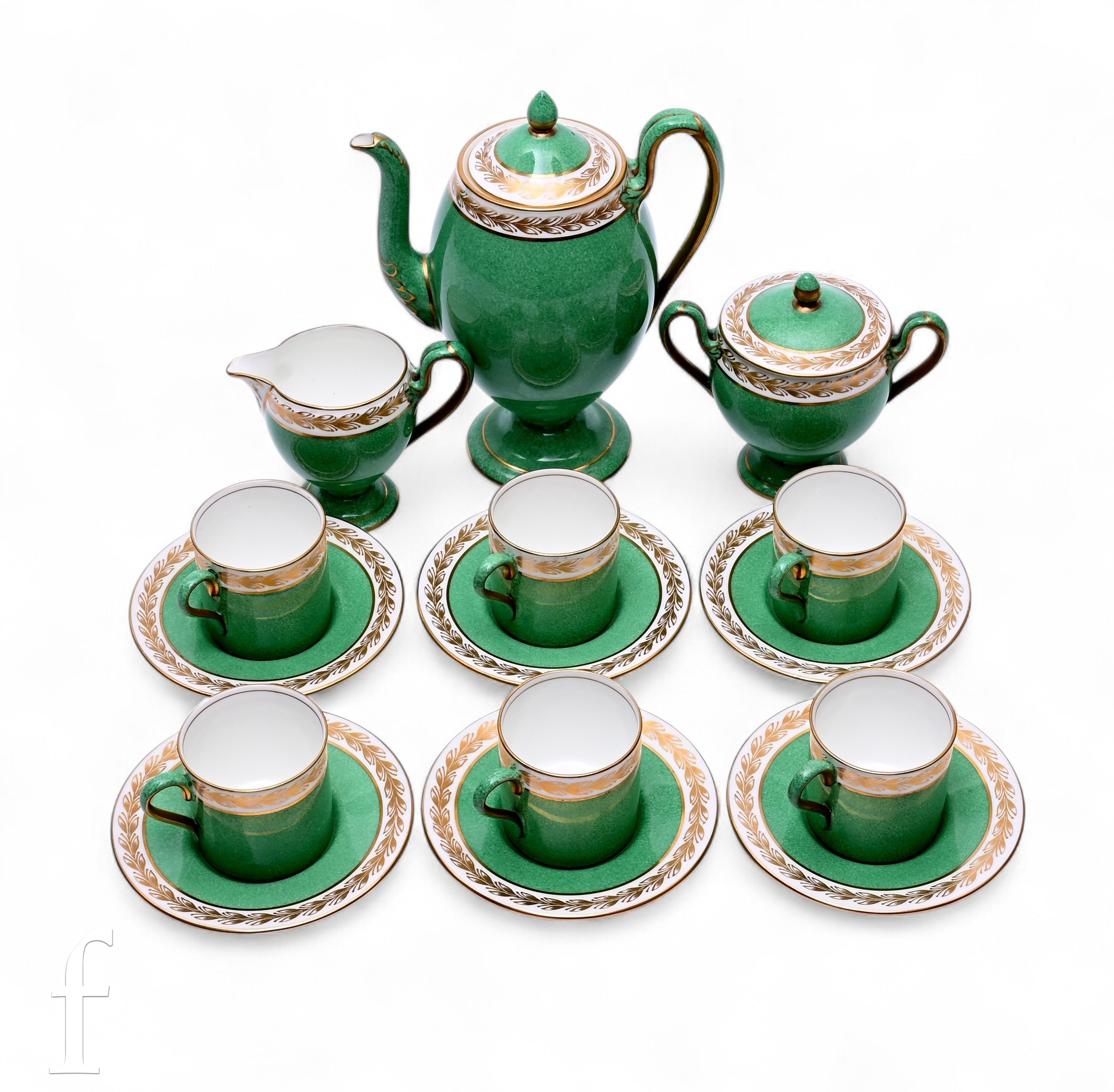 A Wedgwood coffee service, the coffee pot of ovoid footed form with powder green glaze and gilded foliate border, together with six coffee cans and saucers, twin handled sucrier and cover and a cream jug, height 20cm.