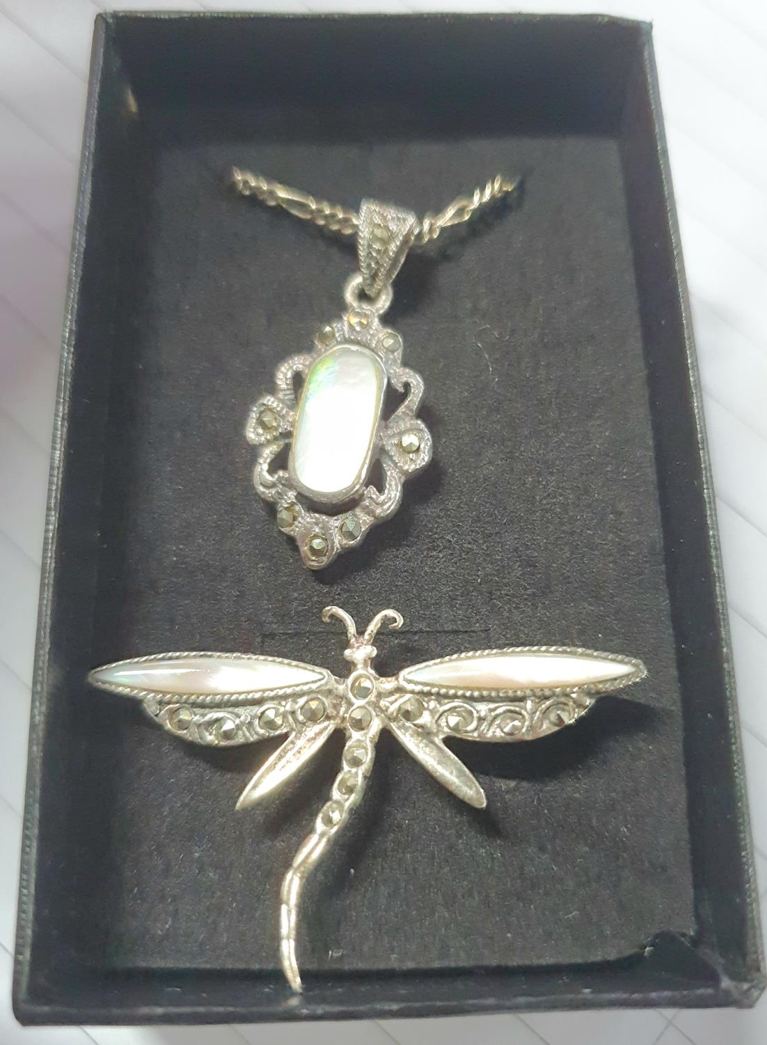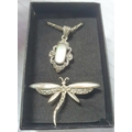 925 silver chain with a 925 silver and marcasite pendant and matching "dragonfly" silver & marcasite brooch (2)