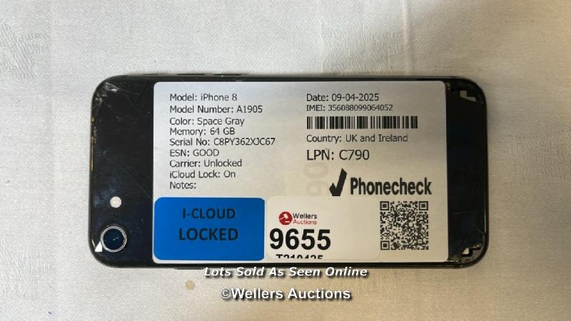 IPHONE 8/ A1905/ SPACE GRAY/64GB/ IMEI-35608899064052 (I-CLOUD LOCKED) (BACK DAMAGED)