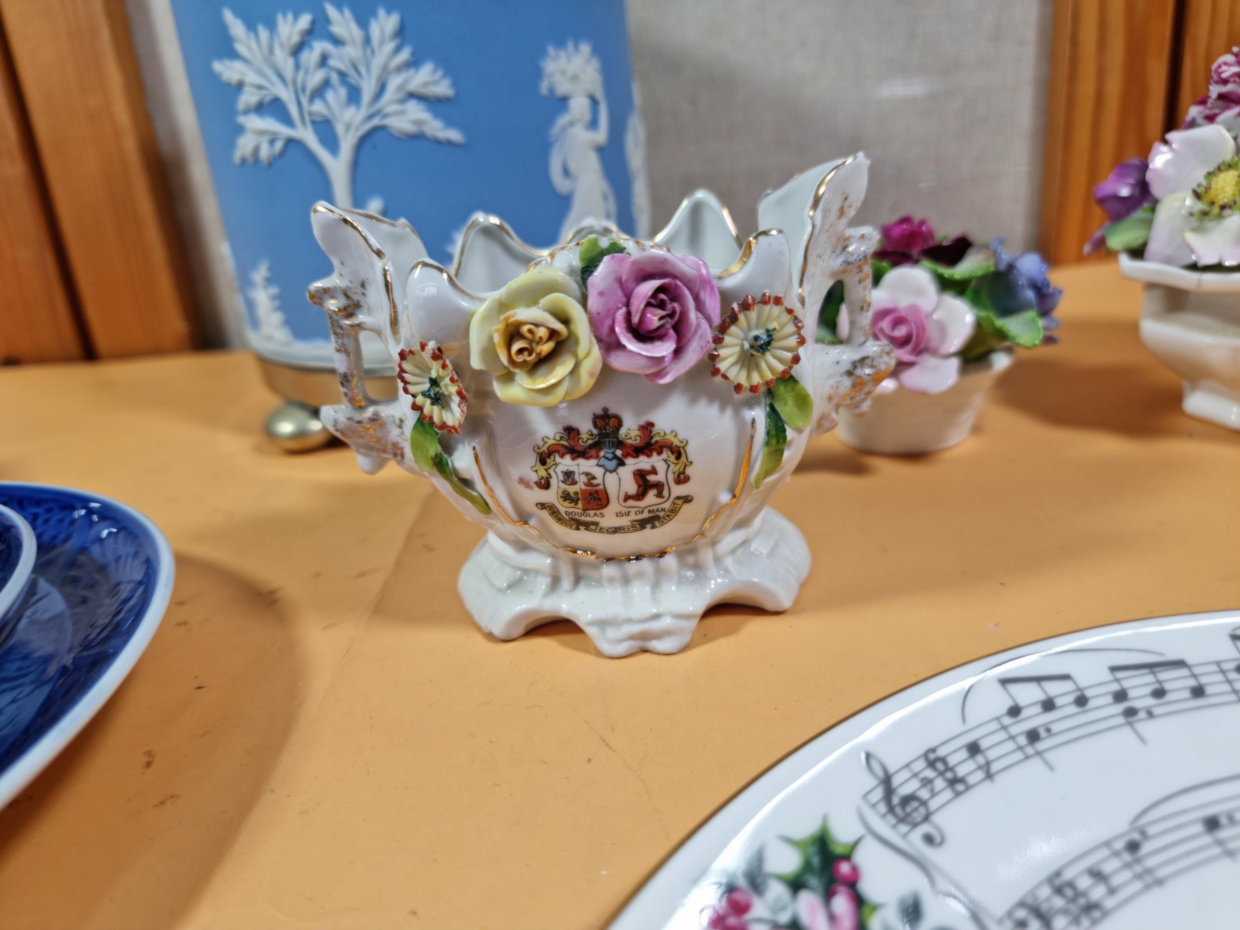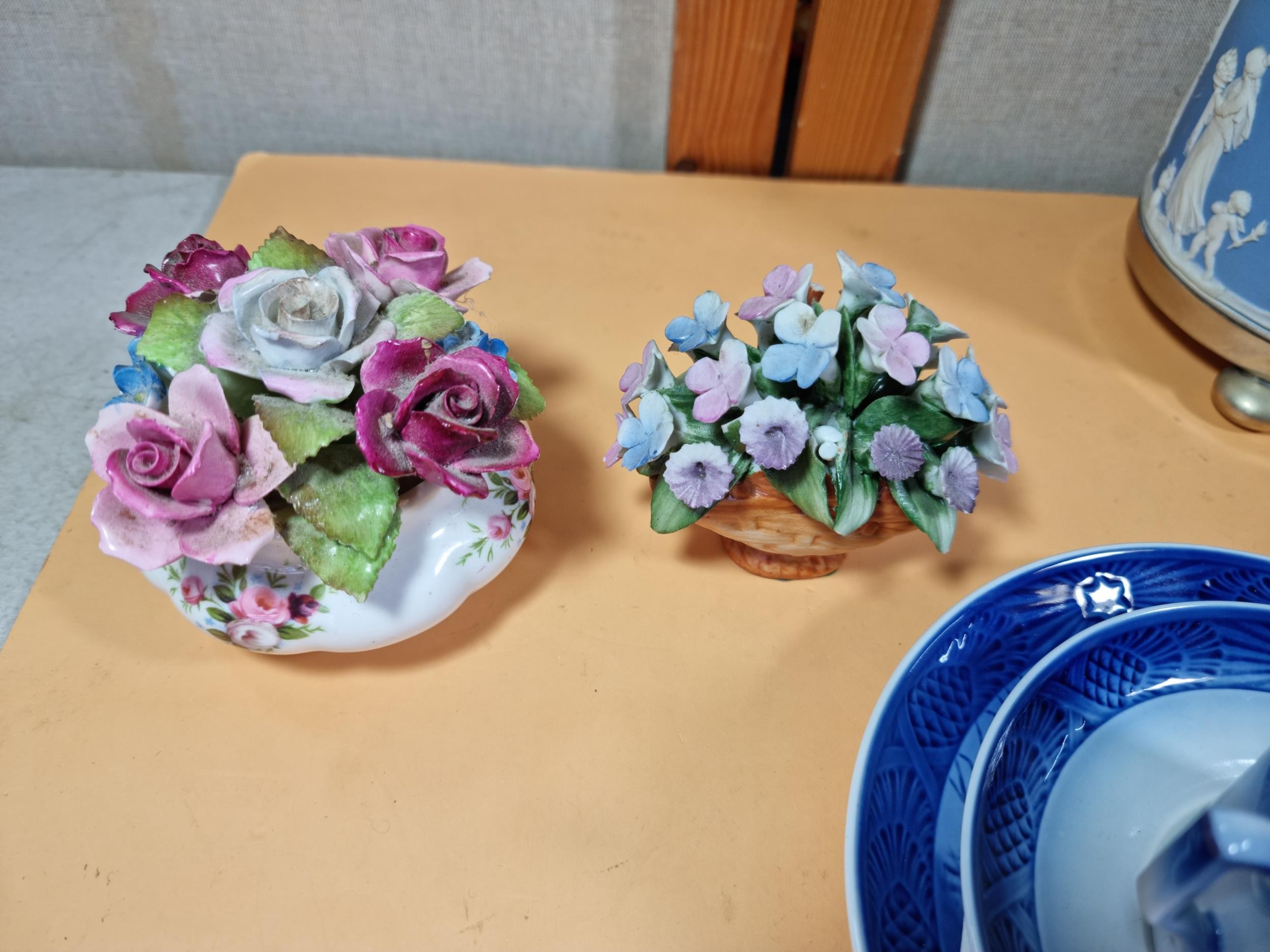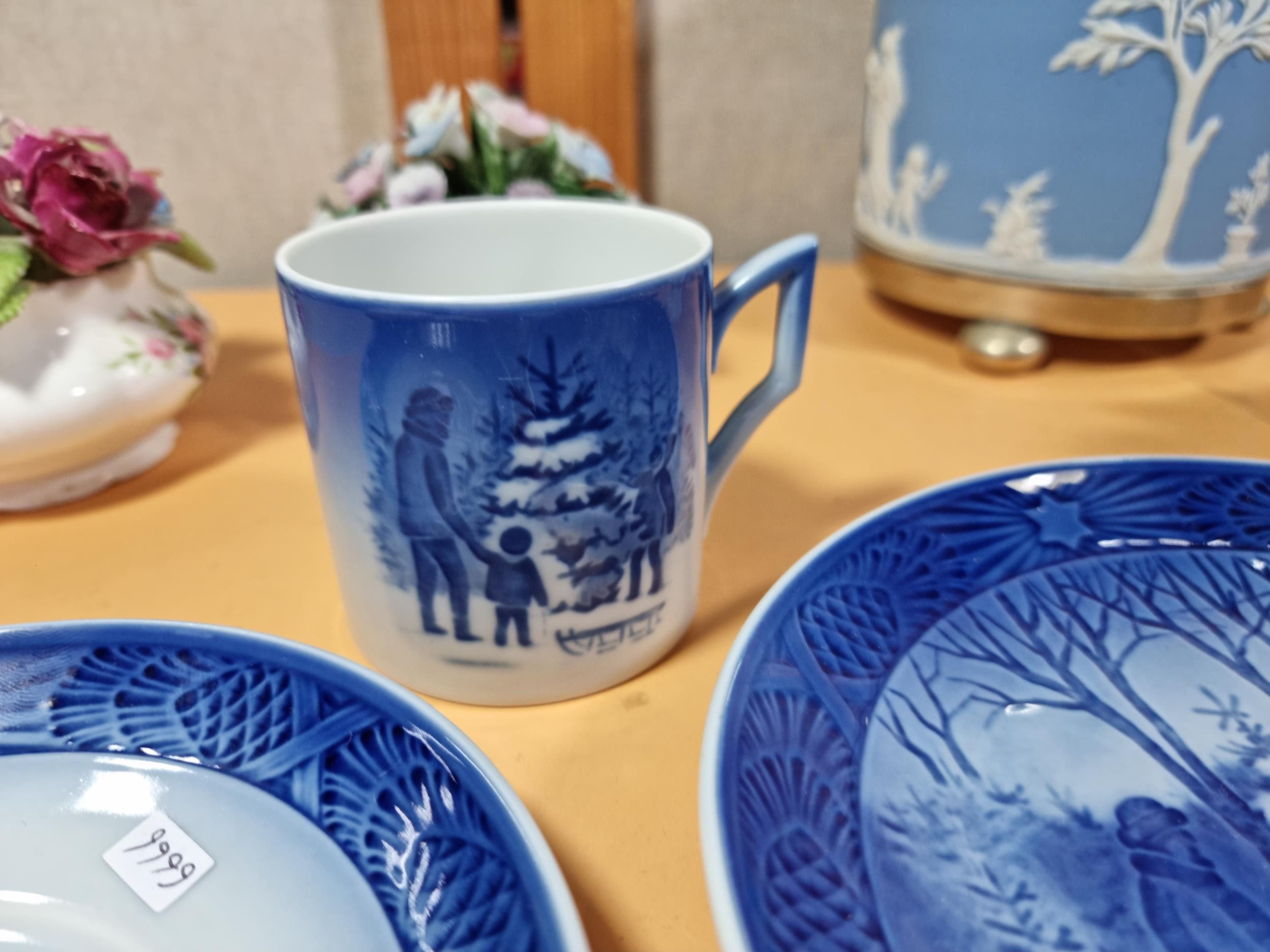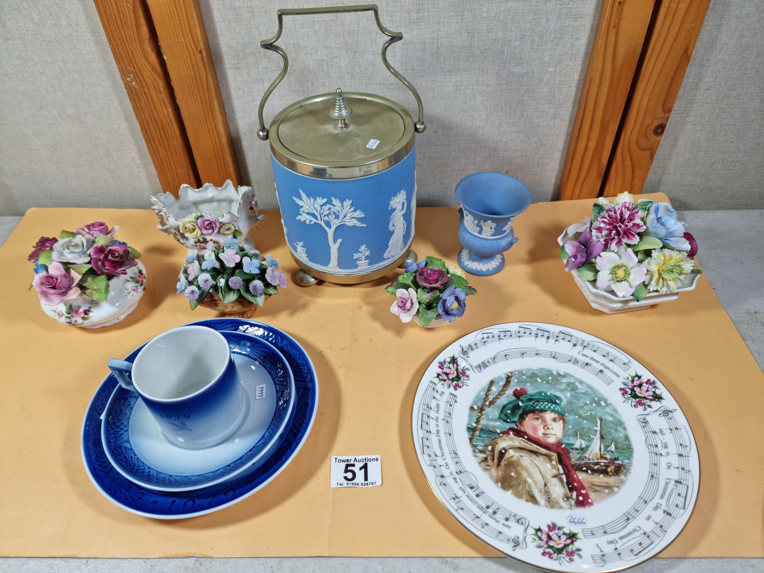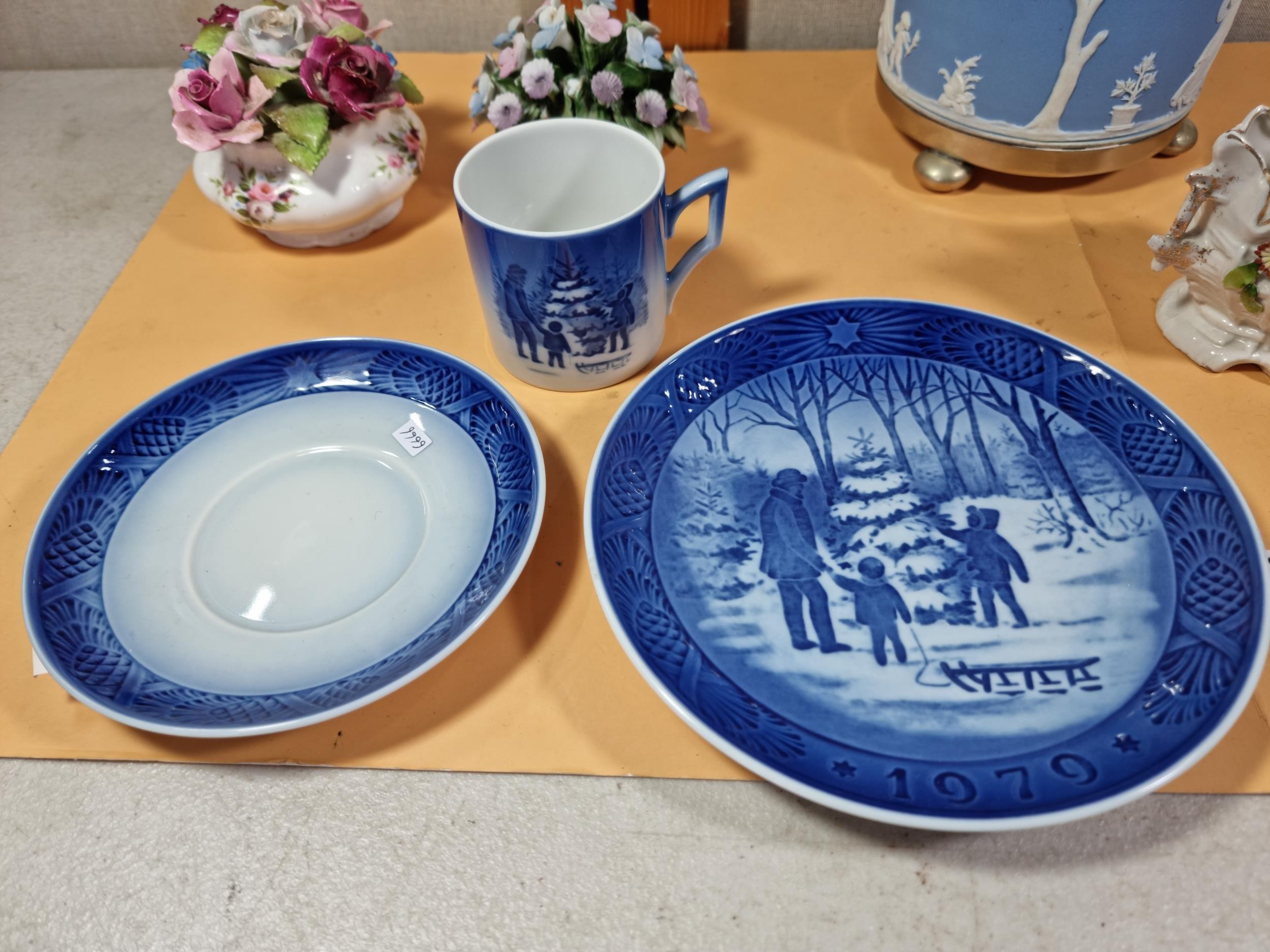 A selection of items to include a quality Royal Copenhagen Christmas plate and cup and saucer set dated 1979 titled 'Choosing the Christmas Tree'. In excellent condition throughout. Plate diameter is 18cm. Other items include other collectables to inc Royal Doulton, Wedgwood Jasperware biscuit barrel, Royal Albert, Aynsley Porcelain flowers etc. See photographs for more details.