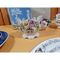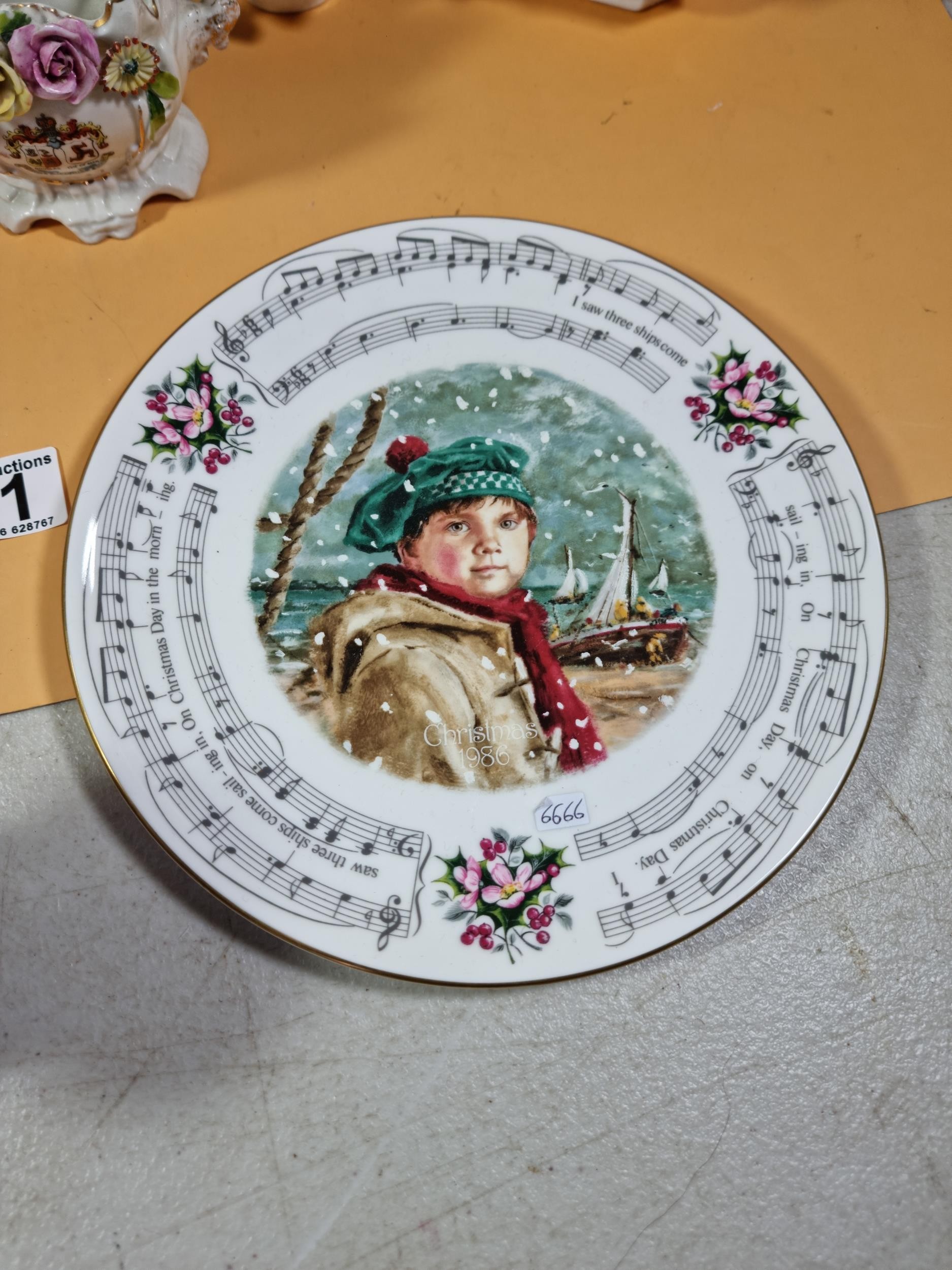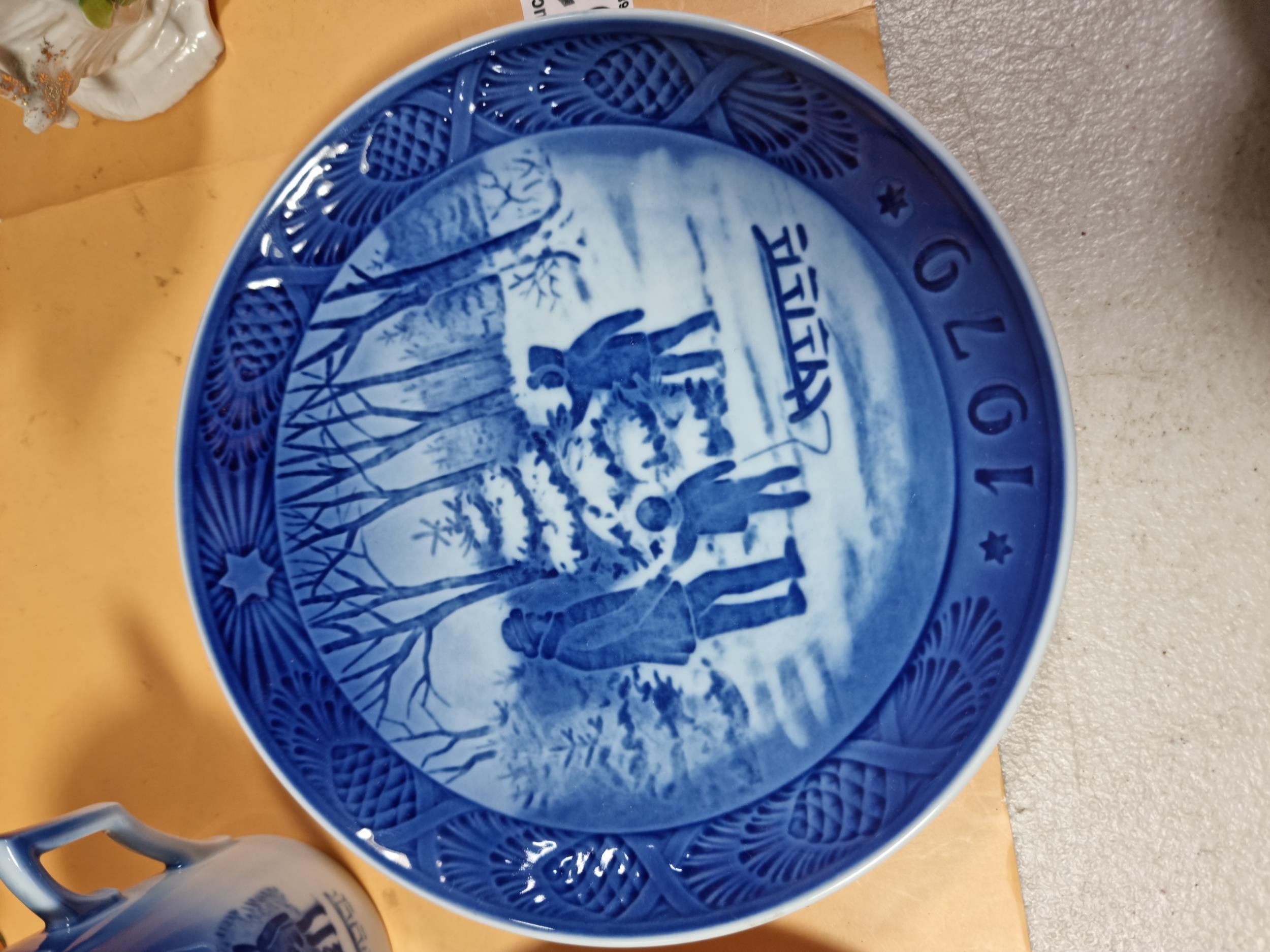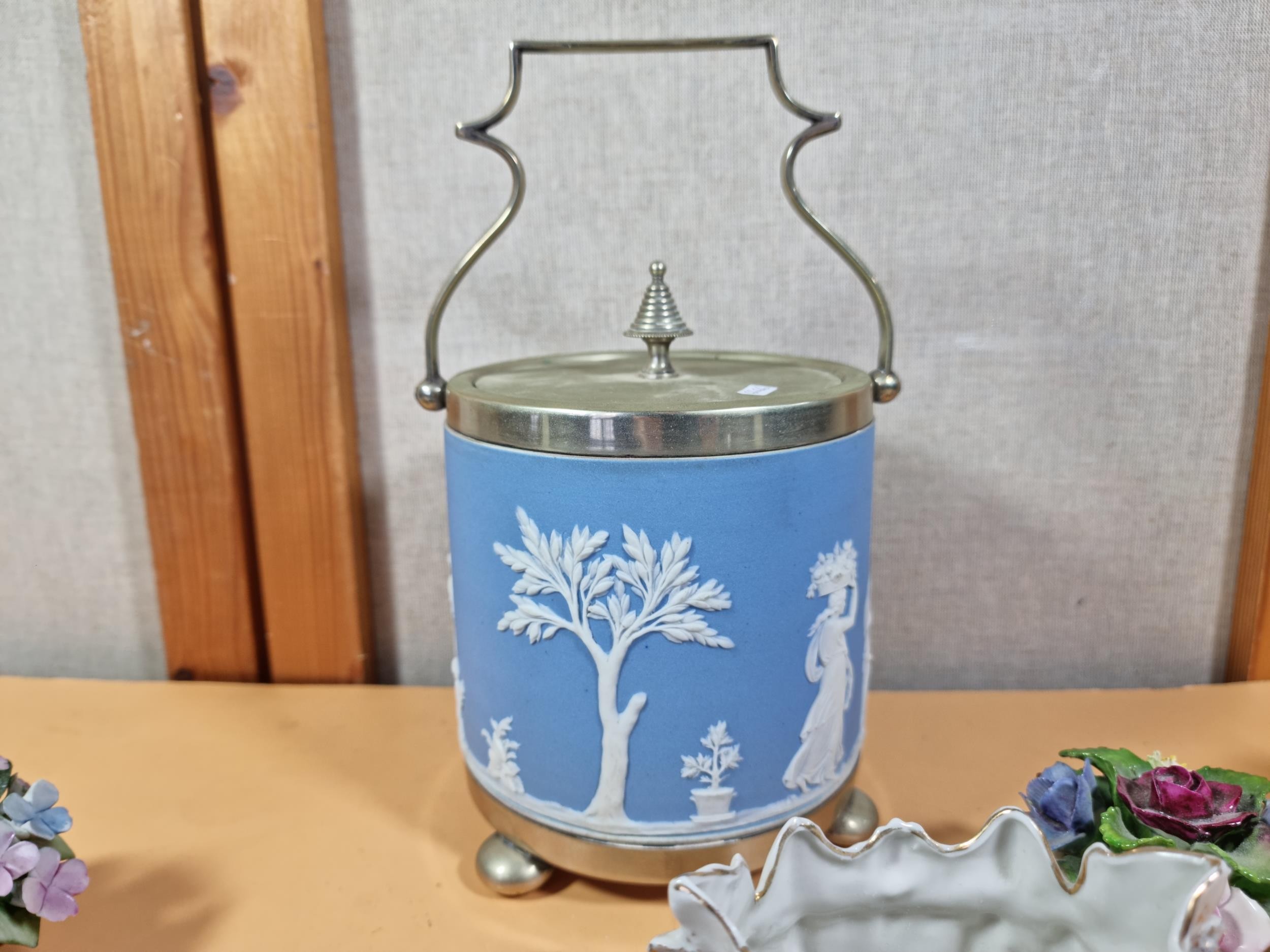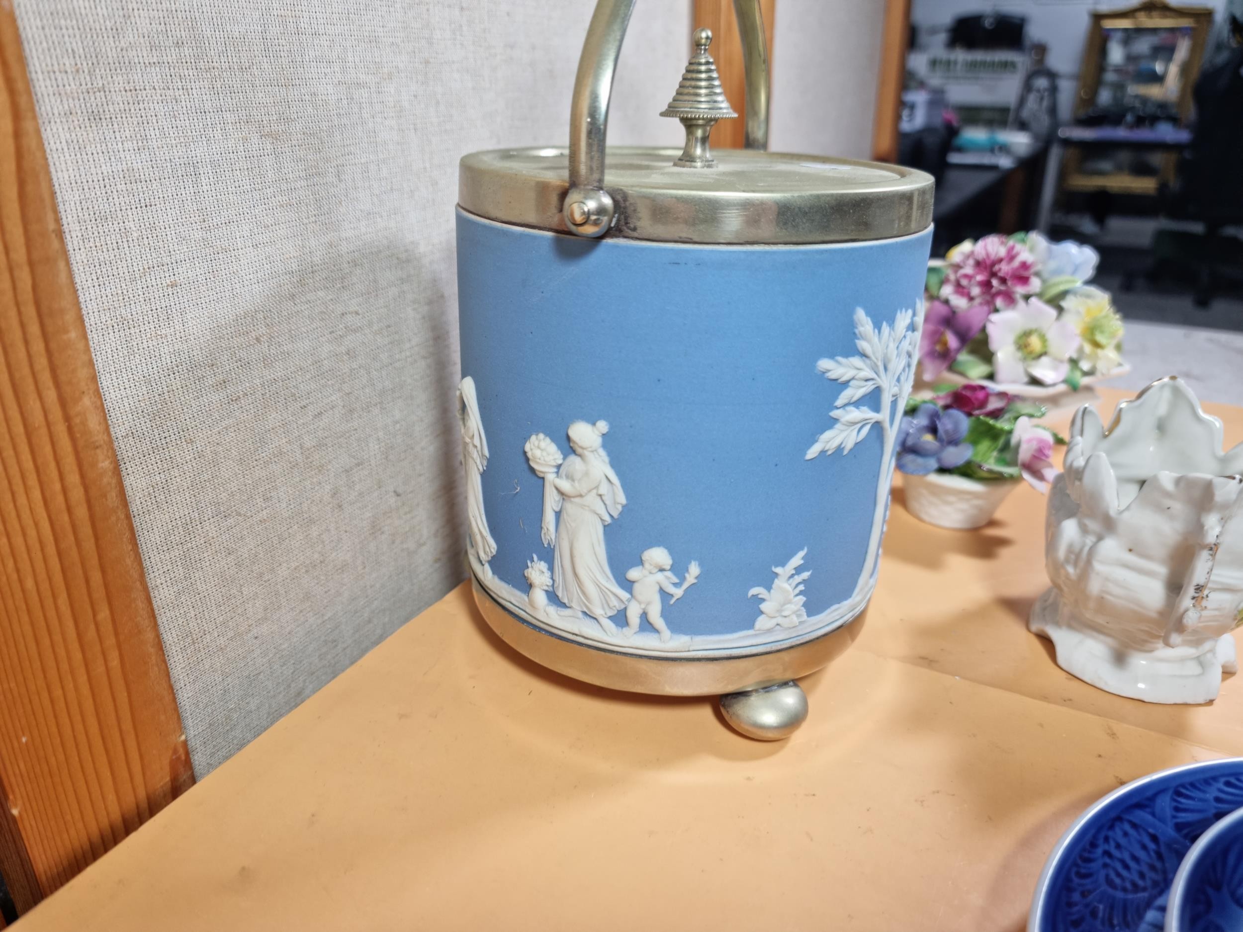 A selection of items to include a quality Royal Copenhagen Christmas plate and cup and saucer set dated 1979 titled 'Choosing the Christmas Tree'. In excellent condition throughout. Plate diameter is 18cm. Other items include other collectables to inc Royal Doulton, Wedgwood Jasperware biscuit barrel, Royal Albert, Aynsley Porcelain flowers etc. See photographs for more details.