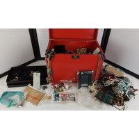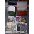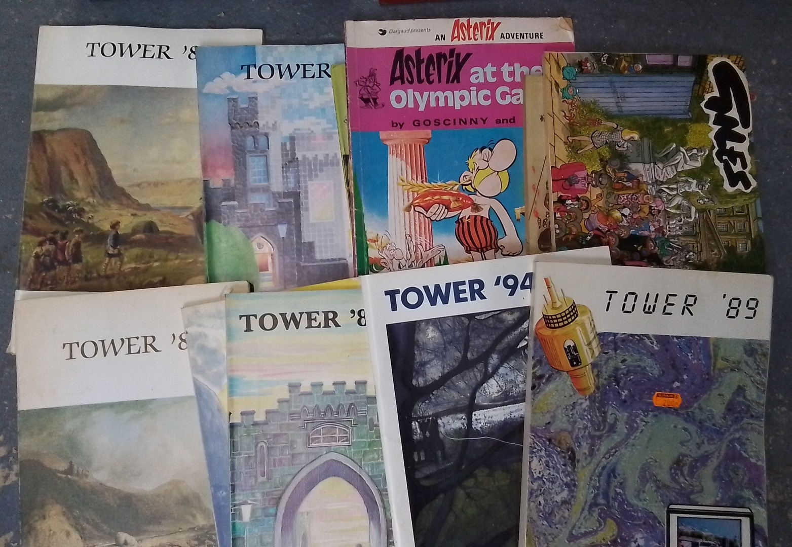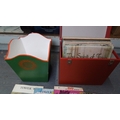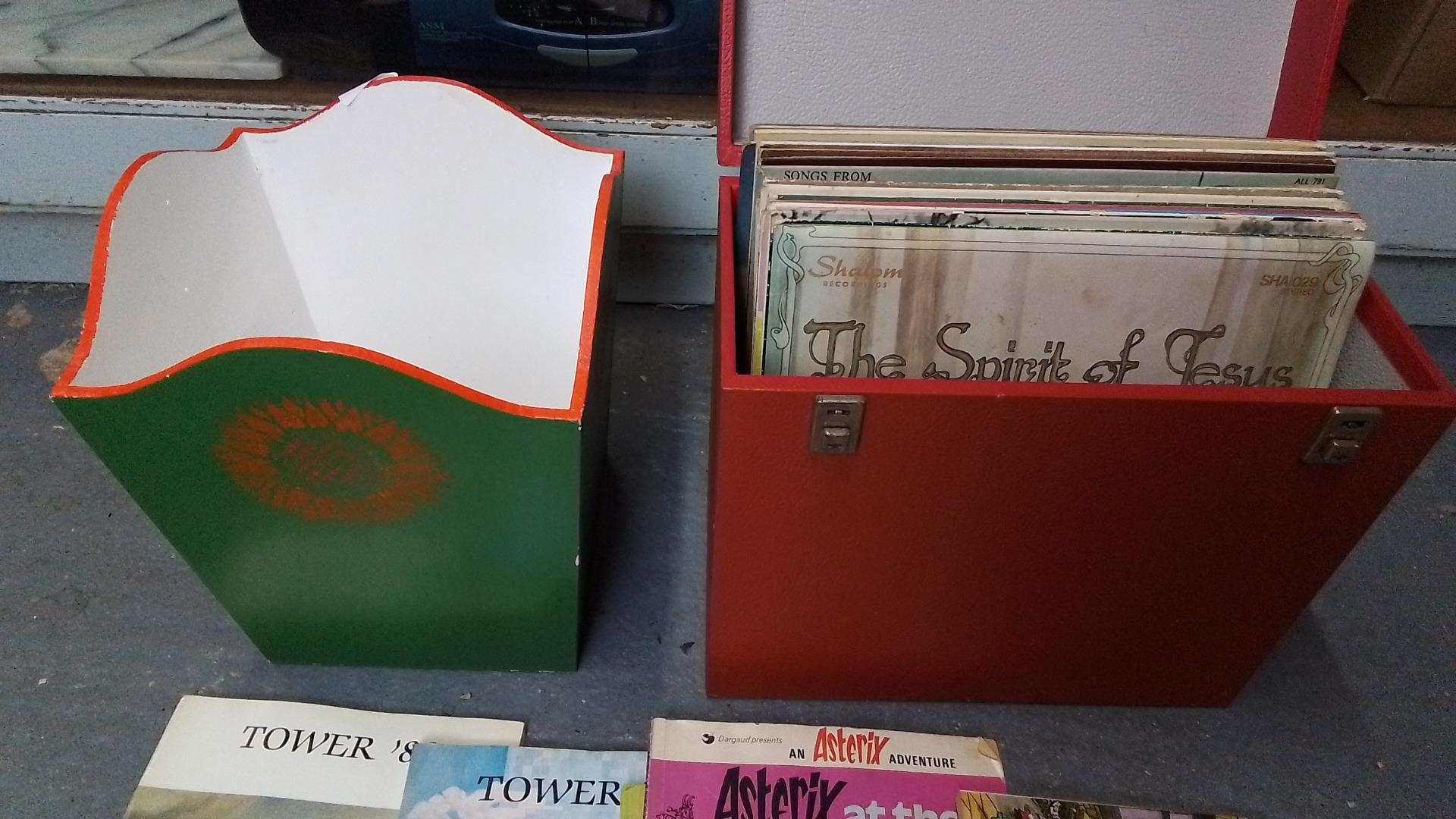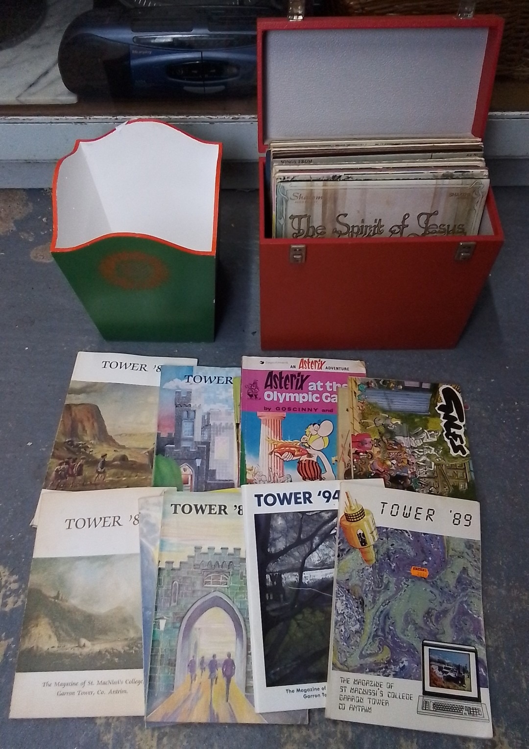Group of vinyl records in a red carrying case, with a hand-painted waste paper bin and a small selection of printed items including St. MacNasius’s College ‘Tower’ magazines and an Asterix book.