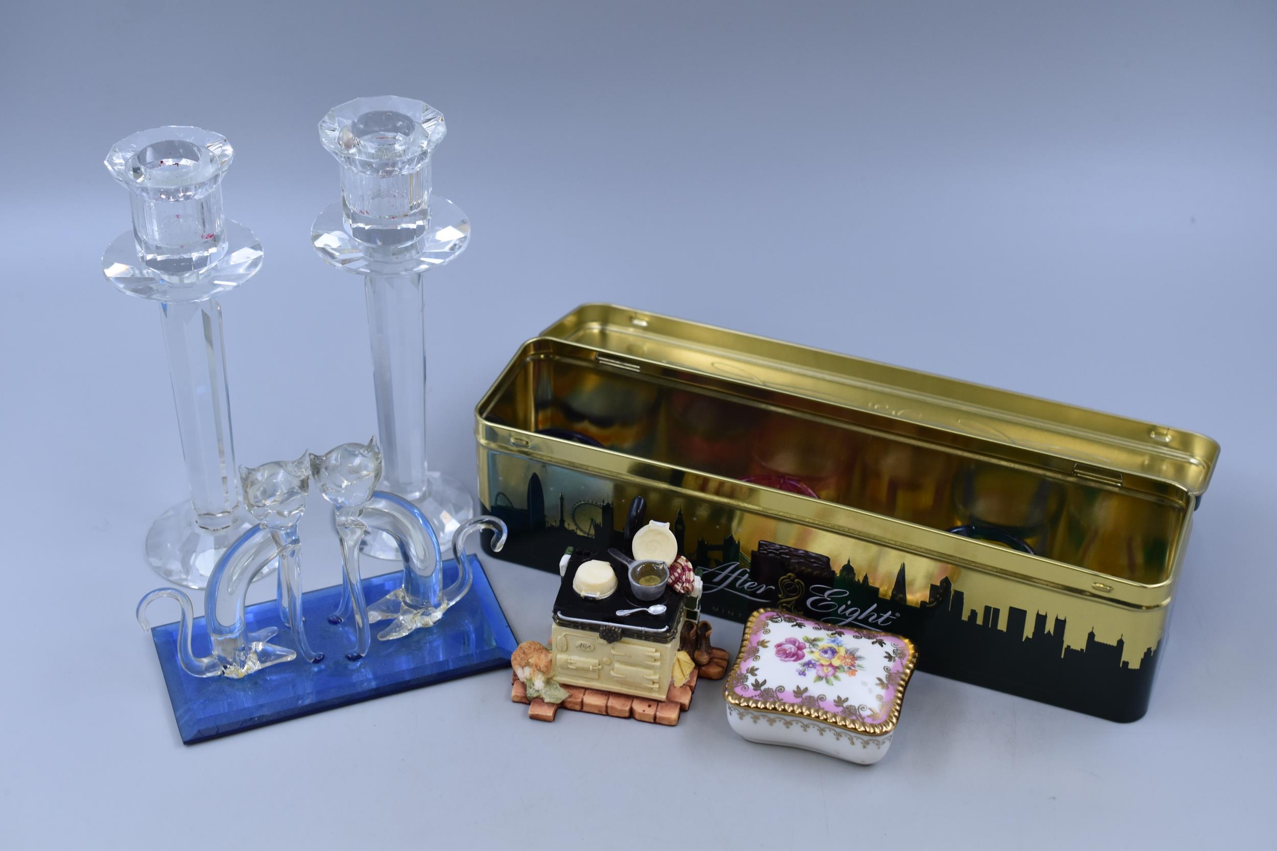 A mixed lot to include six tealight candle holders, two long crystal styled candleholders and more