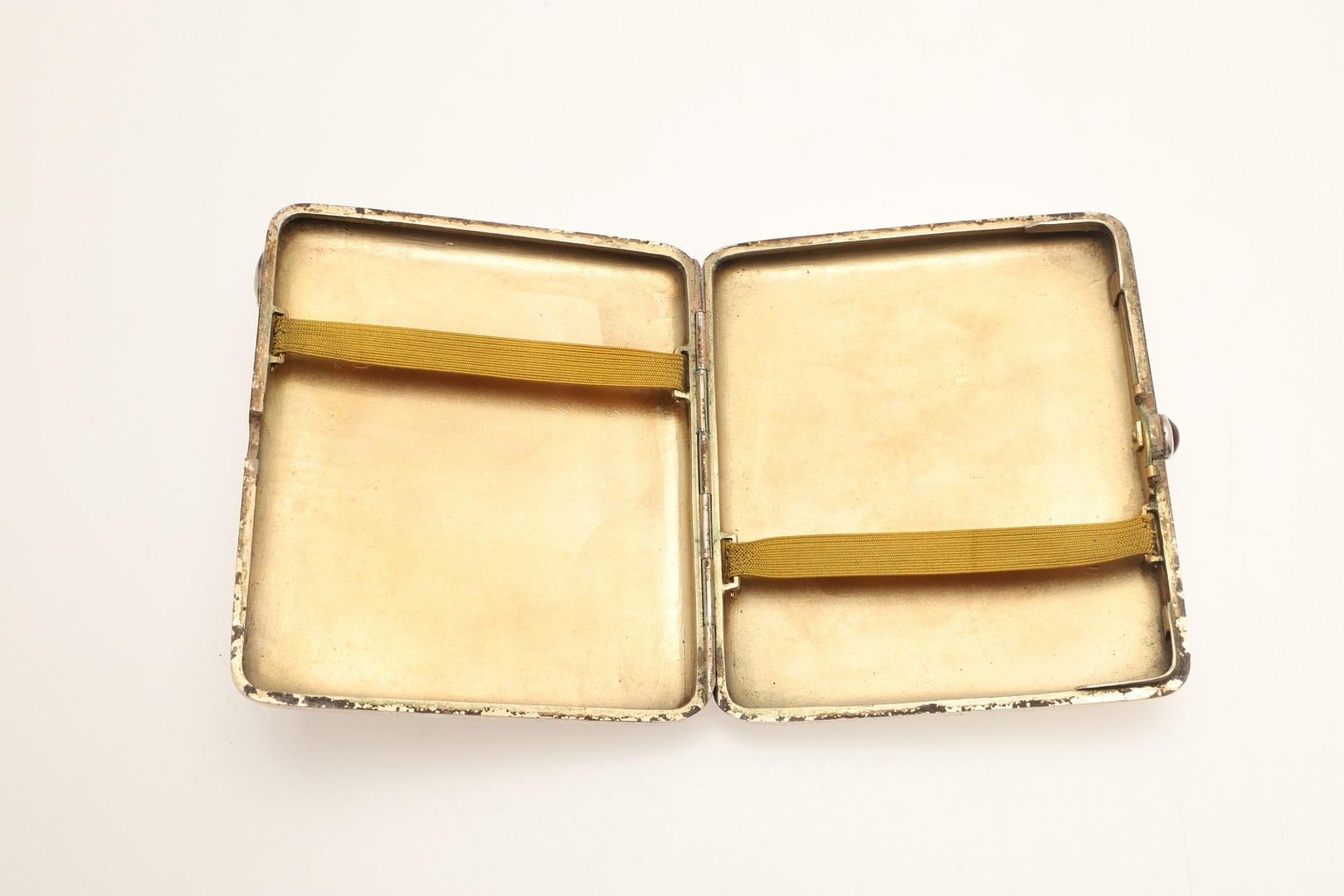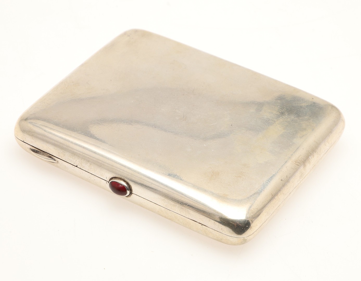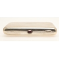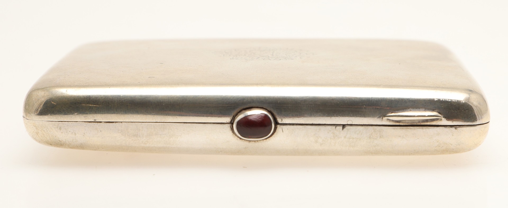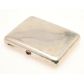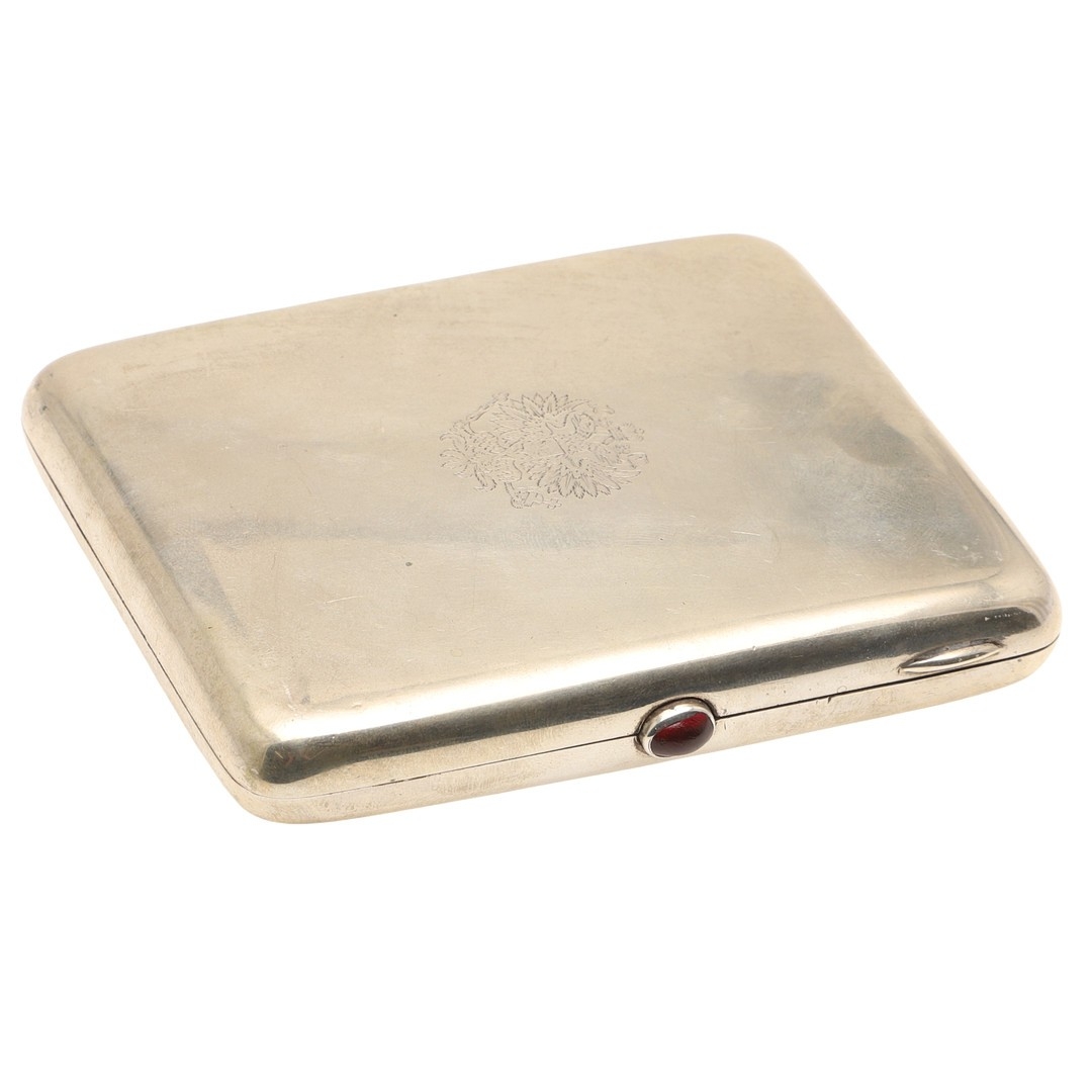 AN EARLY 20TH CENTURY RUSSIAN 84 ZOLOTNIK SILVER CIGARETTE CASE. Early 20th century, of rounded rectangular form, the lid engraved with the Imperial double-headed eagle, the hinged cover with cabochon red stone thumb piece opening to reveal a gilded interior, Each side with Soviet Russian 875 control mark.