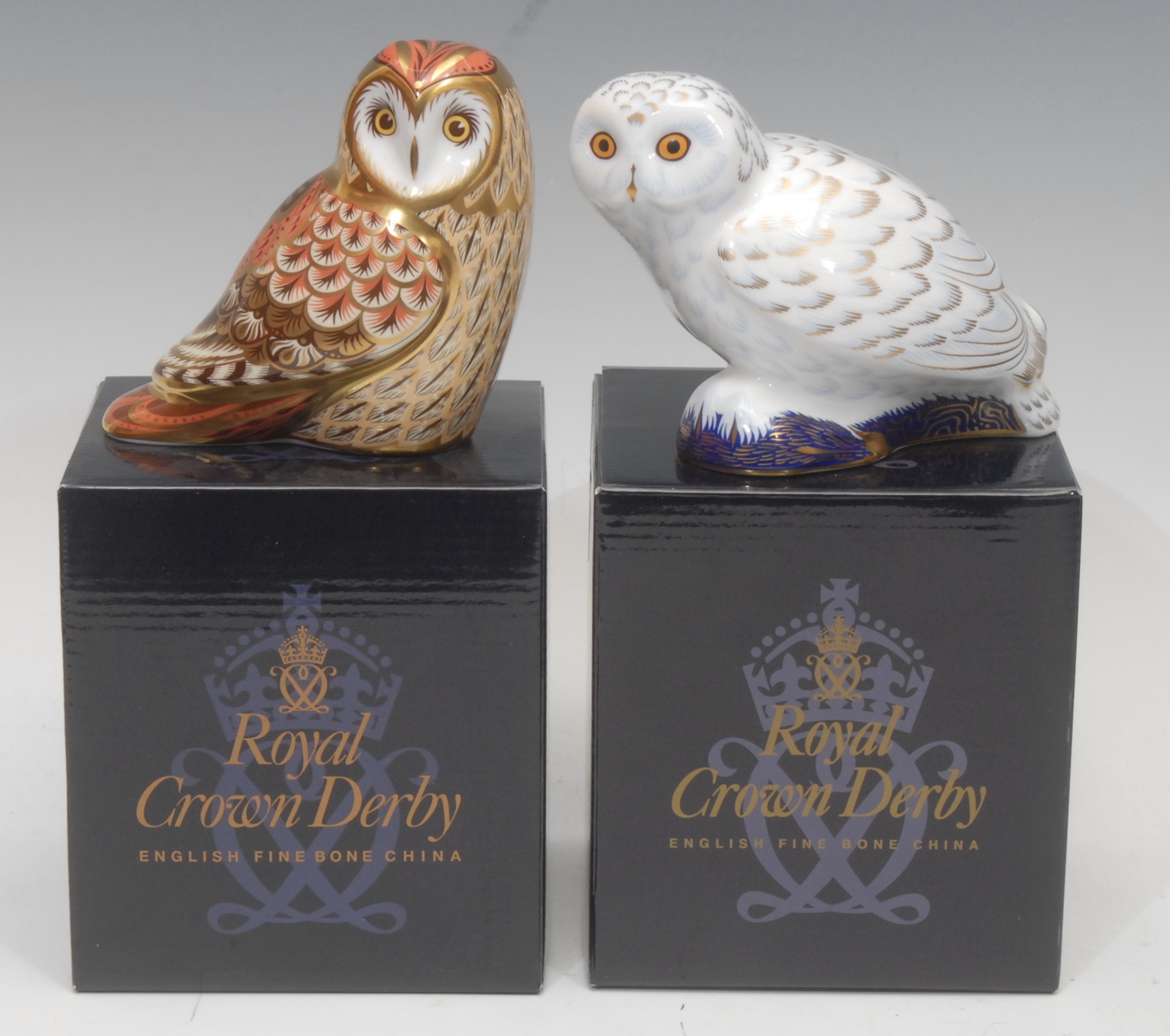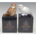 A Royal Crown Derby paperweight, Short Eared Owl, Collector's Guild exclusive, gold stopper, 10.5cm, printed mark in red, boxed; another, Snowy Owl, gold stopper, 10cm high, printed mark in red, boxed (2)