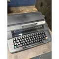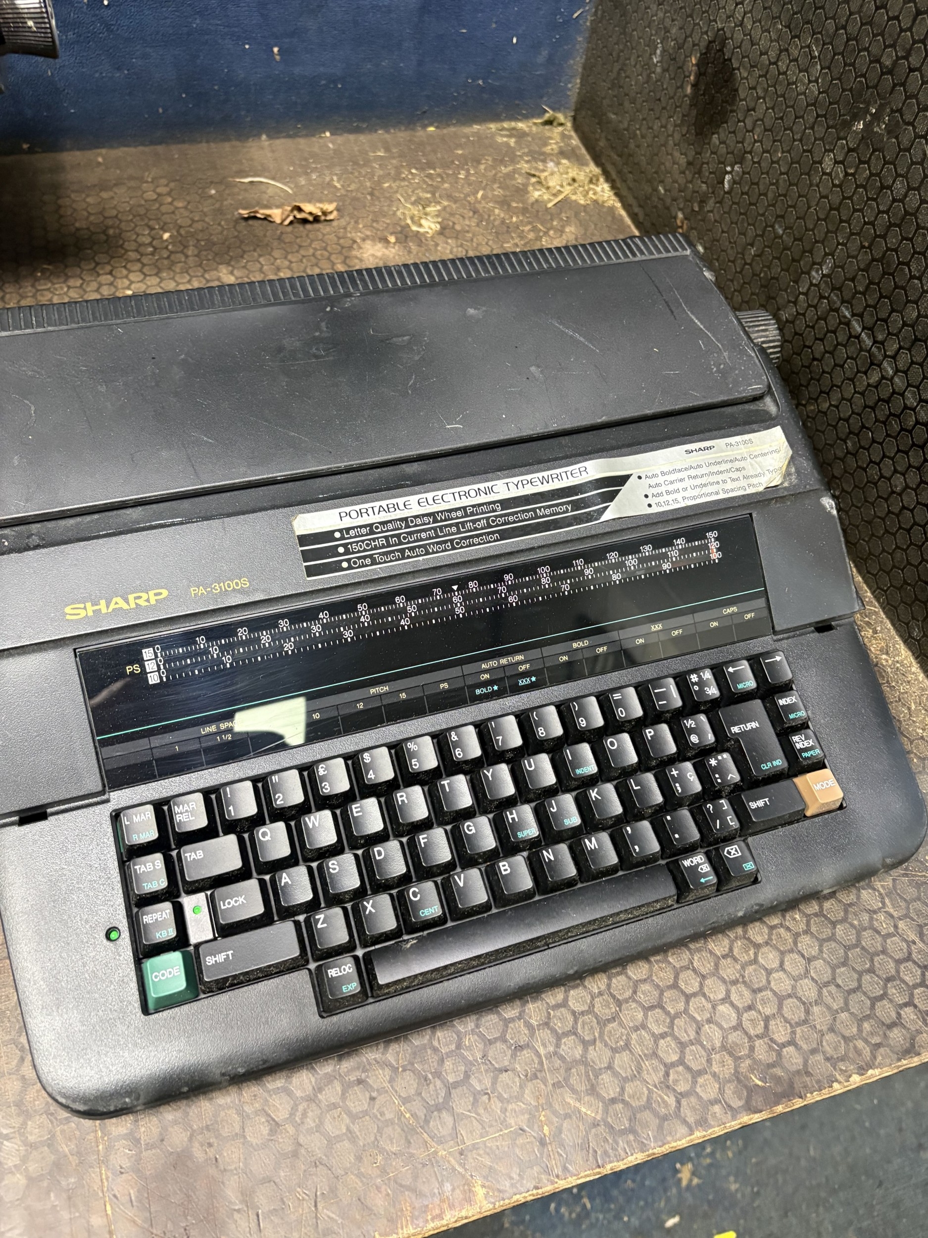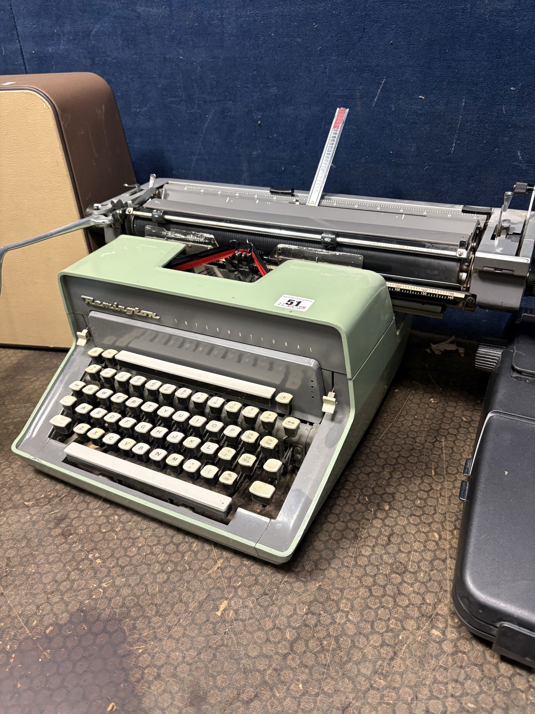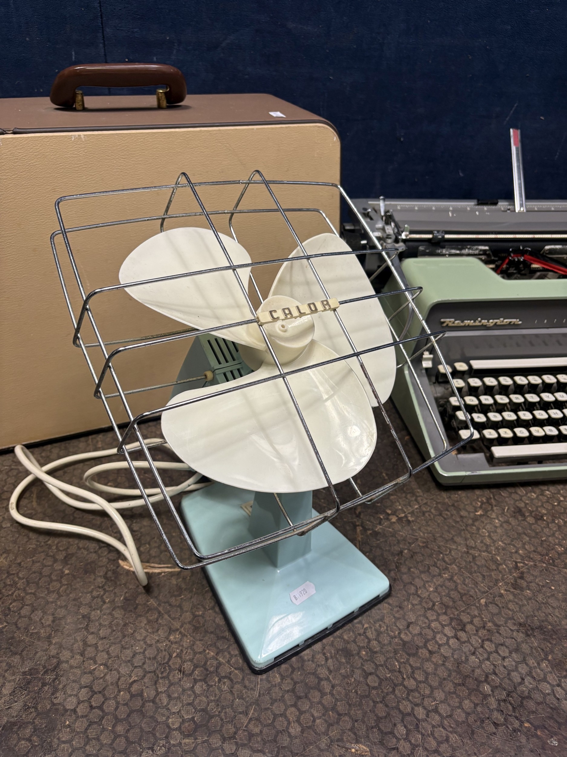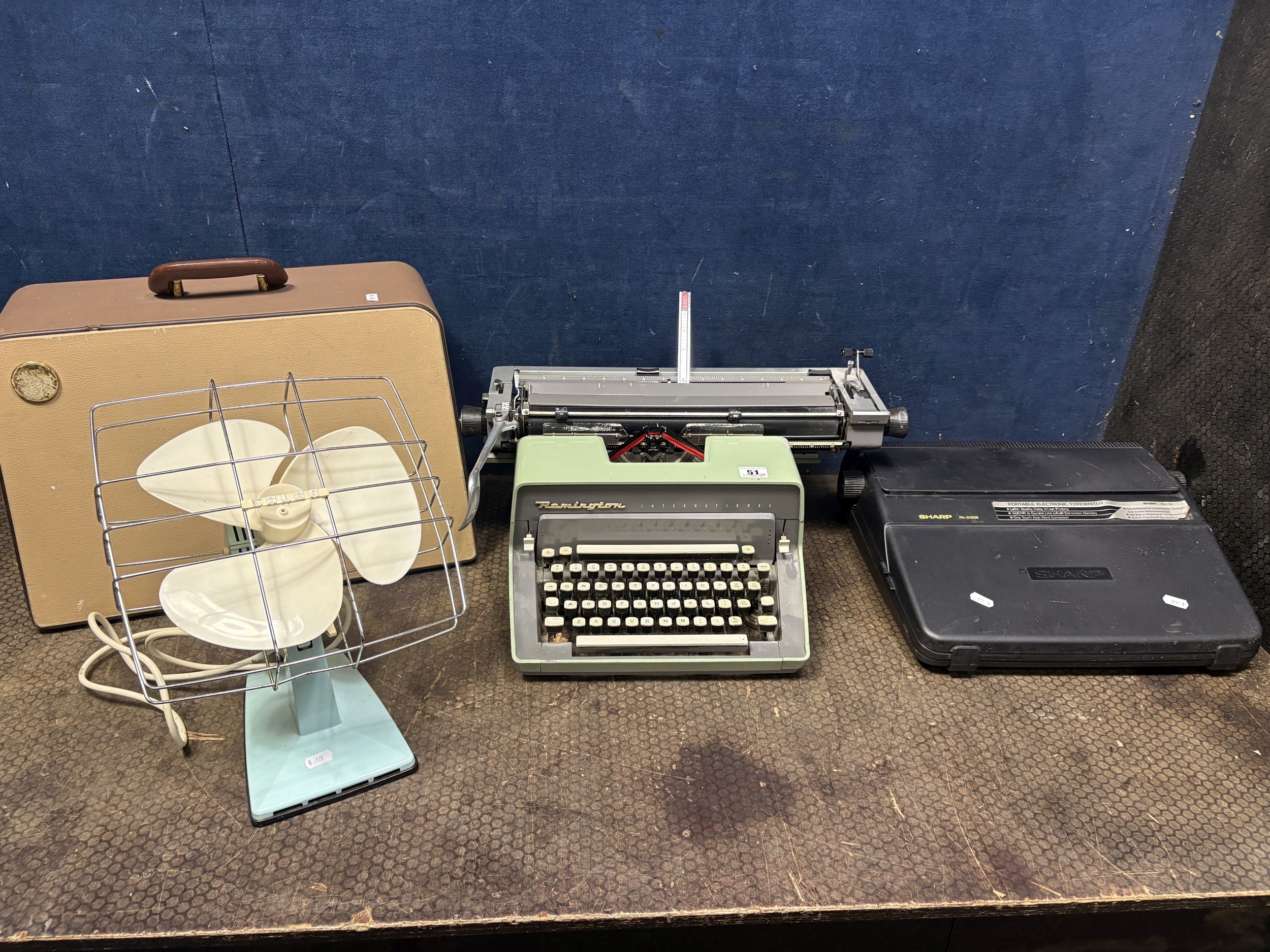 A REMINGTON INTERNATIONAL TYPEWRITER, a sharp PA-3100S electric typewriter, a vintage Calor table fan and a cased sewing machine, electric typewriter untested (4)