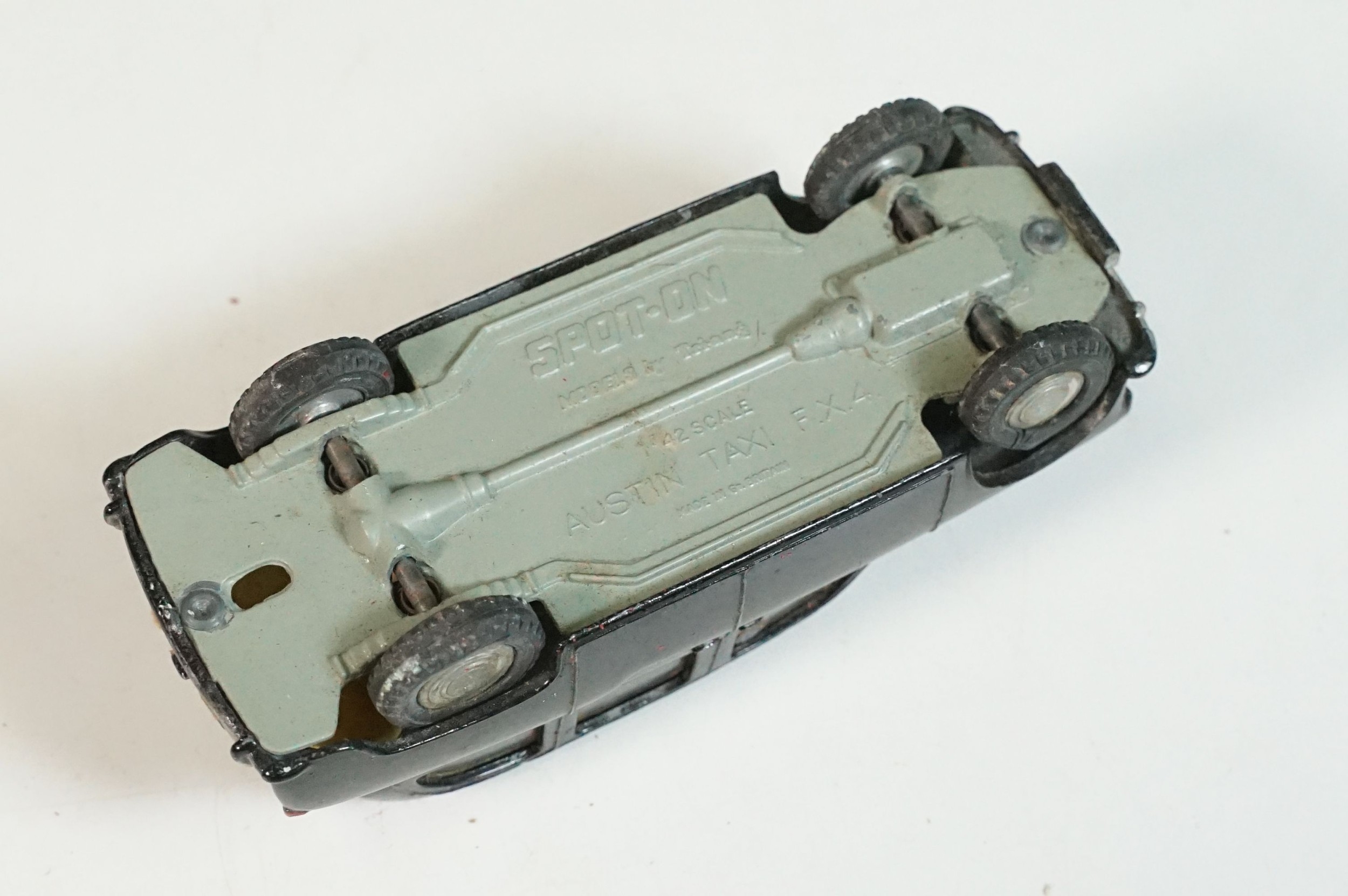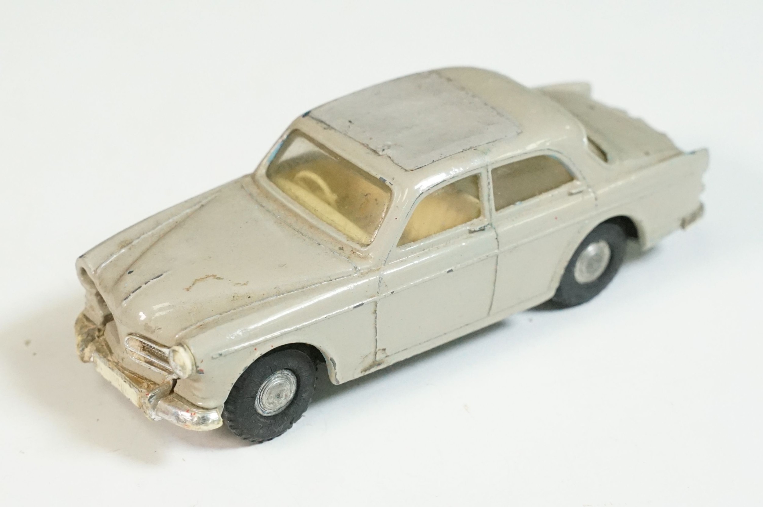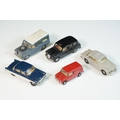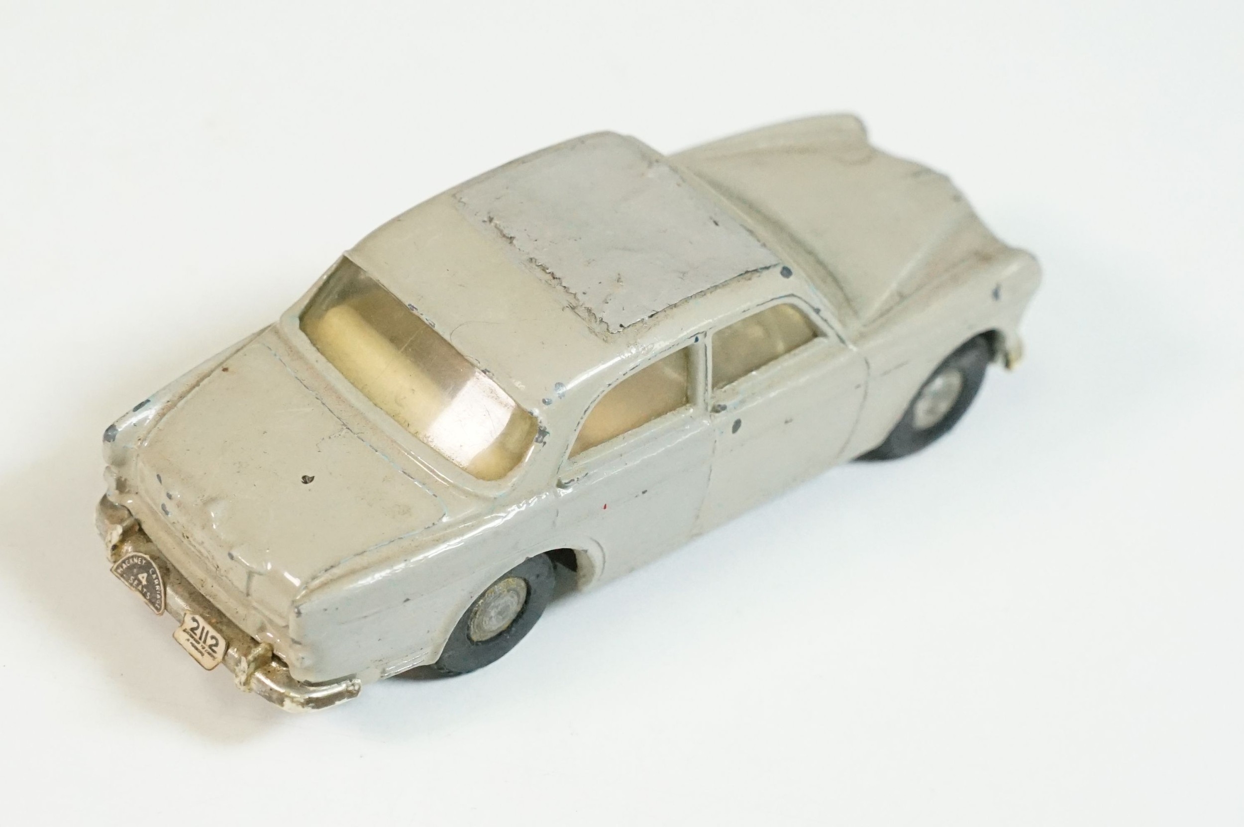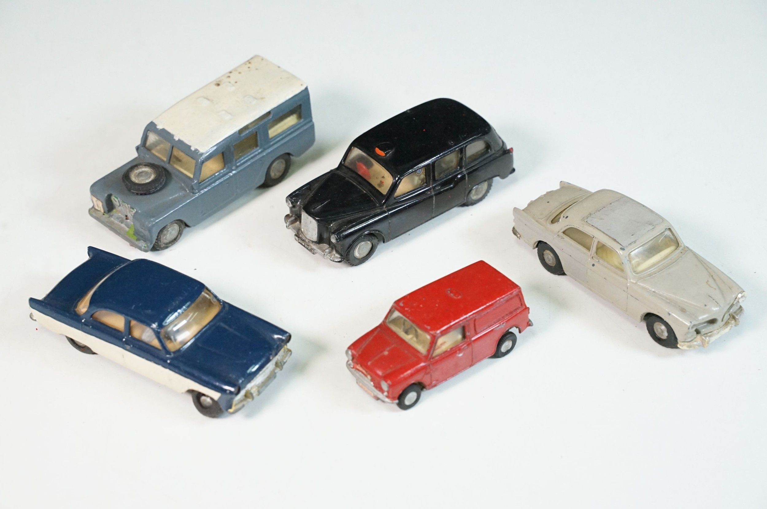 Five play worn Triang Spot On diecast models to include Zodiac, Morris Mini Van, LWB and Rover, Austin Taxi FX4 and Volvo 122, shows reconditioning and painting