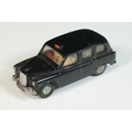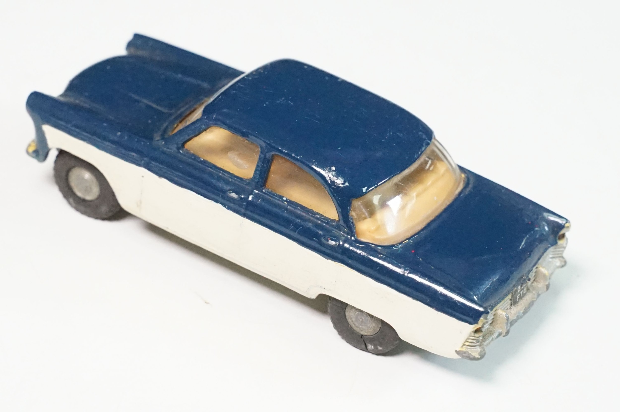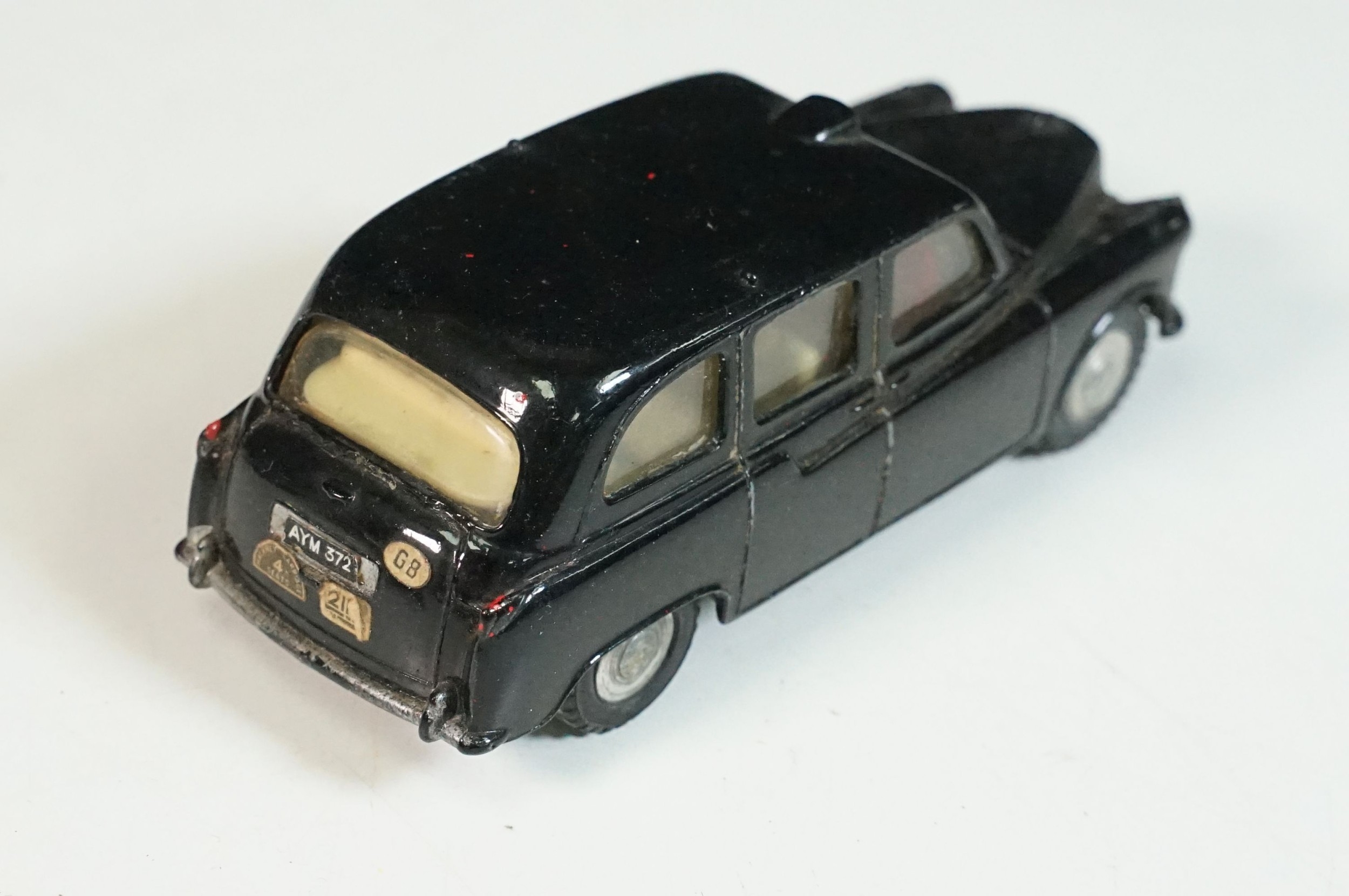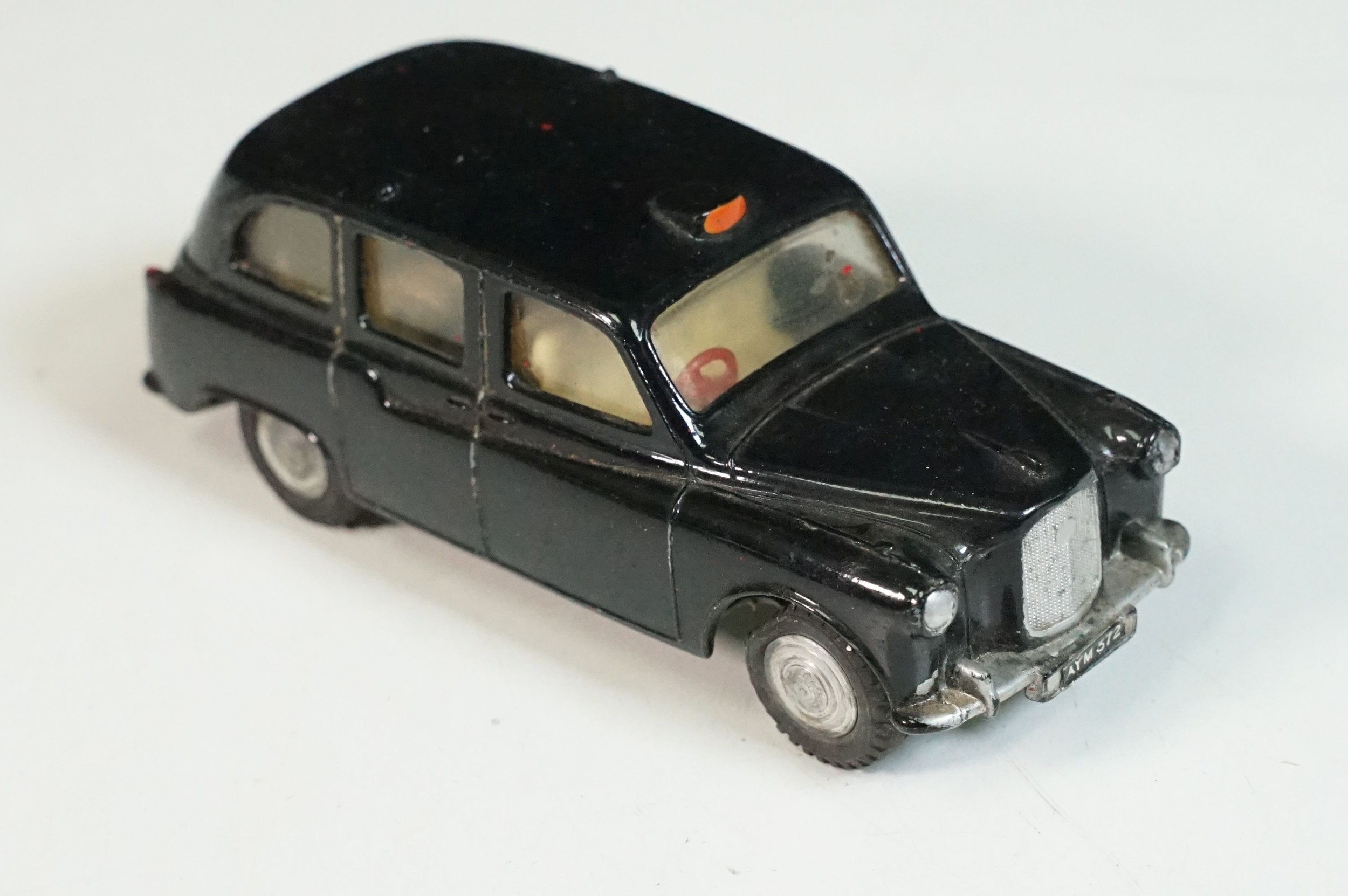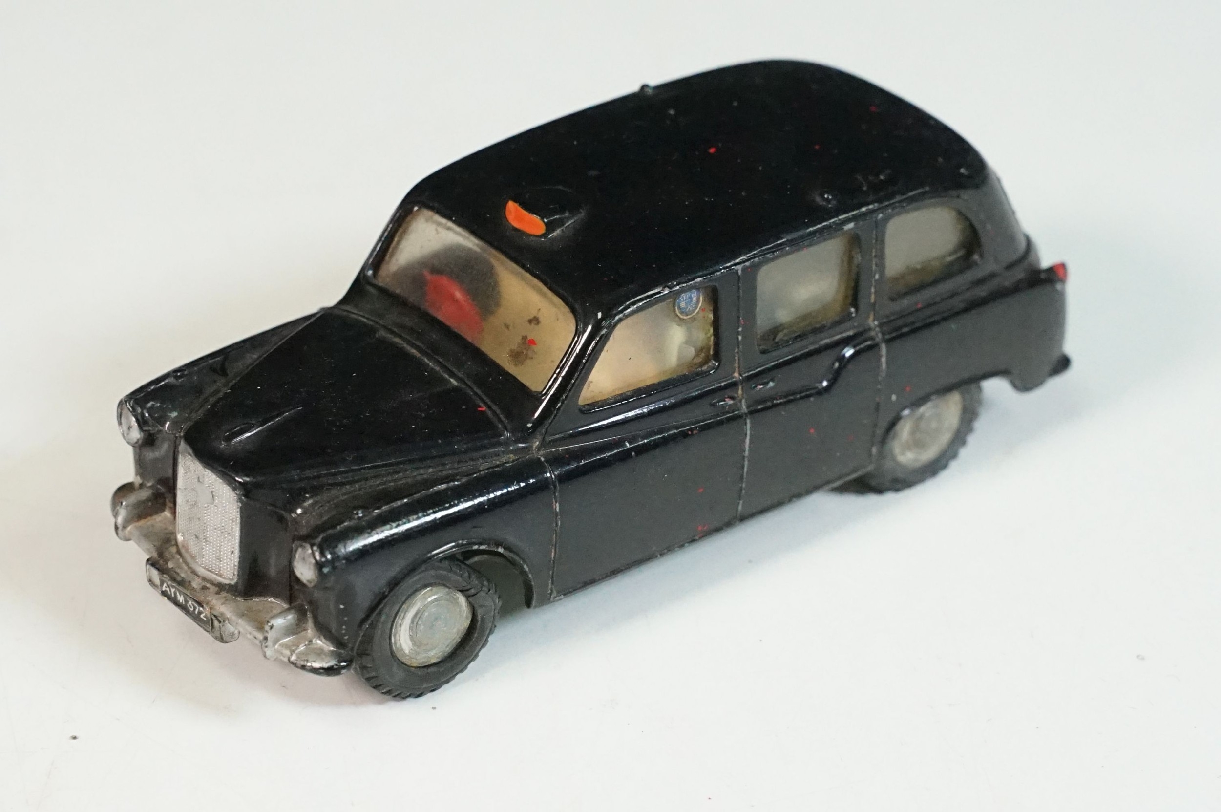 Five play worn Triang Spot On diecast models to include Zodiac, Morris Mini Van, LWB and Rover, Austin Taxi FX4 and Volvo 122, shows reconditioning and painting