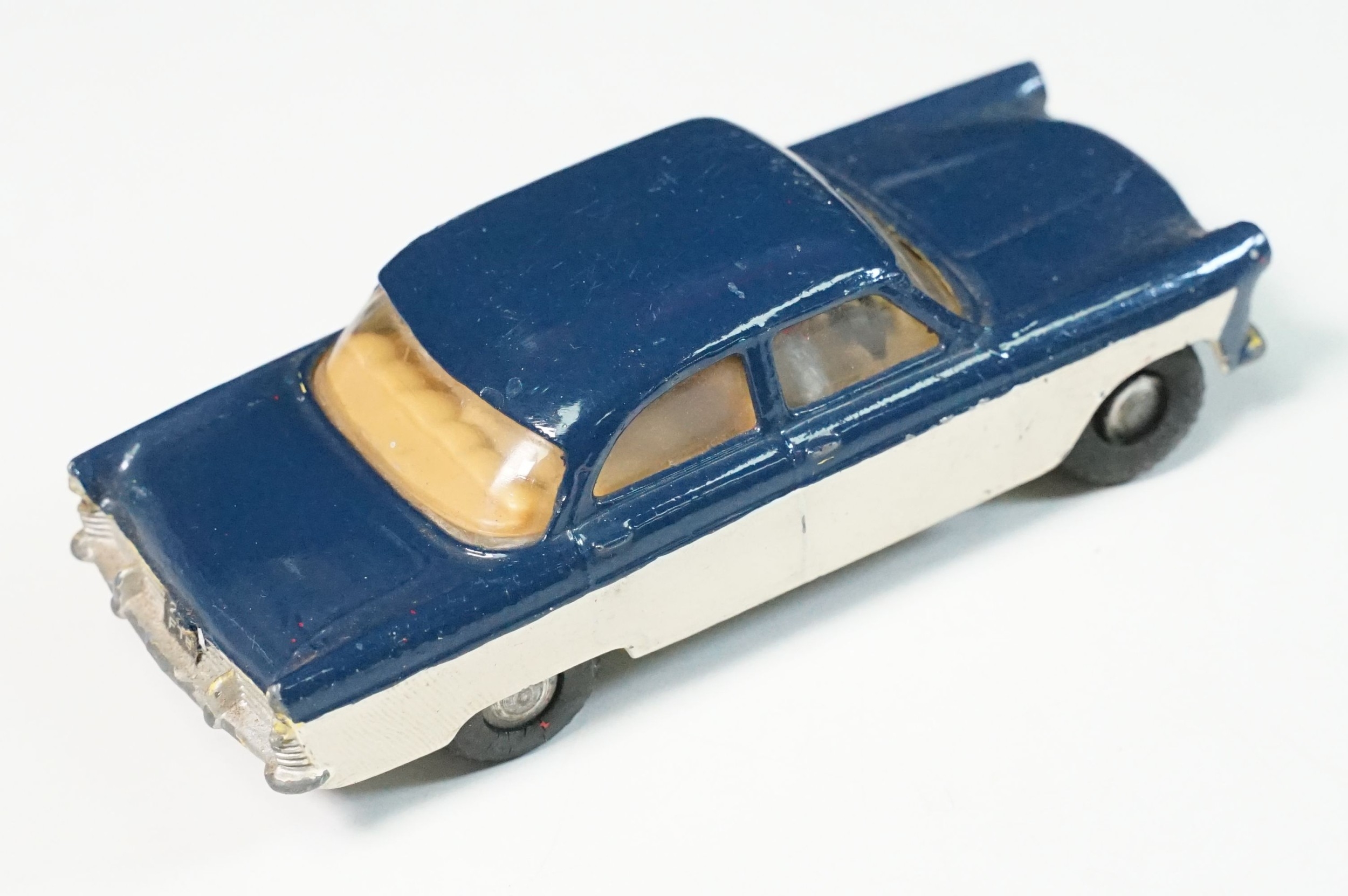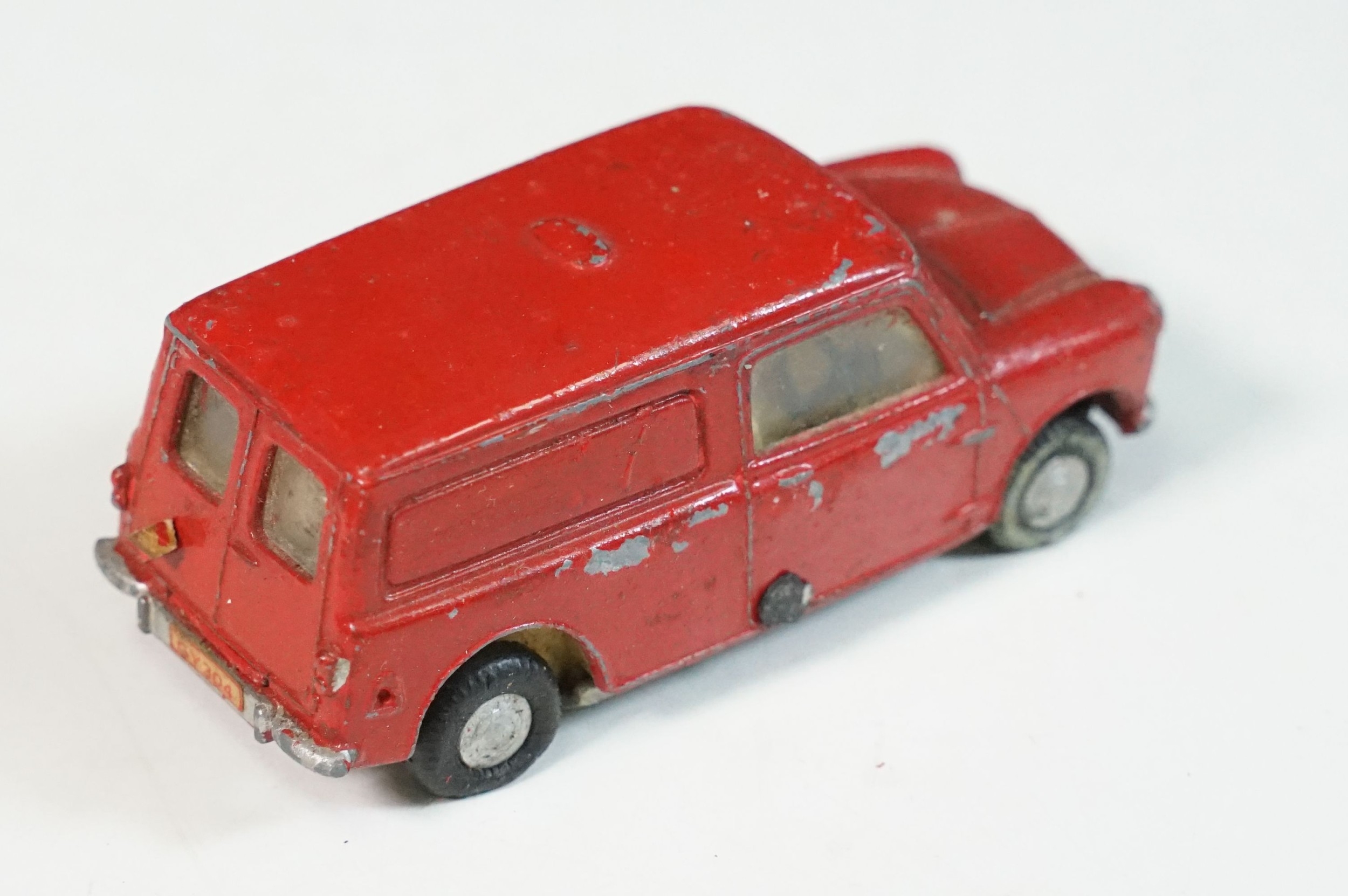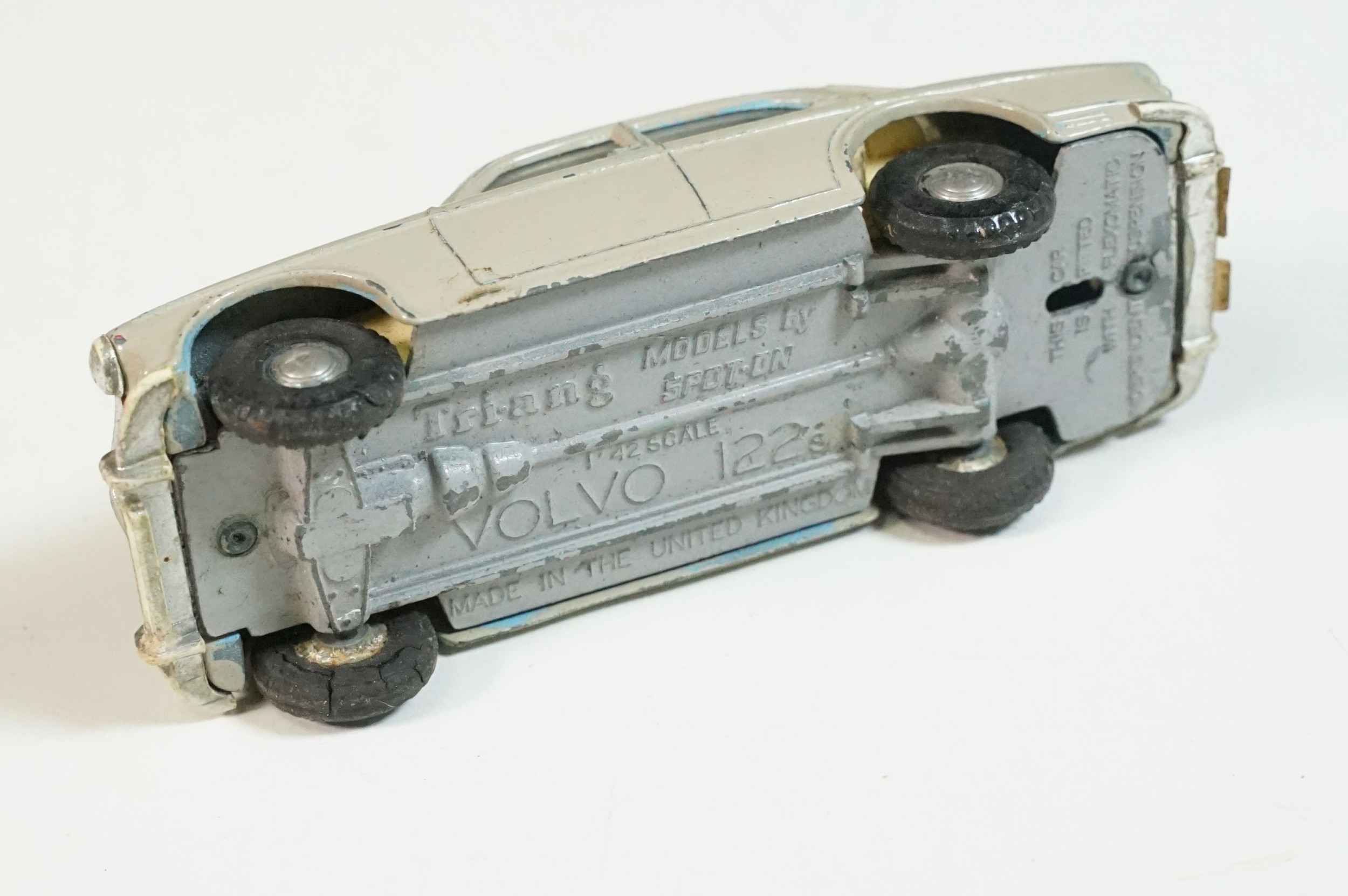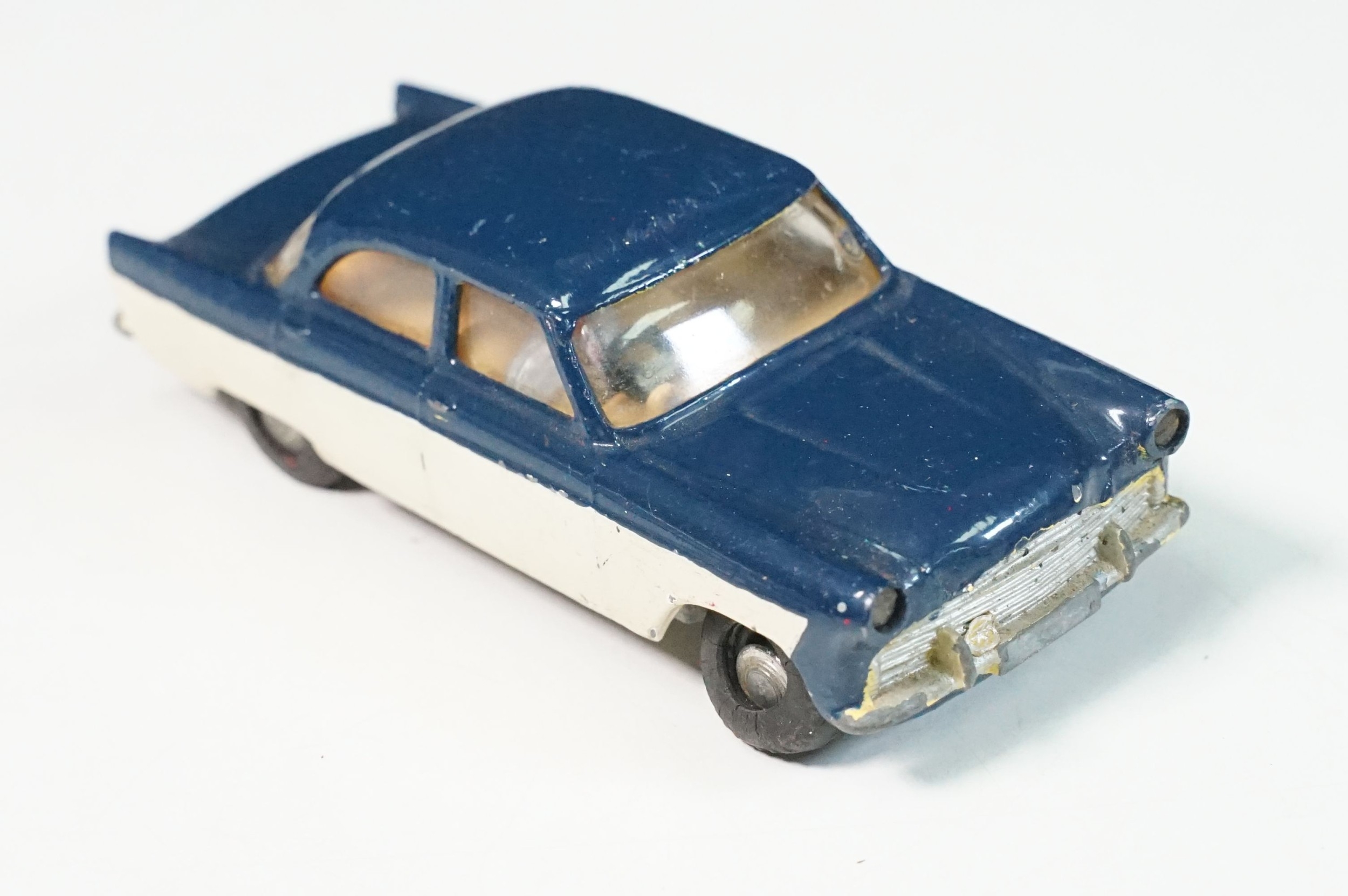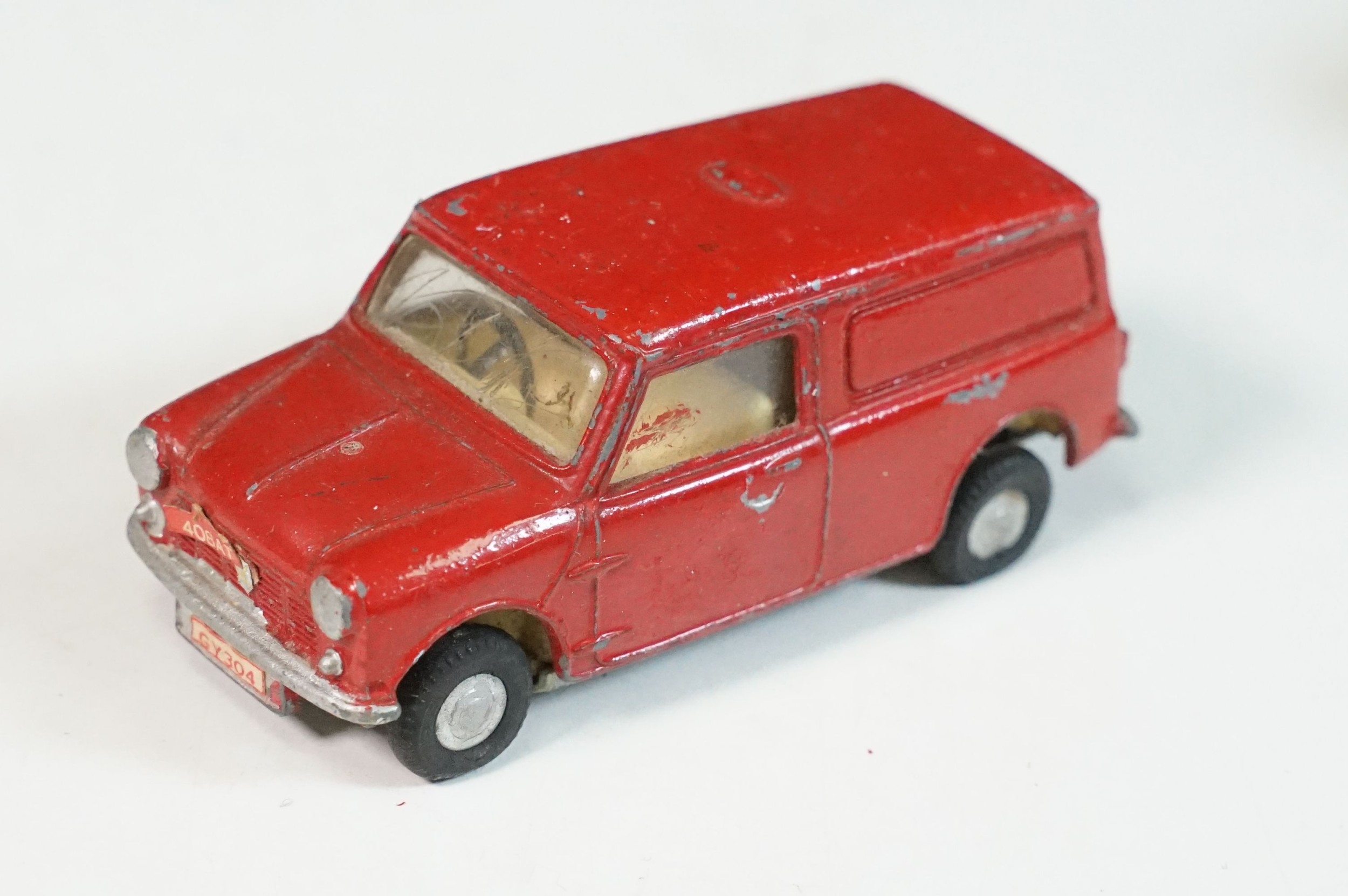Five play worn Triang Spot On diecast models to include Zodiac, Morris Mini Van, LWB and Rover, Austin Taxi FX4 and Volvo 122, shows reconditioning and painting