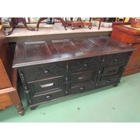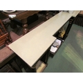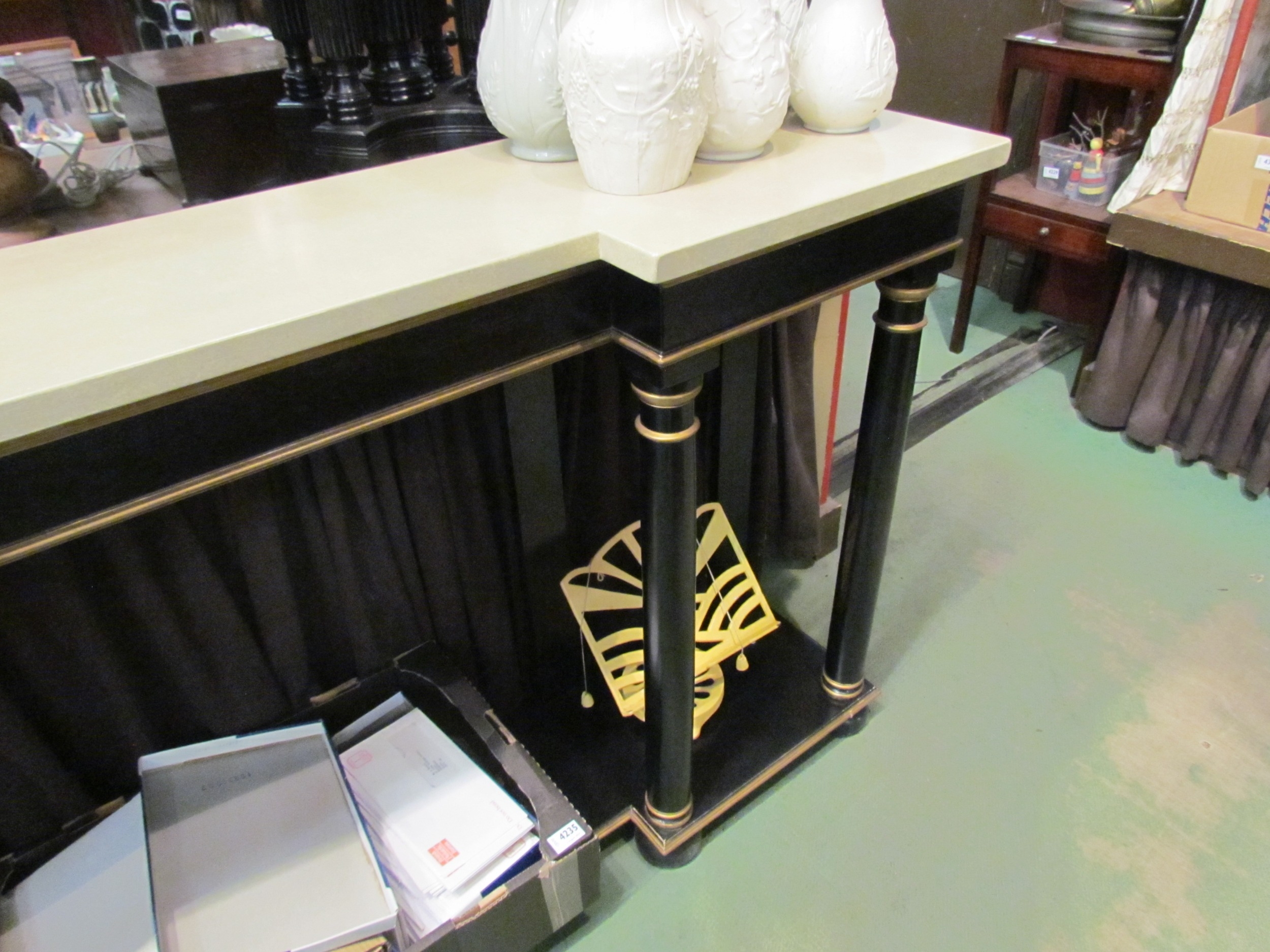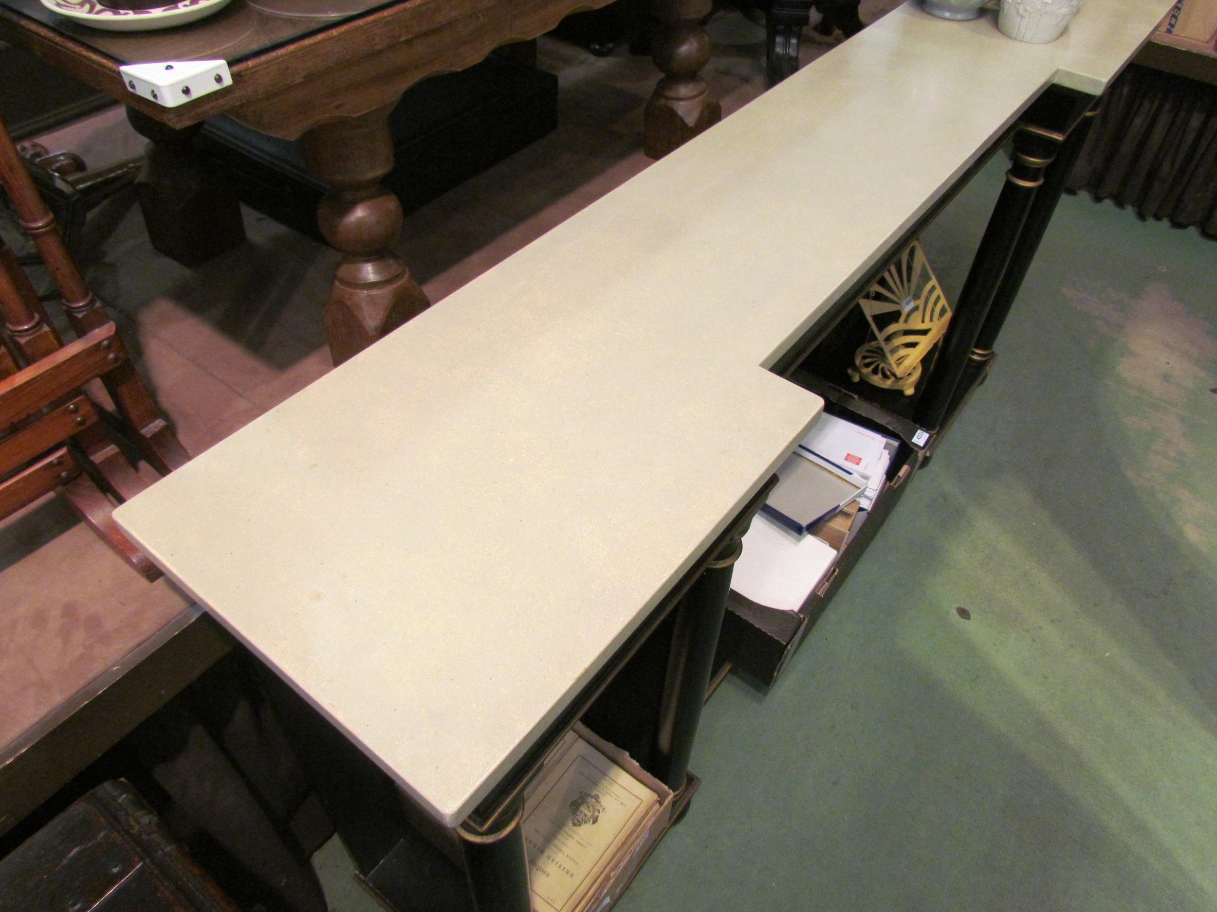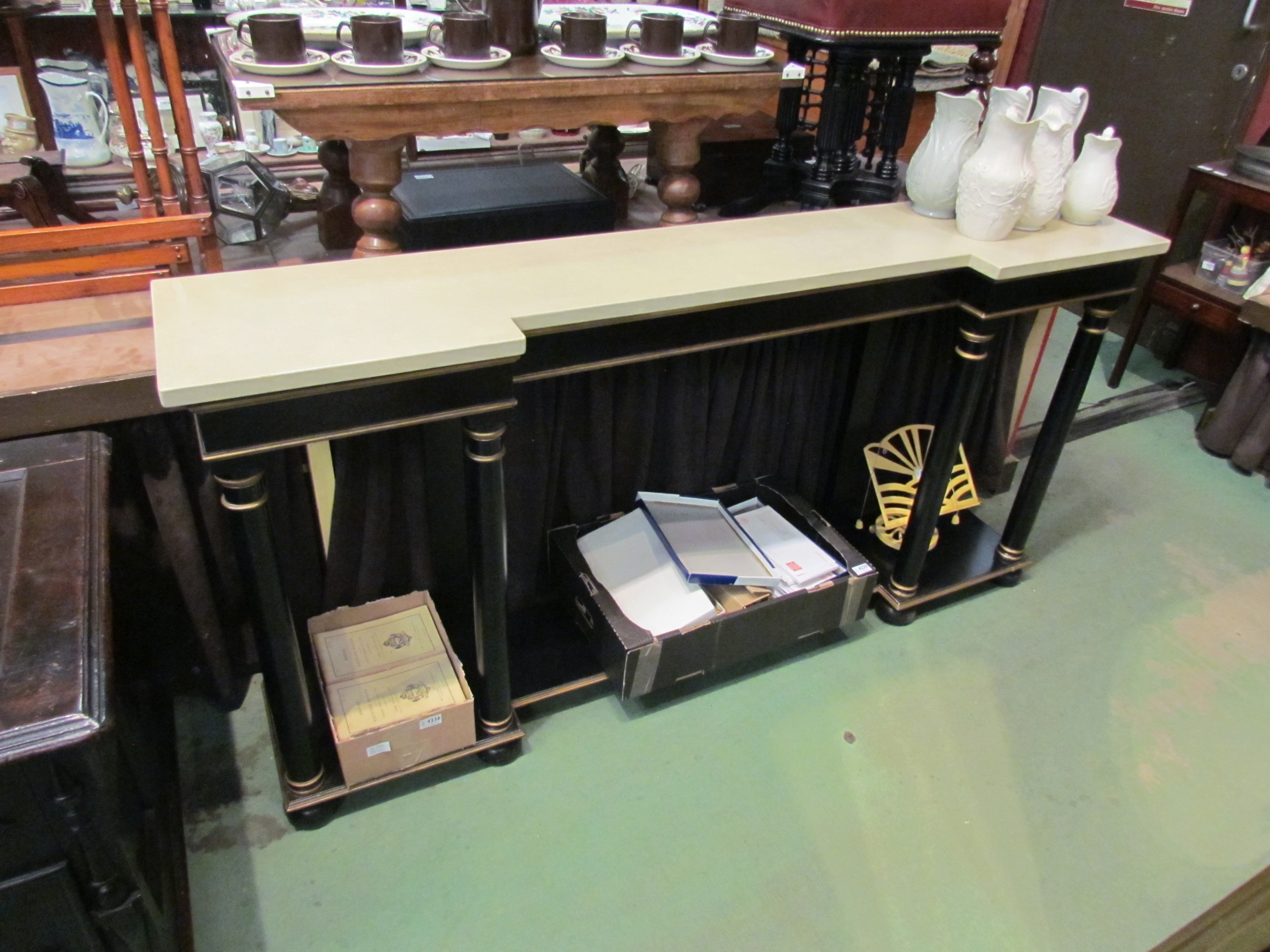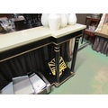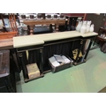 An Empire style ebonised and gilded breakfront console table, the marble style top over turned pillar base to an under-tier, 90cm tall x 178cm wide x 35cm deep