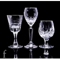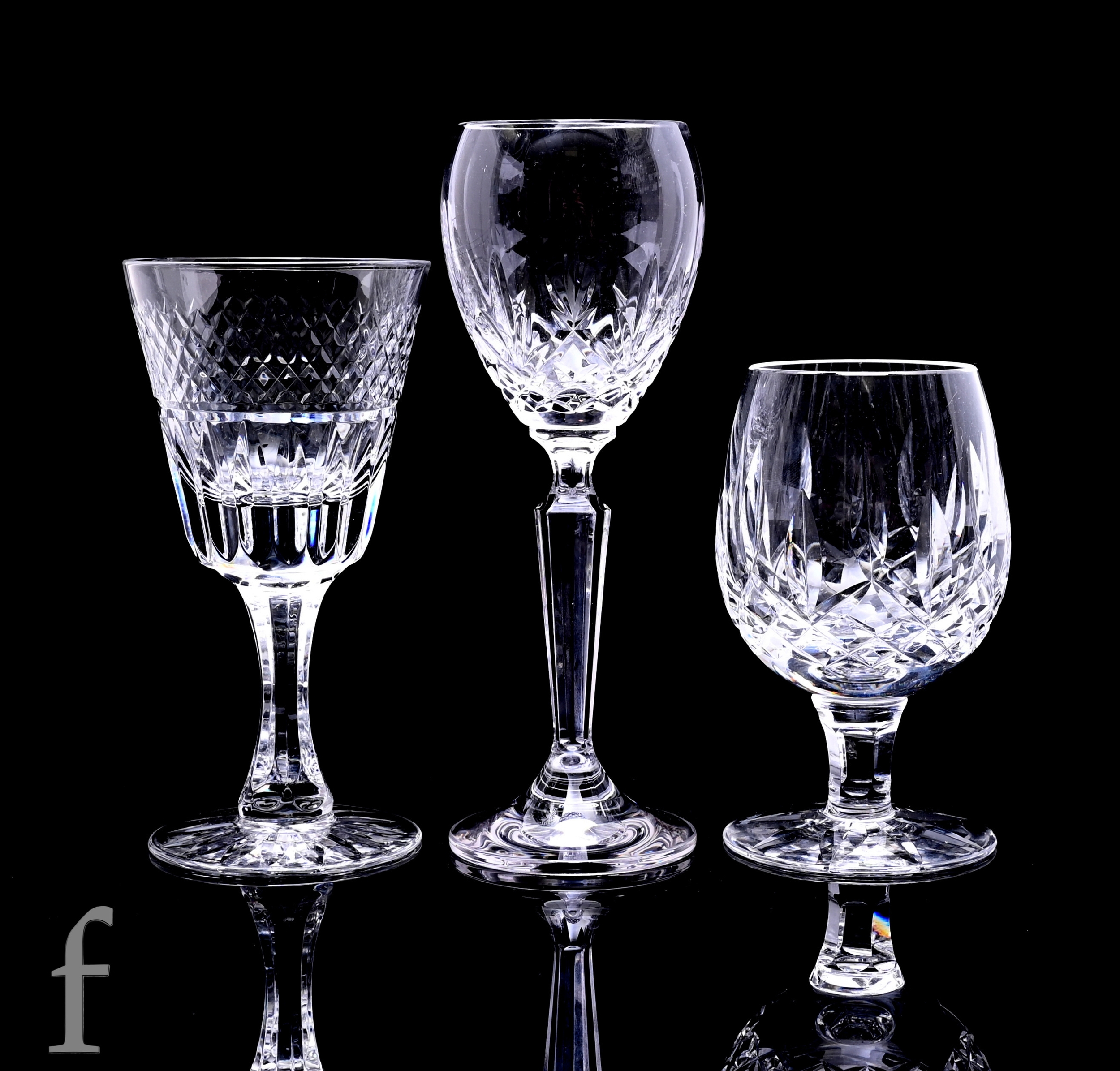 A set of three Waterford Crystal 'Nocturne' port/sherry glasses, tulip shaped bowls with mitre cut foliate sprigs above star cut band, on tapered facet stem and circular foot, height 17cm, a similar wine glass, four small brandy balloons and a set of three Royal Brierley 'Stratford' white wine glasses. (11)
