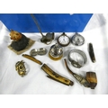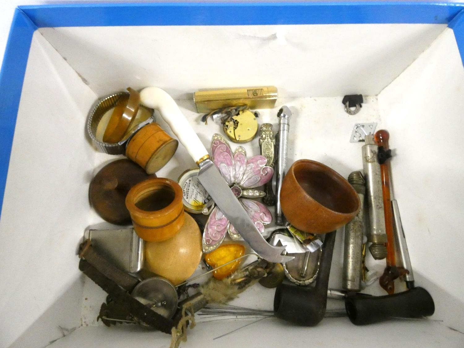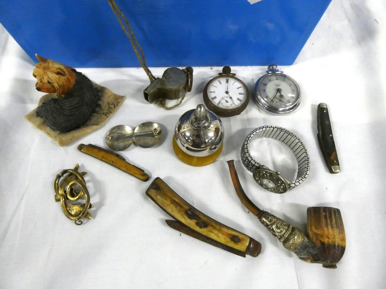Small box of vintage curious to include pocket watches, penknife, lighters etc.