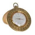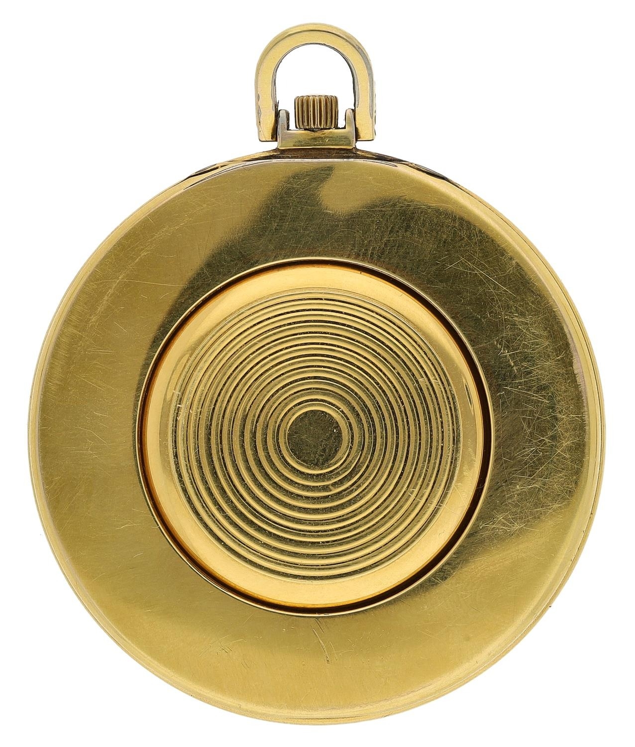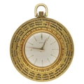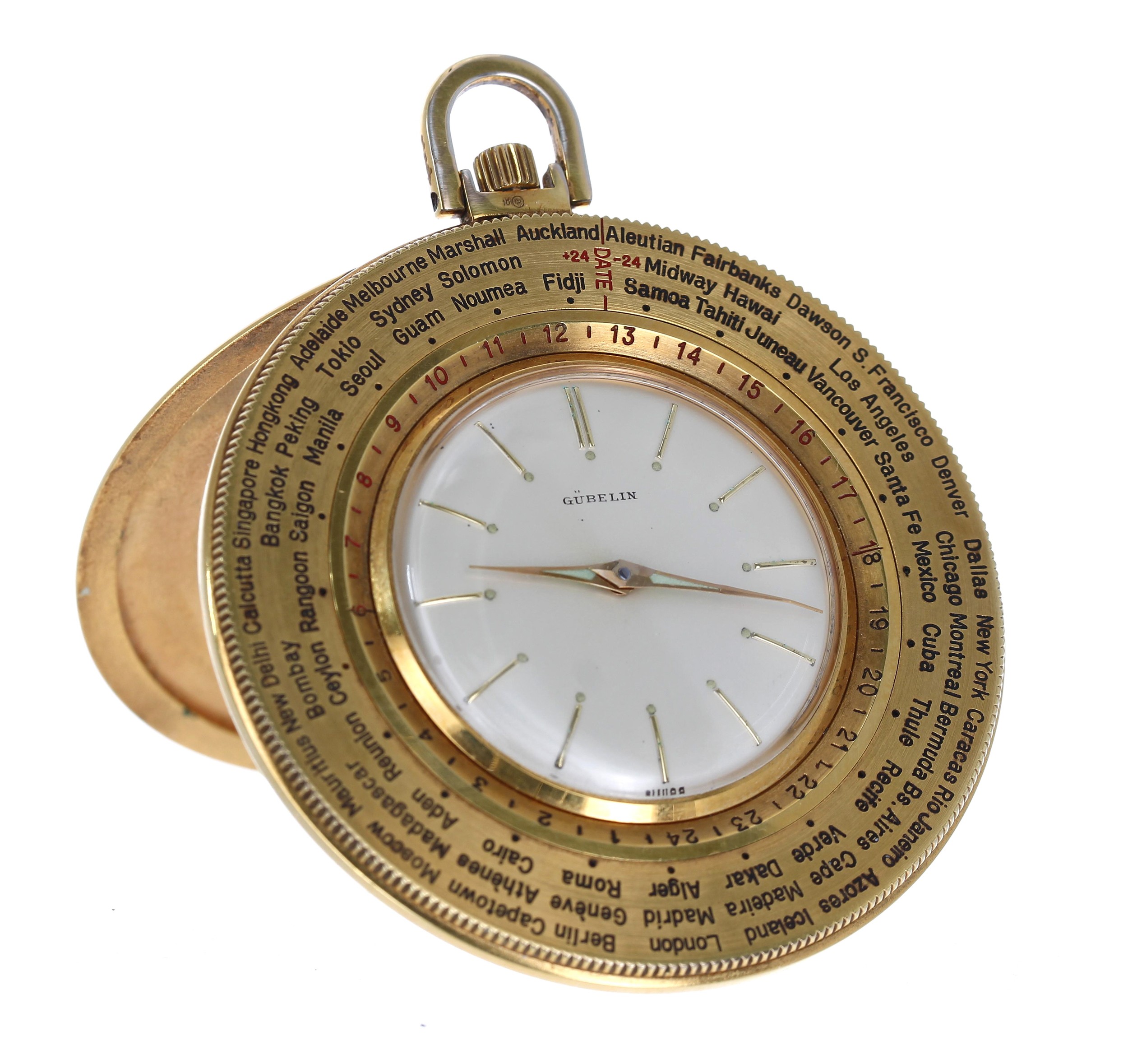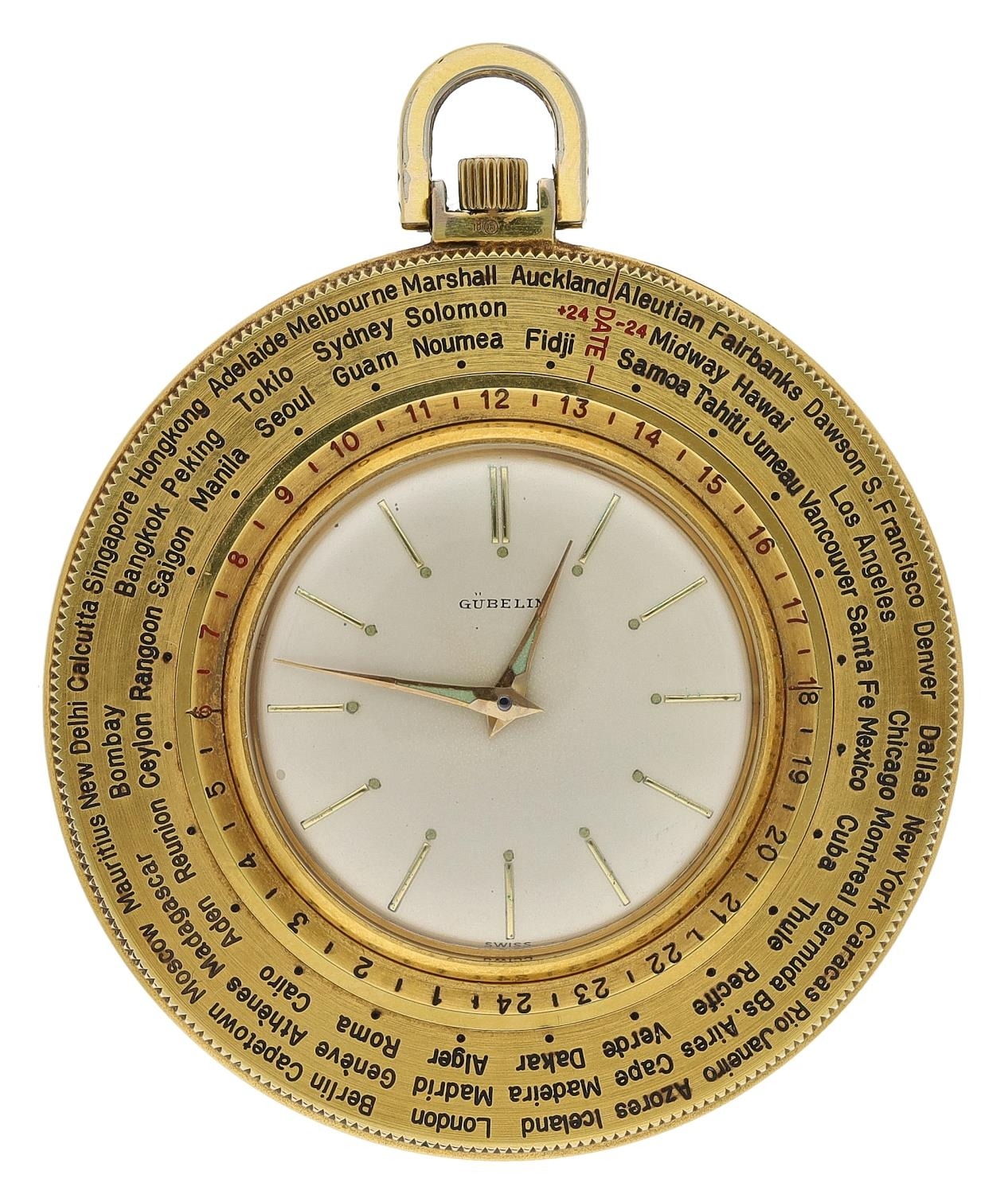 Gubelin gold plated pocket watch timepiece with world time indication, circa 1960, signed circular silvered dial with applied gilt baton markers, bi-rotational cities of the world bezel, with inner fixed 24-hour chapter, 17 jewel Cal.330 manual wind manual movement, the case with centre snap-on back and hinged stand surround, 52mm