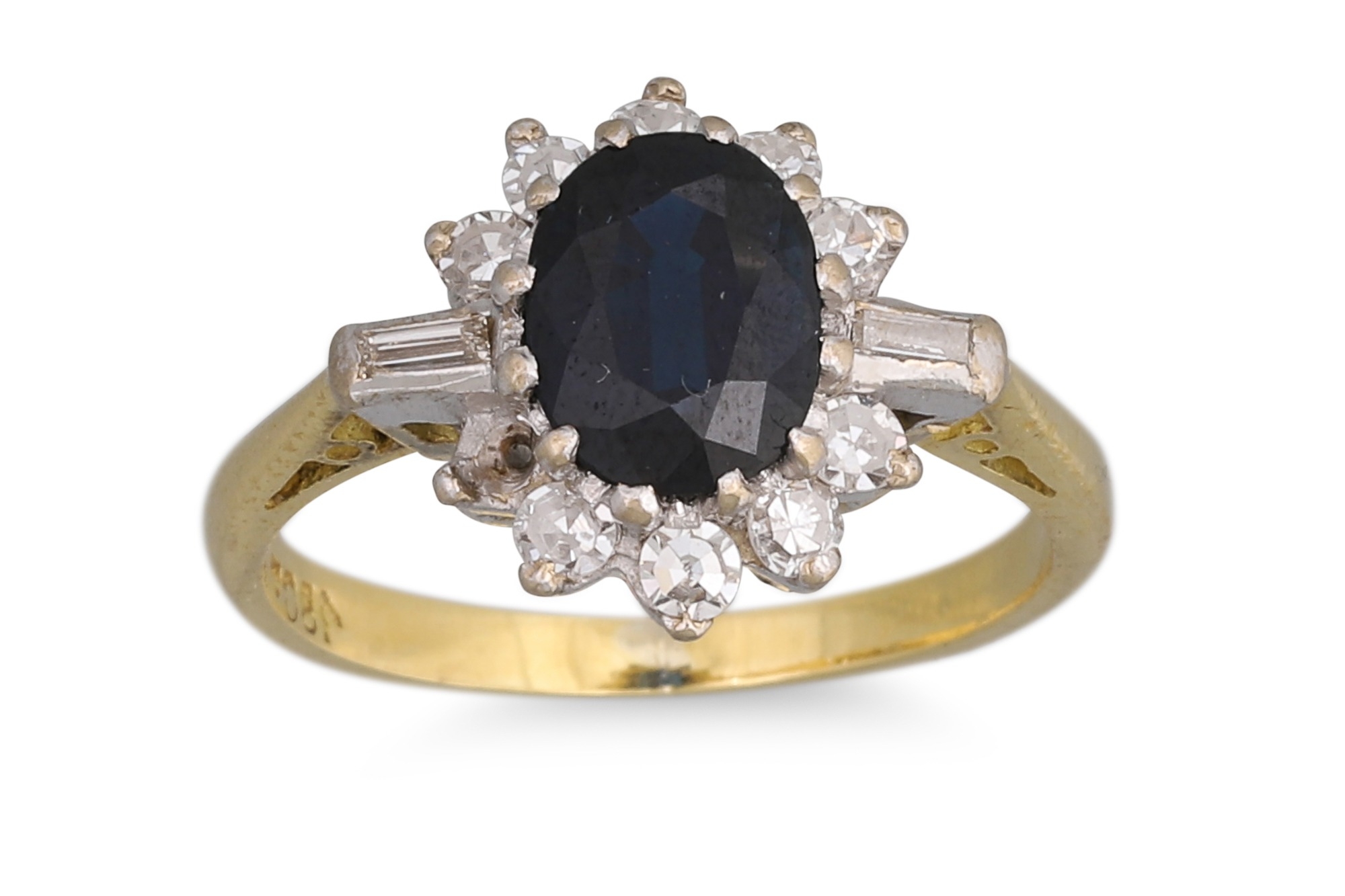 A SAPPHIRE AND DIAMOND CLUSTER RING, the oval sapphire to diamond surround, mounted in 18ct yellow gold. Estimated: weight of sapphire: 1.32 ct, diamonds: 0.38, size I