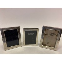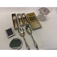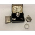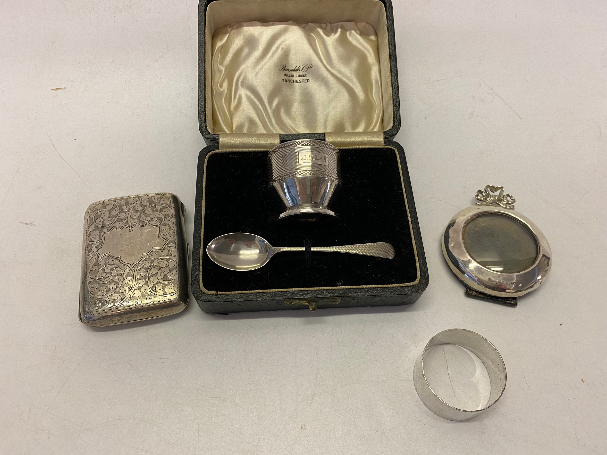 A silver cigarette case, a silver napkin ring, a miniature circular photograph frame with silver front and a silver egg cup and spoon, boxed