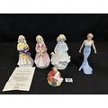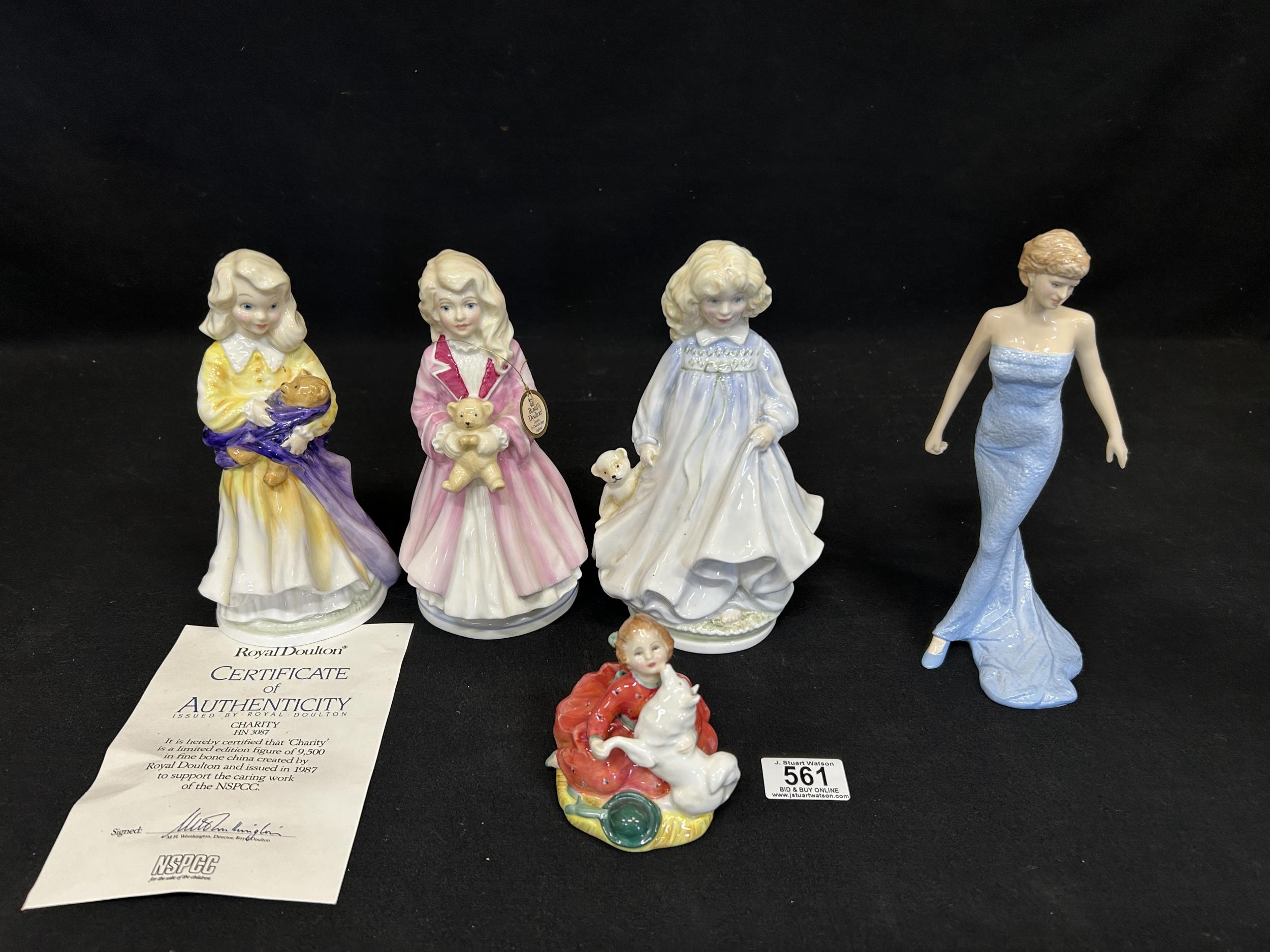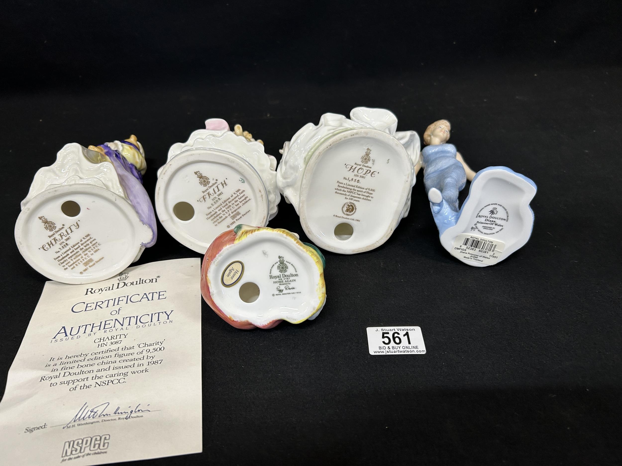 Royal Doulton: Set of 3 Faith, Hope and Charity, height 22cms, Diana Princess of Wales and Home Again figures, no damage