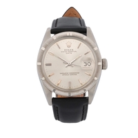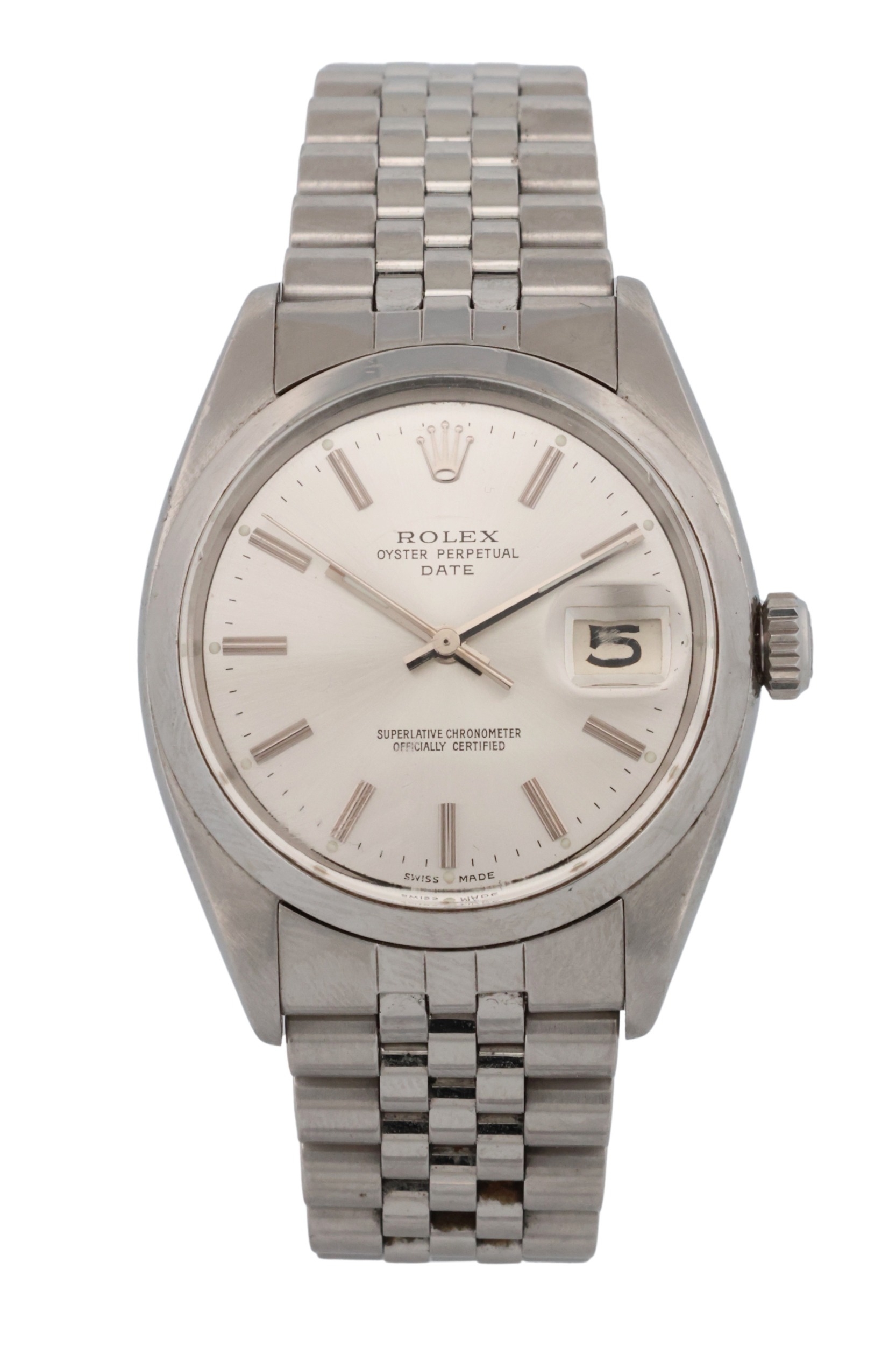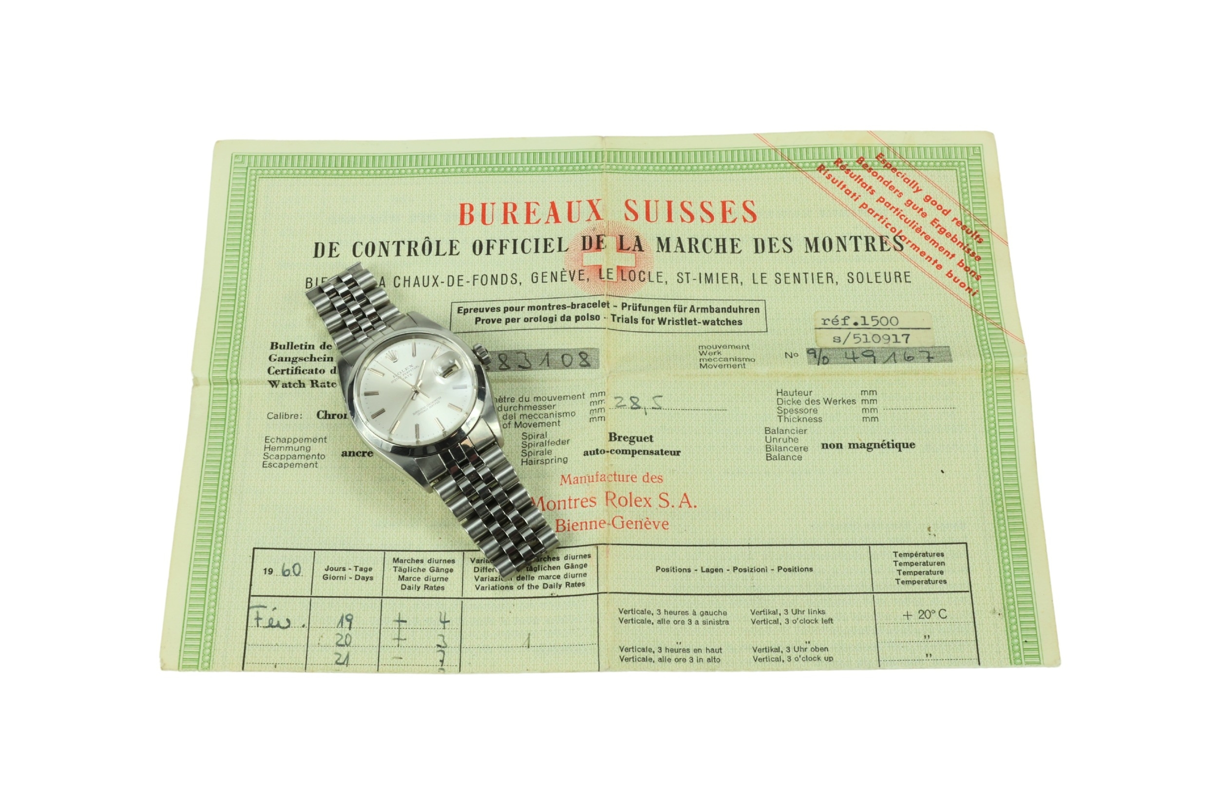 Rolex Oyster Perpetual Date, stainless steel, ref. 1500, circa 1956. The silvered dial with baton markers, date aperture, steel hands. Rolex automatic cal.1560 movement, signed 62510H Jubilee bracelet, 34mm case, complete with chronometer certificate, working when catalogued